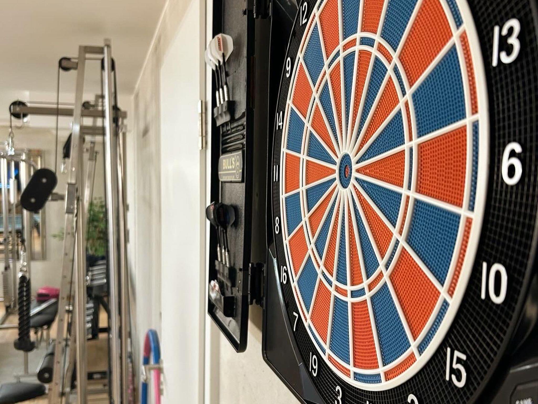 Unser geräumiger Fitnessraum bietet auf mehr als 40 qm Kraft- und Cardiogeräte in Studioqualität, eine Turnier-Tischtennisplatte – NEU die Ballmaschine- die auf Wunsch aufgebaut werden kann sowie einen 65 Zoll Flat-TV, Dartscheibe