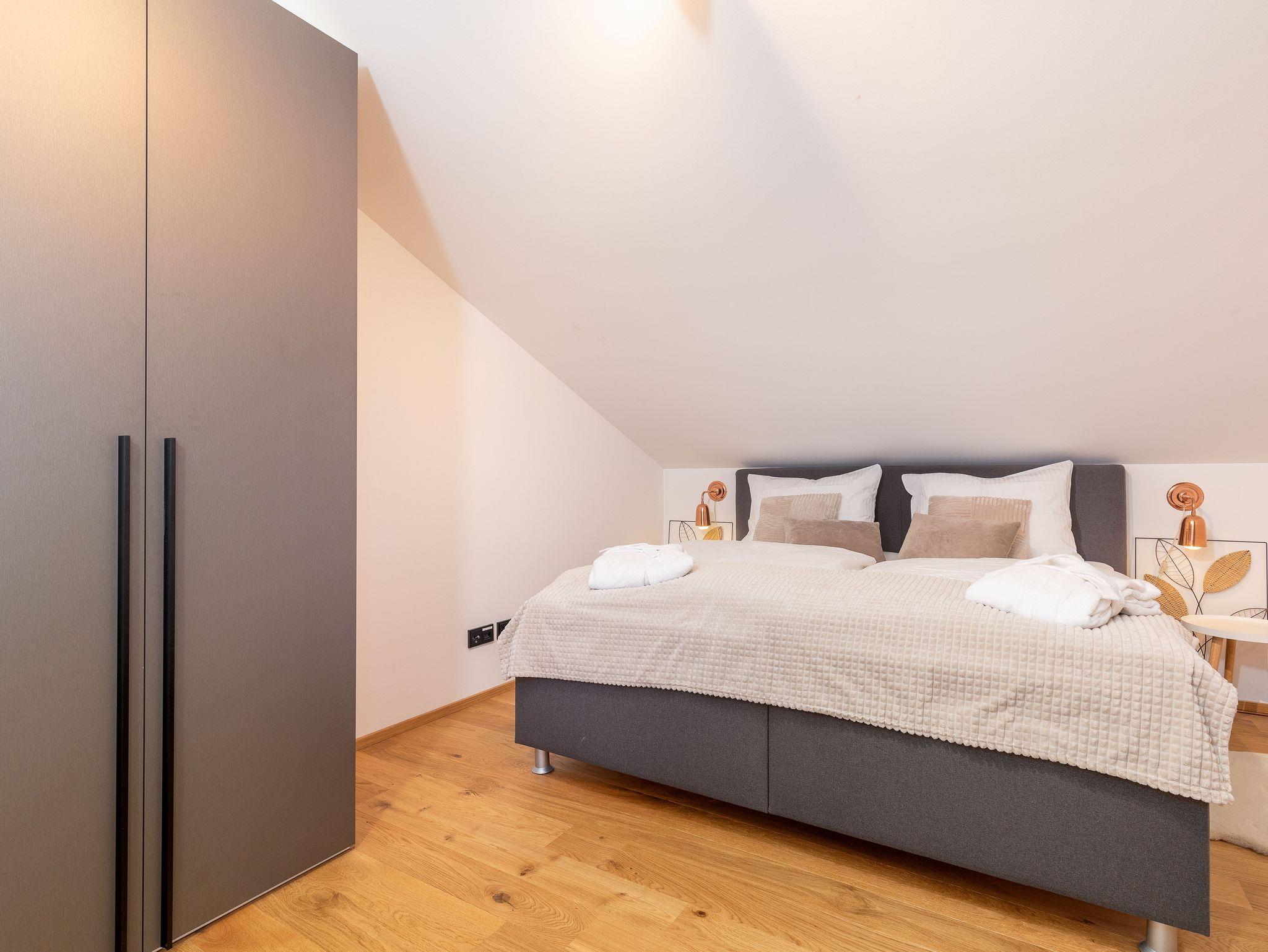 Doppelbett 180 x 200 cm und zwei geräumige Schränke.