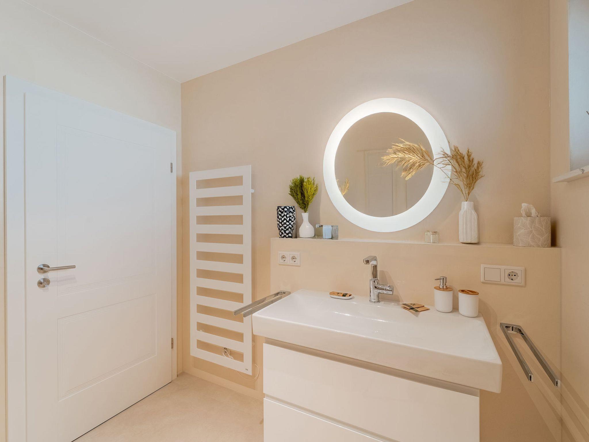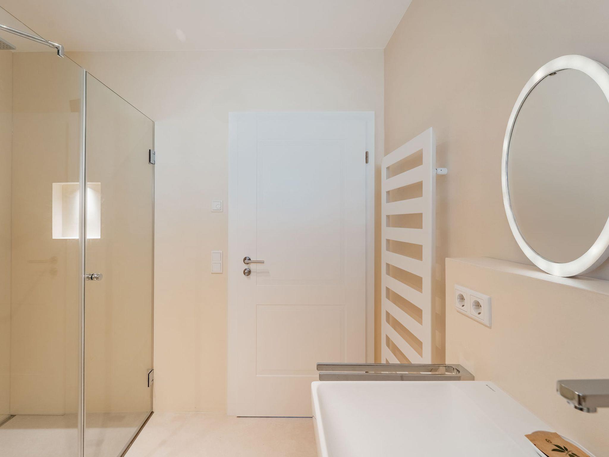 • Modernes Bad mit großzügiger Regendusche, Handtuchwärmer und Föhn