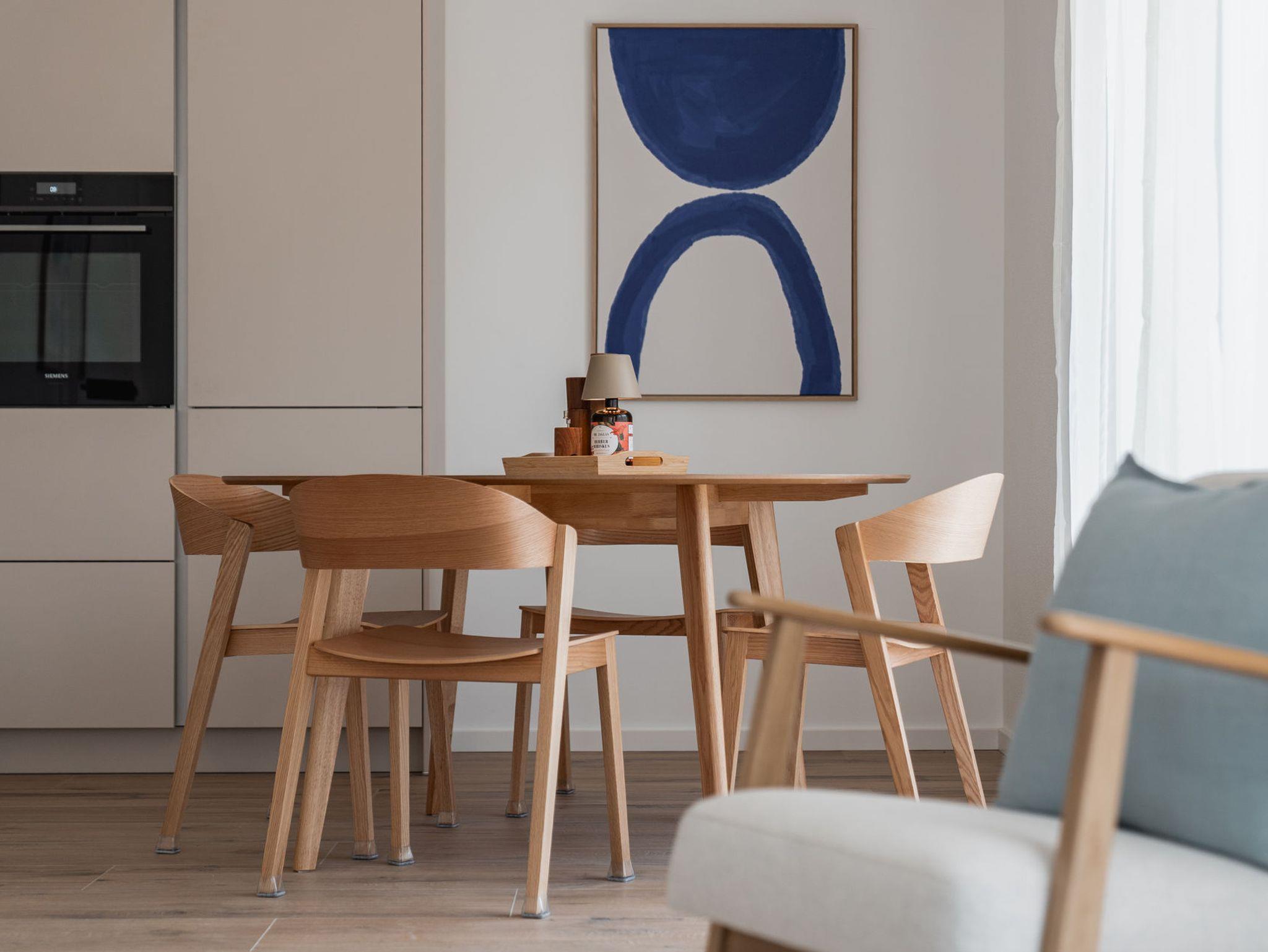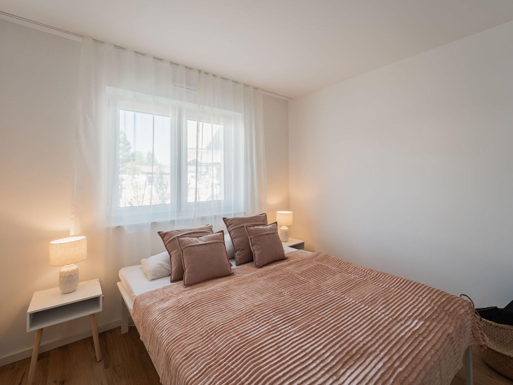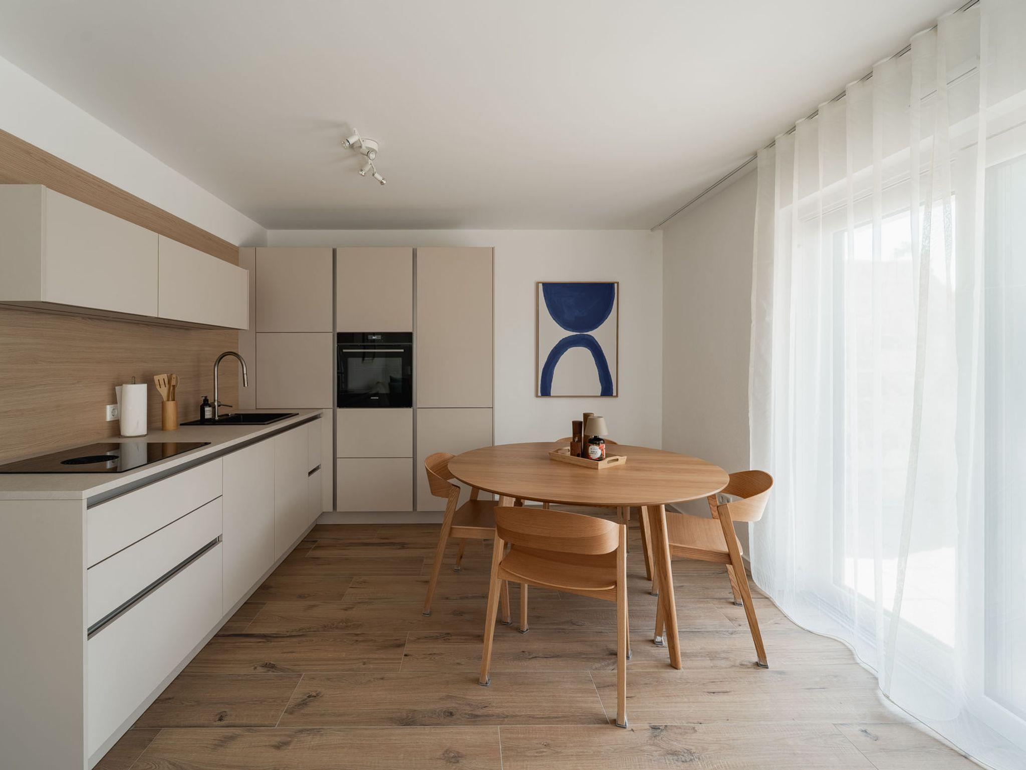 Die zwei getrennten Schlafzimmer mit bequemen Doppelbetten sorgen für erholsame Nächte, während der offene Wohn- und Essbereich mit großzügiger Küche zum Verweilen einlädt. Vom hellen Essplatz aus blickst du ins Grüne bis zu den Bergen.