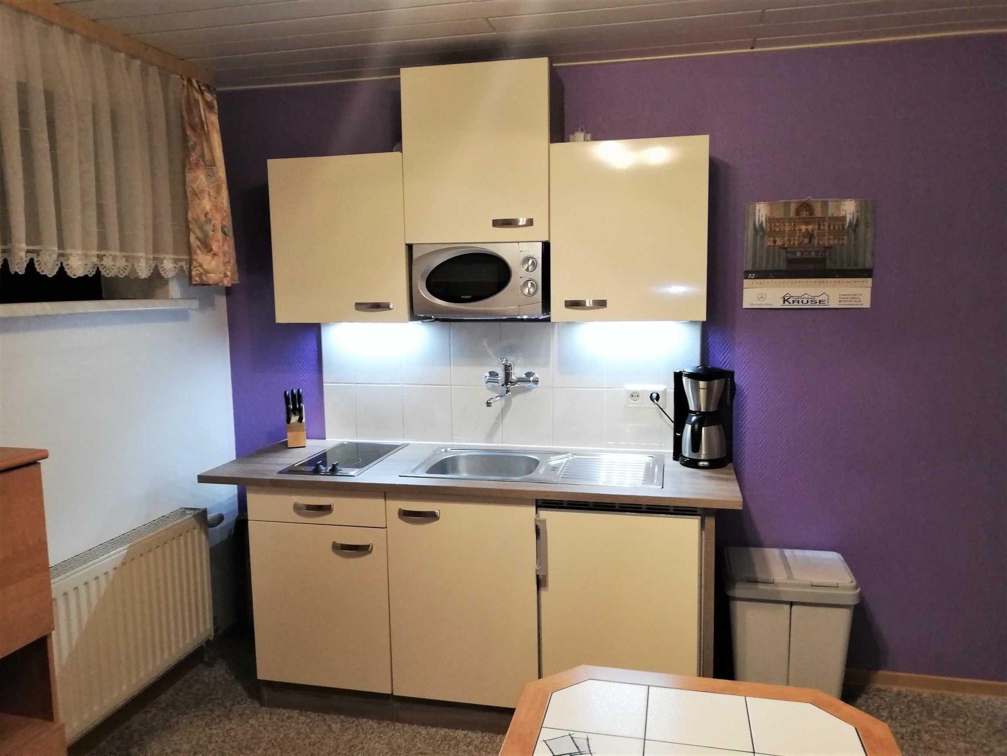 Die Ferienwohnung besteht aus einem Wohnzimmer mit Küchenzeile (Couchgarnitur, Schrankwand, Tisch, Miniküche mit Spüle, E-Herd, Kühlschrank, Kaffeemaschine, Geschirr und Hausrat, TV mit Sat-Anschluss und Radio), Schlafzimmer (Doppelbett, Rollbett, Kleiderschrank), Dusche/WC und Flur mit Garderobe. Alle Fußböden mit Teppichboden bzw. Fliesen. Zentralheizung. Ein Kinderbett ist ebenfalls vorhanden. Erstausstattung Bettwäsche inklusive Übernachtungspreis.