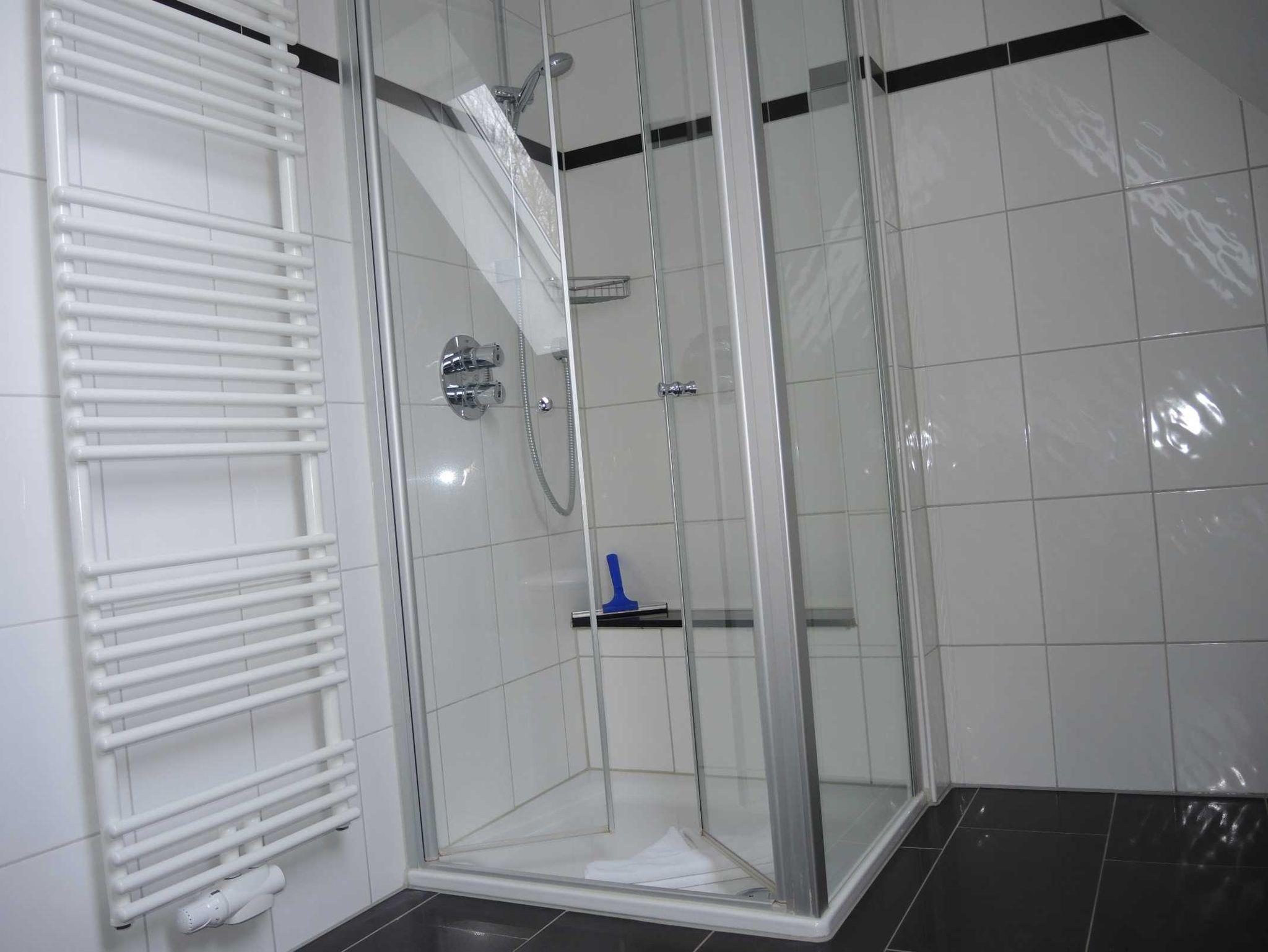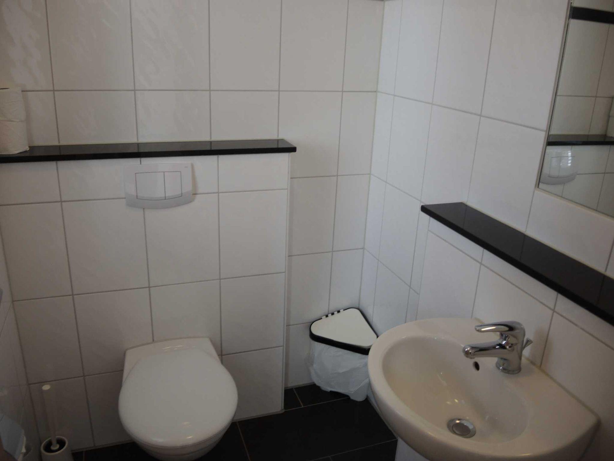 Das Badezimmer im Obergeschoss ist mit Dusche und Waschbecken ausgestattet. Zusätzlich gibt es im Erdgeschoss eine separate Gästetoilette.