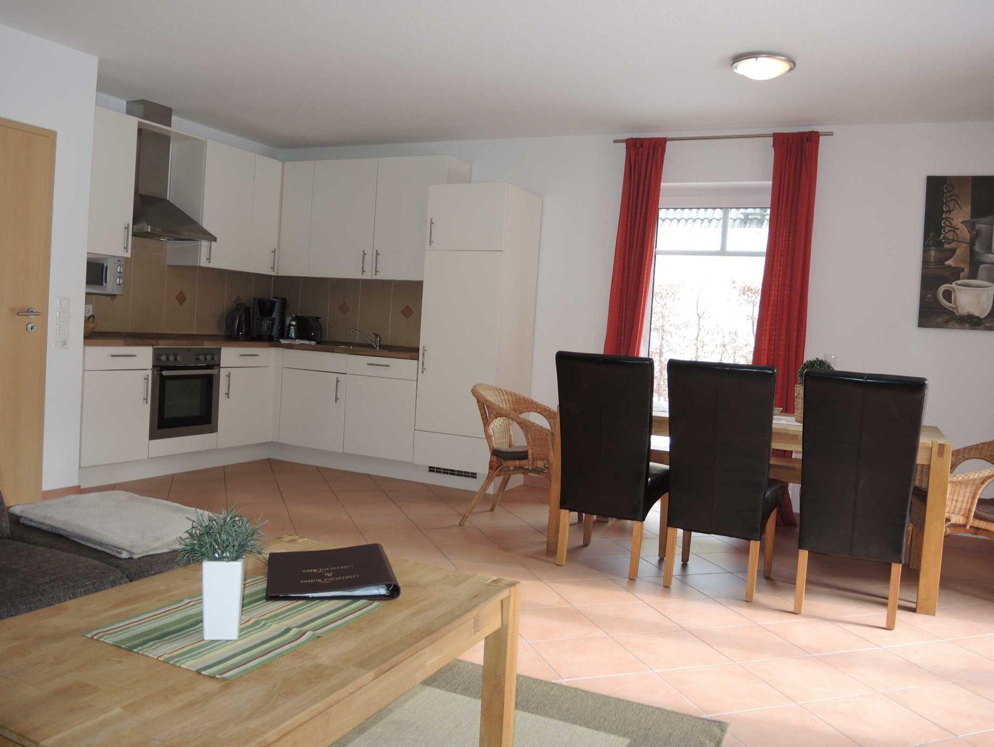Das Haus *** Sterne, die Küche ist im Wohn-, und Esszimmer integriert. Von hier gelangt man direkt auf die Terrasse.