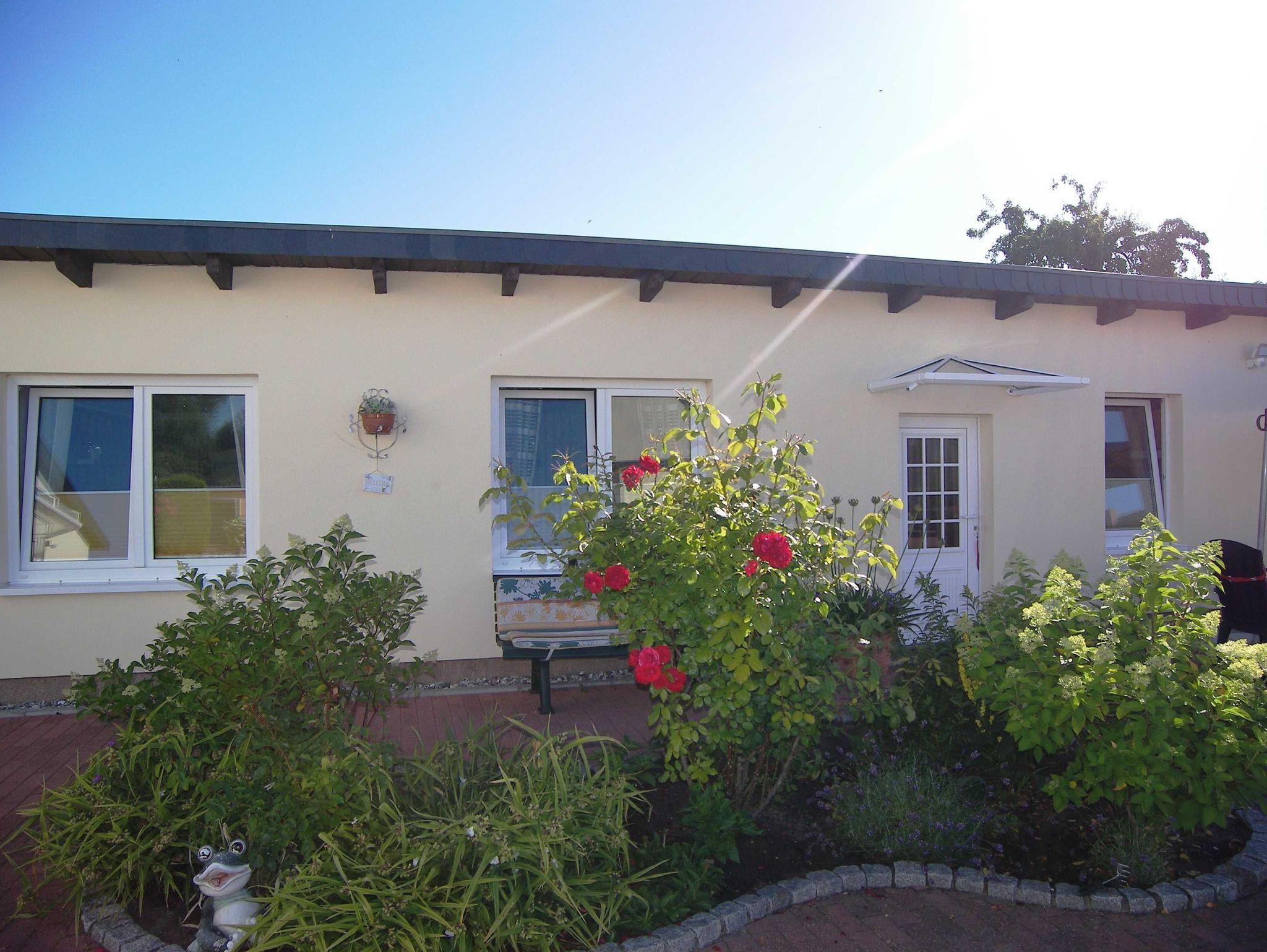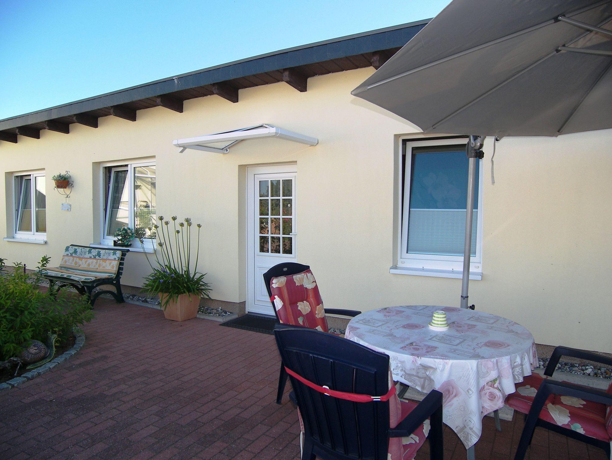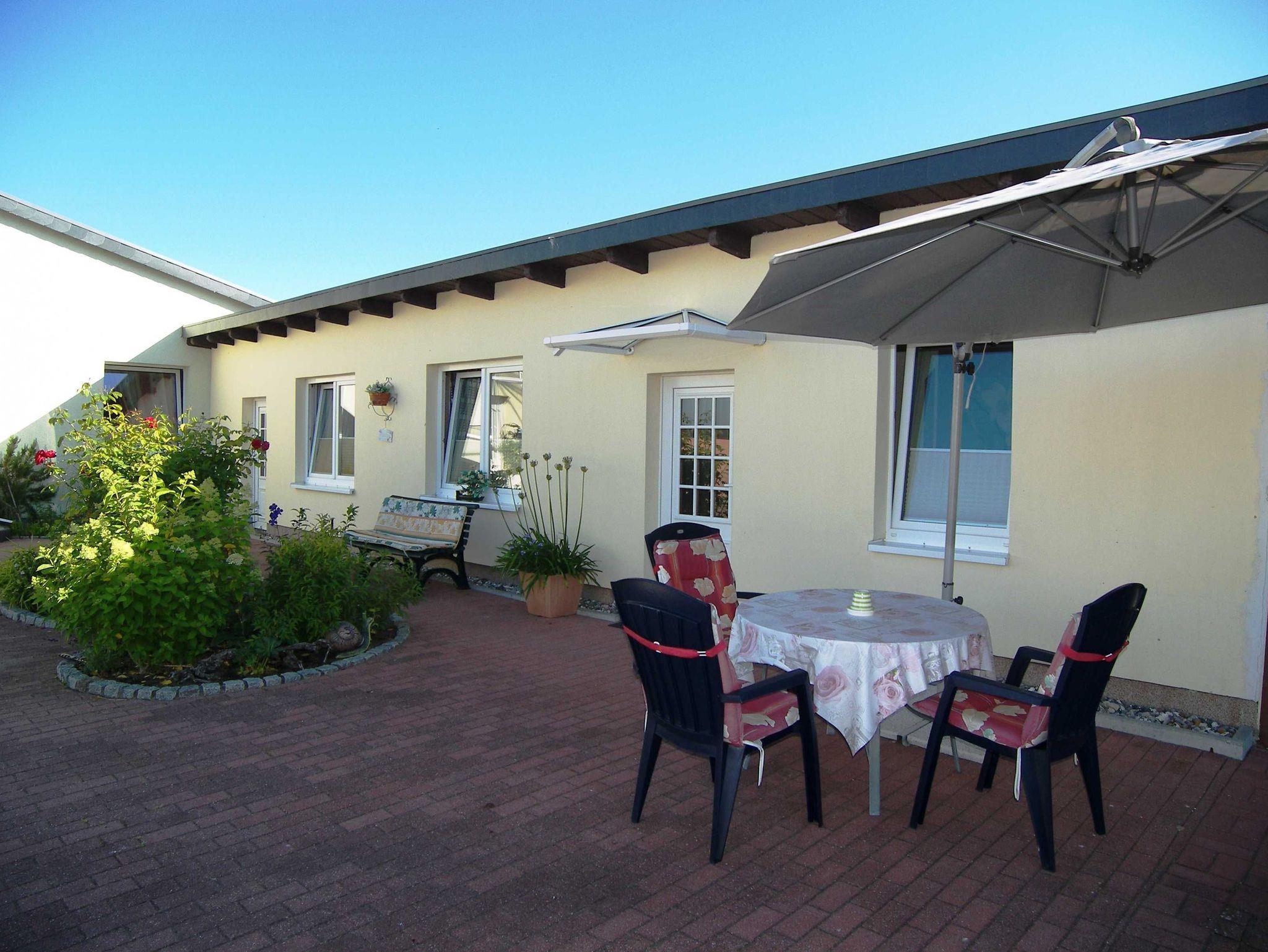 Vor der Ferienwohnung befindet sich eine gemütliche Sitzecke mit Grillmöglichkeit und Sonnenschirm. Bei Regen haben Sie die Möglichkeit, auch überdacht draußen zu sitzen.