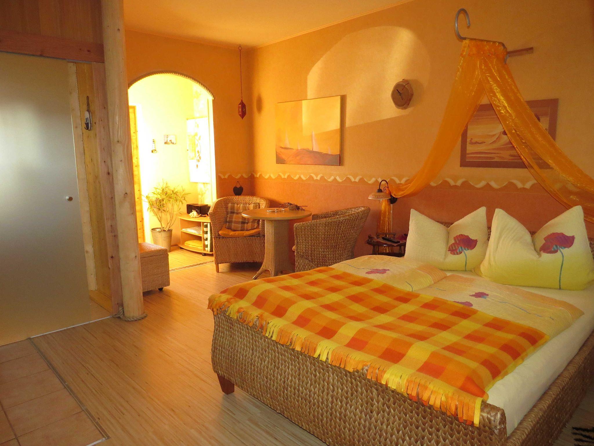Ferienwohnung für 2 Personen mit separatem Eingang. Das Apppartement ist ausgestattet mit einem Doppelbett, Küchenzeile, TV, Tisch 2 Korbsessel, Du/WC. Bettwäsche ist inklusive. Die Ferienwohnung hat eine eigene, martim gestaltete, Sonnenterrasse mit Sitzmöglichkeiten. Handtücher bitte mitbringen. Nichtraucher sind erwünscht (Rauchmöglichkeit auf überdachter Eingangsterrasse). Haustiere sind nicht erlaubt.