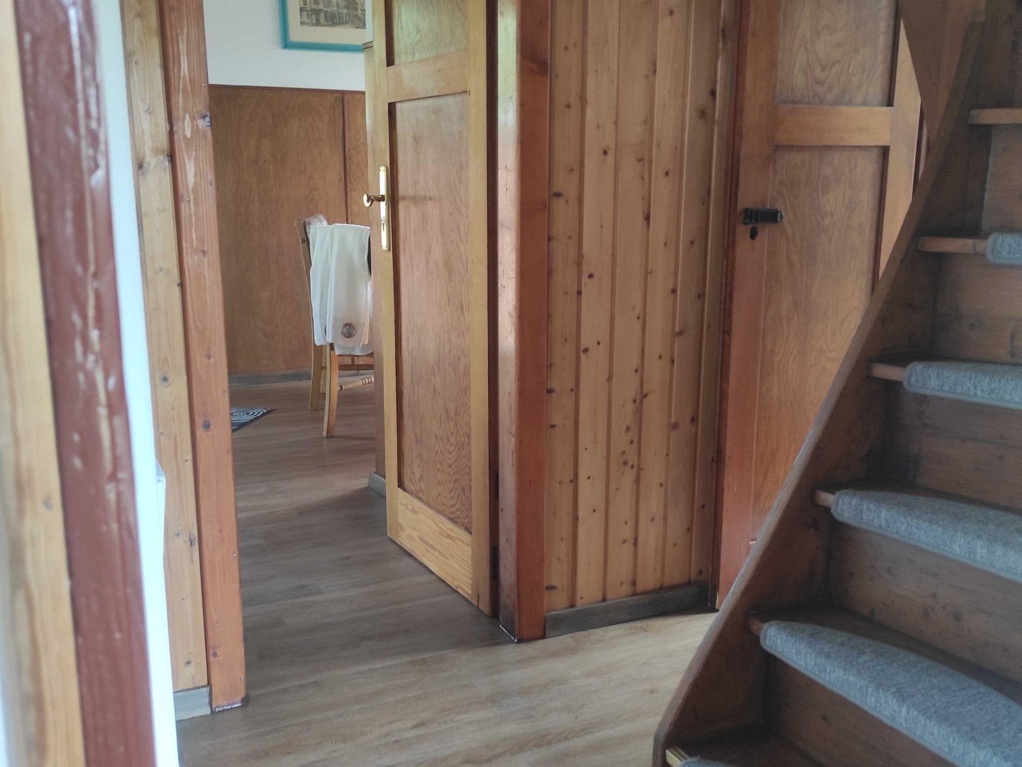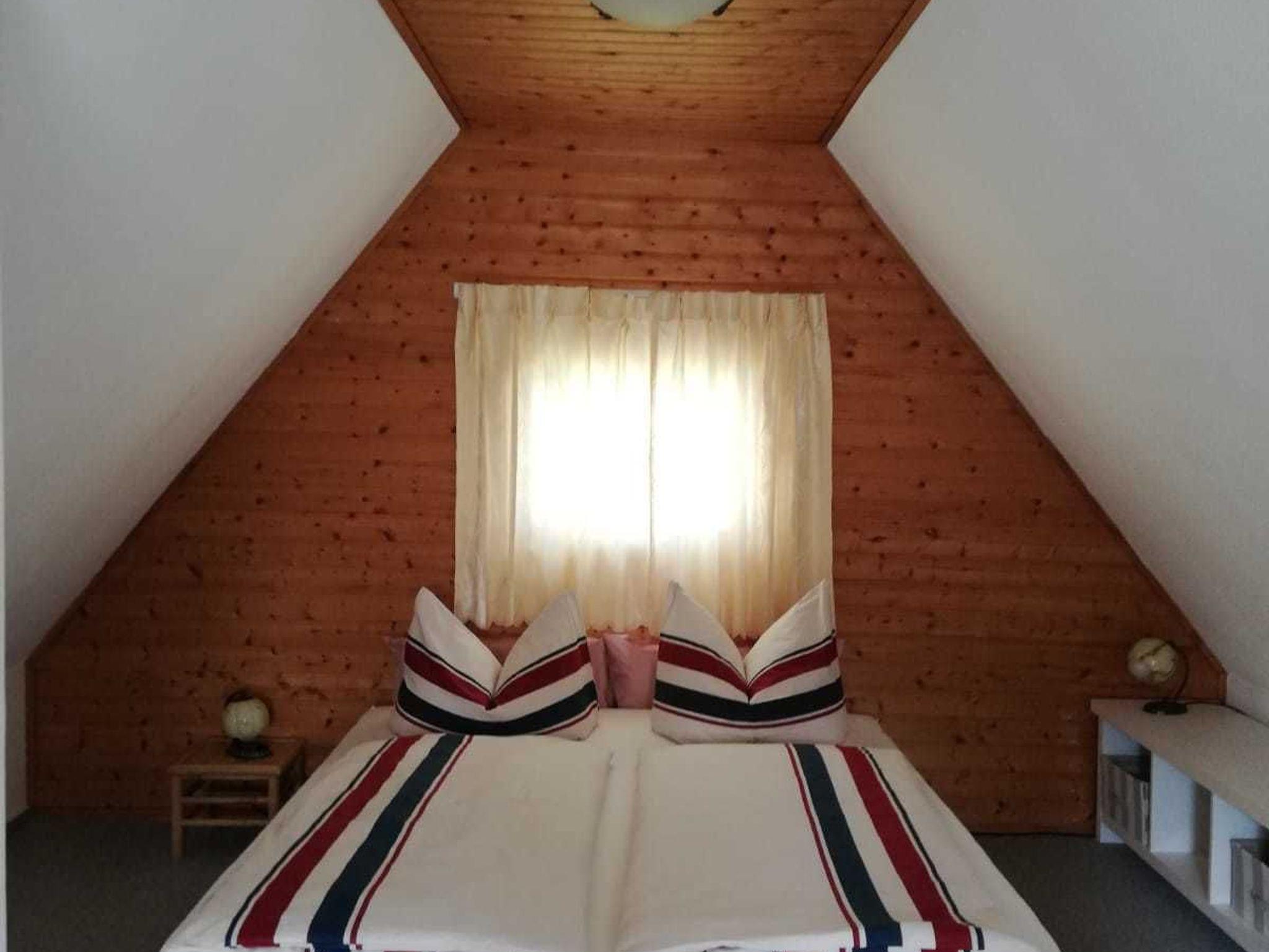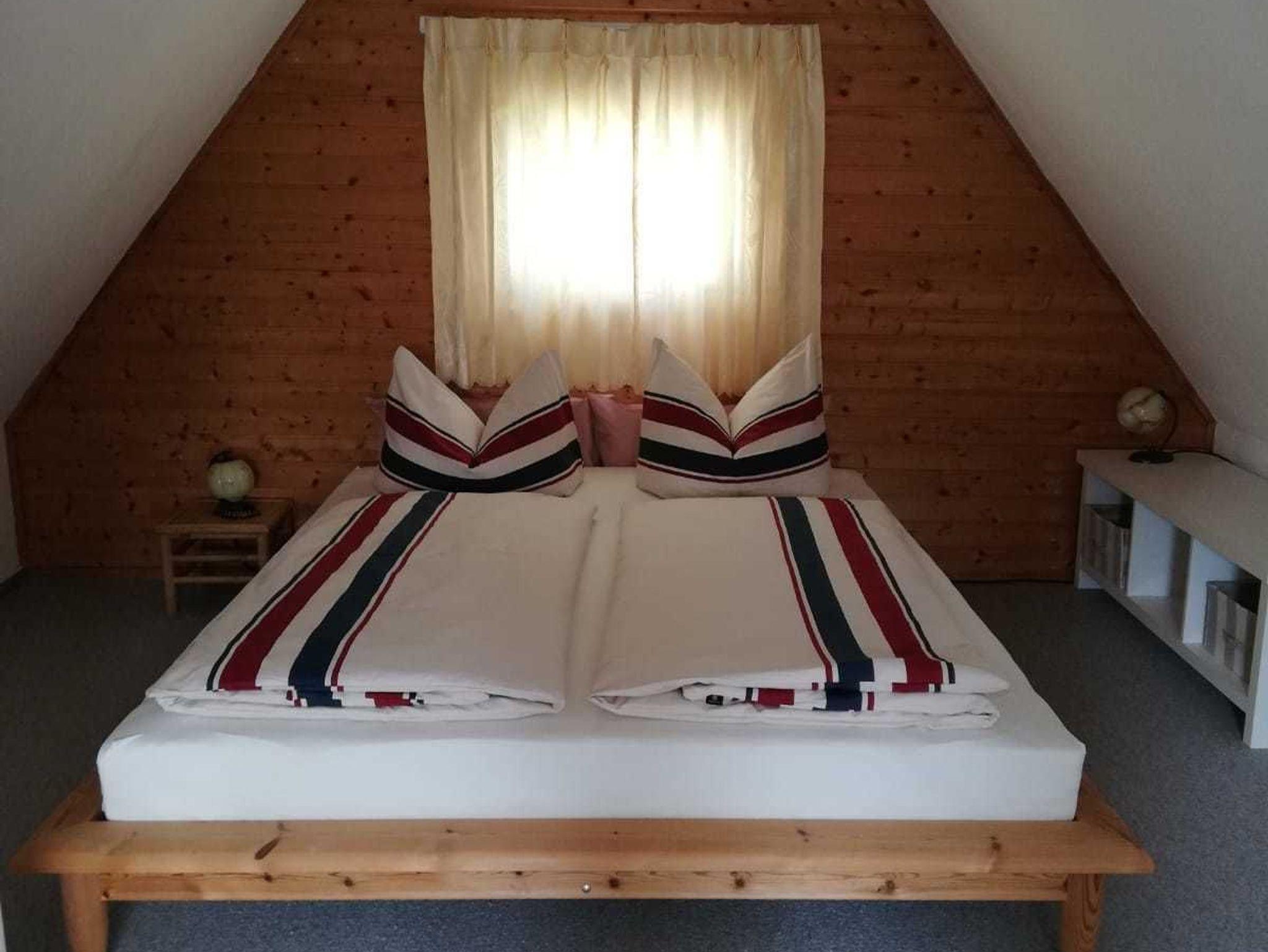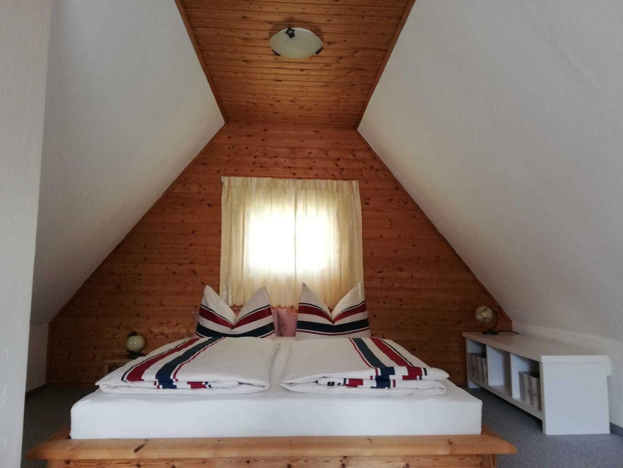 Das Schlafzimmer befindet sich im Dachgeschoß und ist über eine Treppe (siehe Foto) zu erreichen.