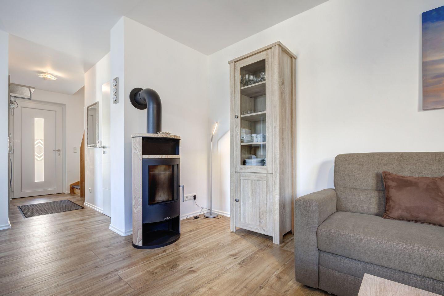 - Der großzügige Wohnbereich lädt zum Verweilen ein und sorgt mit einem Kaminofen für wohlige Wärme an kühlen Abenden.