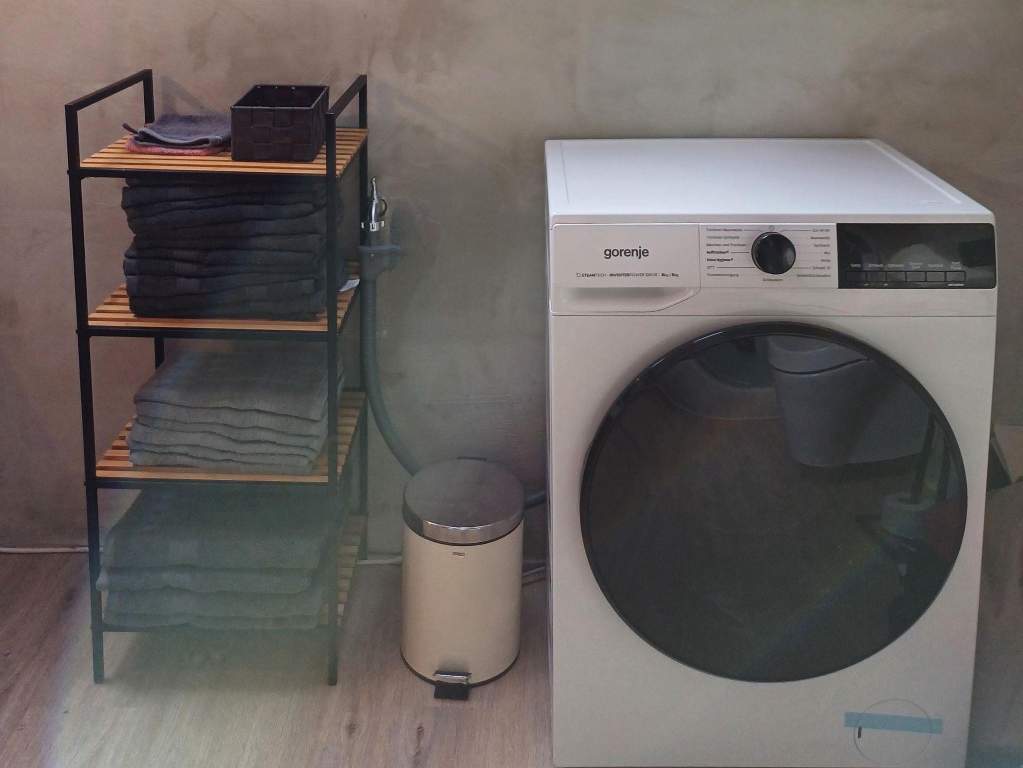 Badezimmer: Waschmaschine mit Trockner (Kombigerät), Föhn, Hygiene-Grundausstattung (Shampoo, Handseife, Duschzeug, etc.)