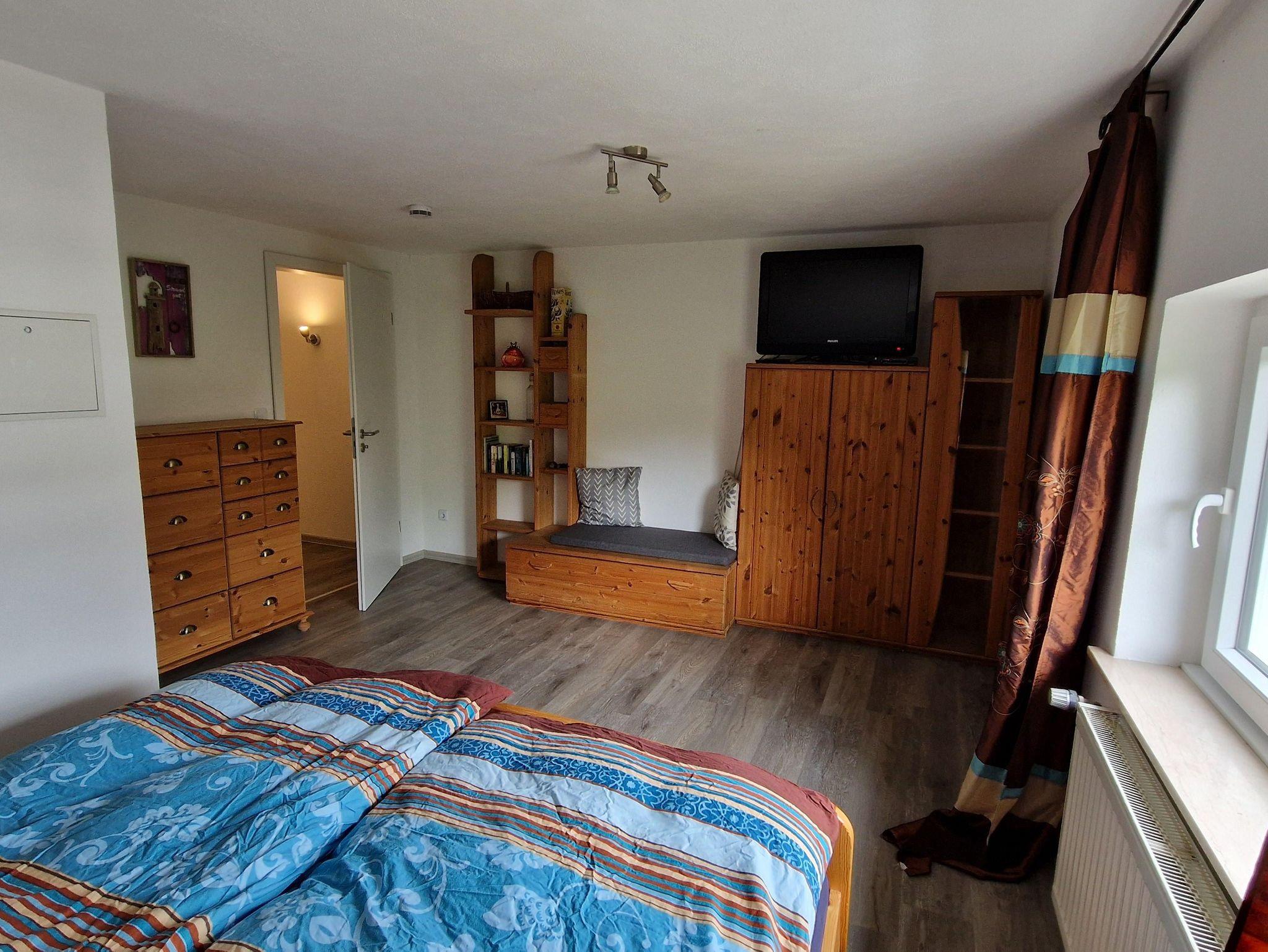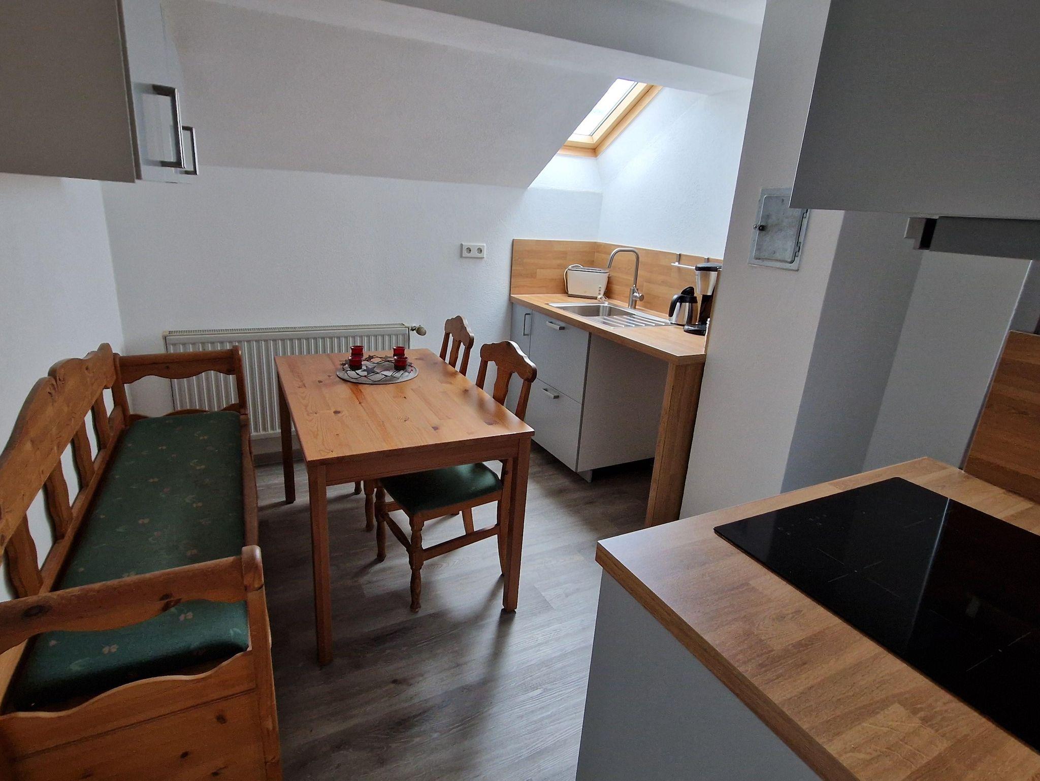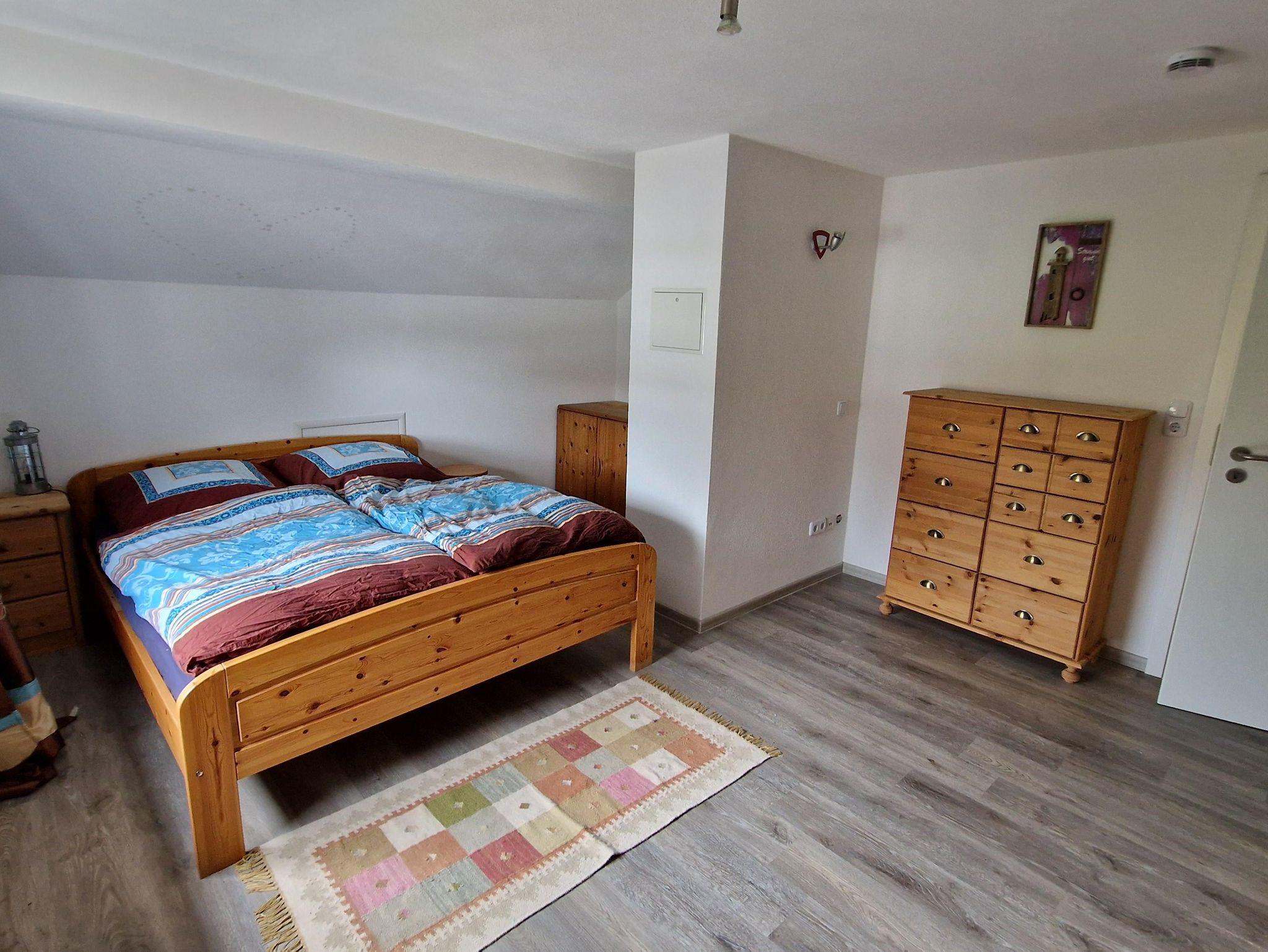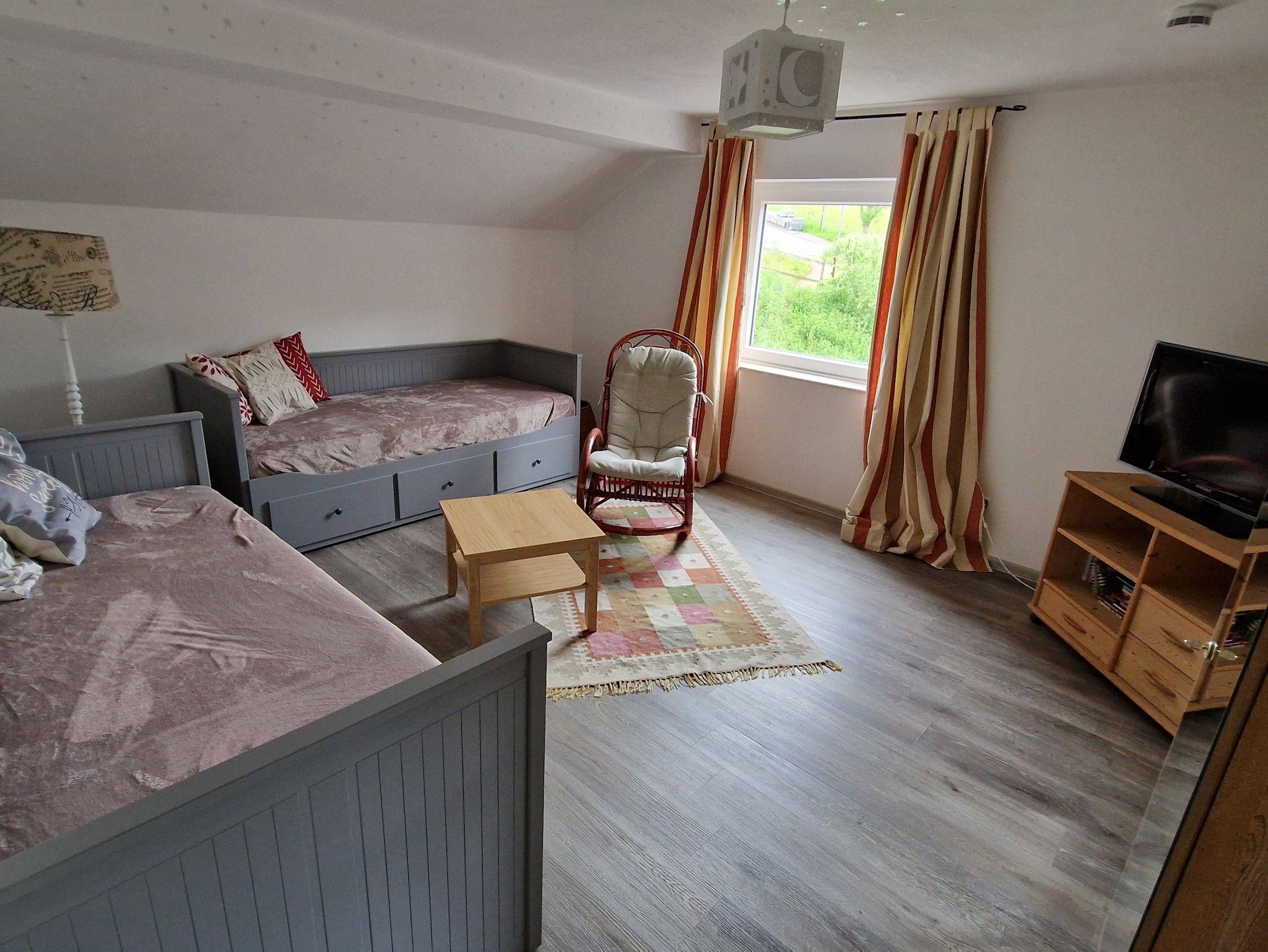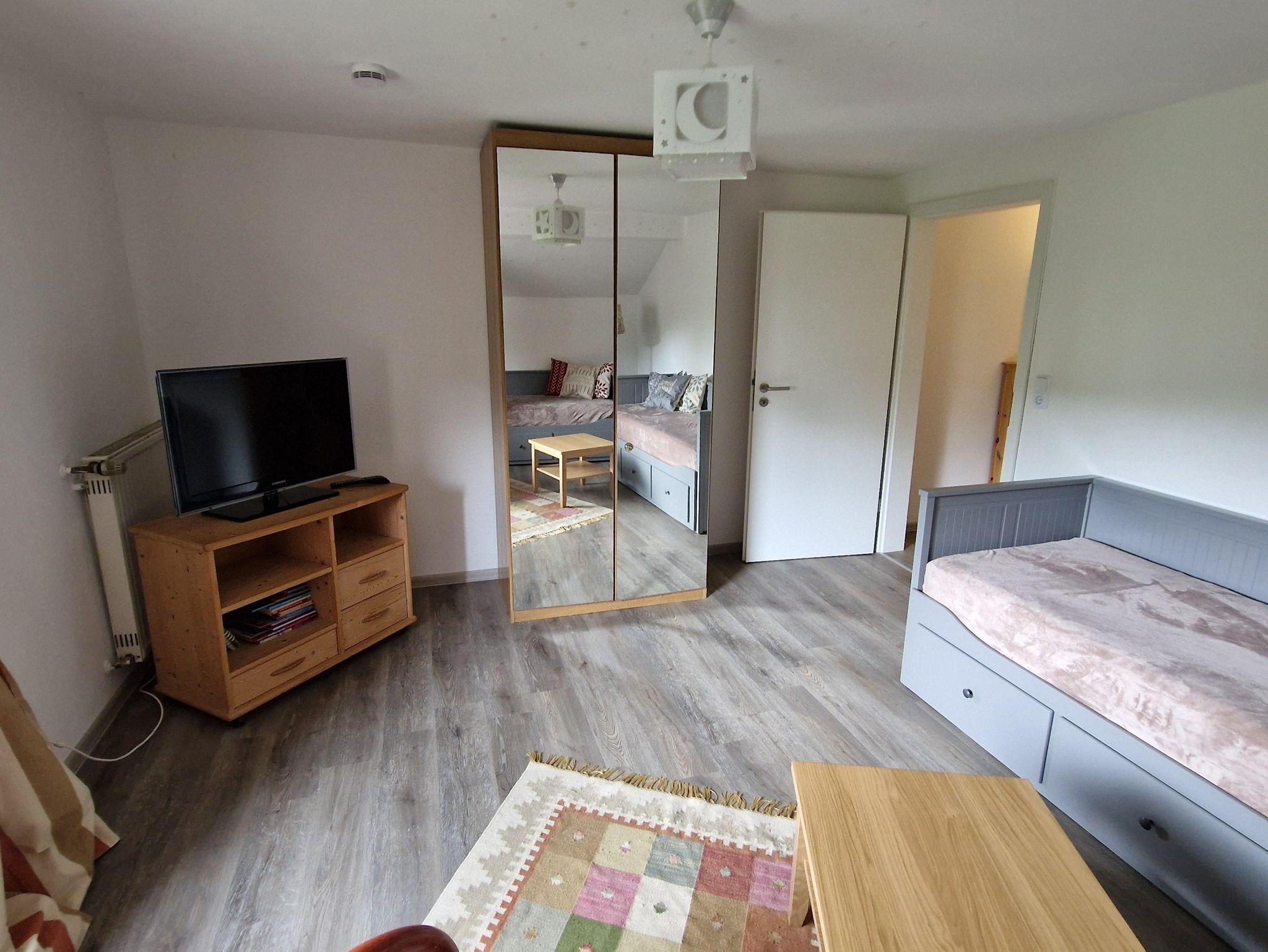 Die Ferienwohnung liegt im Dachgeschoss des Wohnhauses direkt an einem Reitstall und verfügt über eine Küche, ein sep. Schlafzimmer, ein Wohn-/Schlafzimmer und ein Bad.