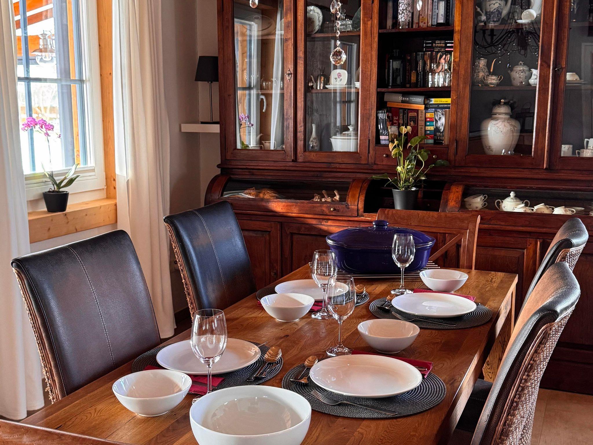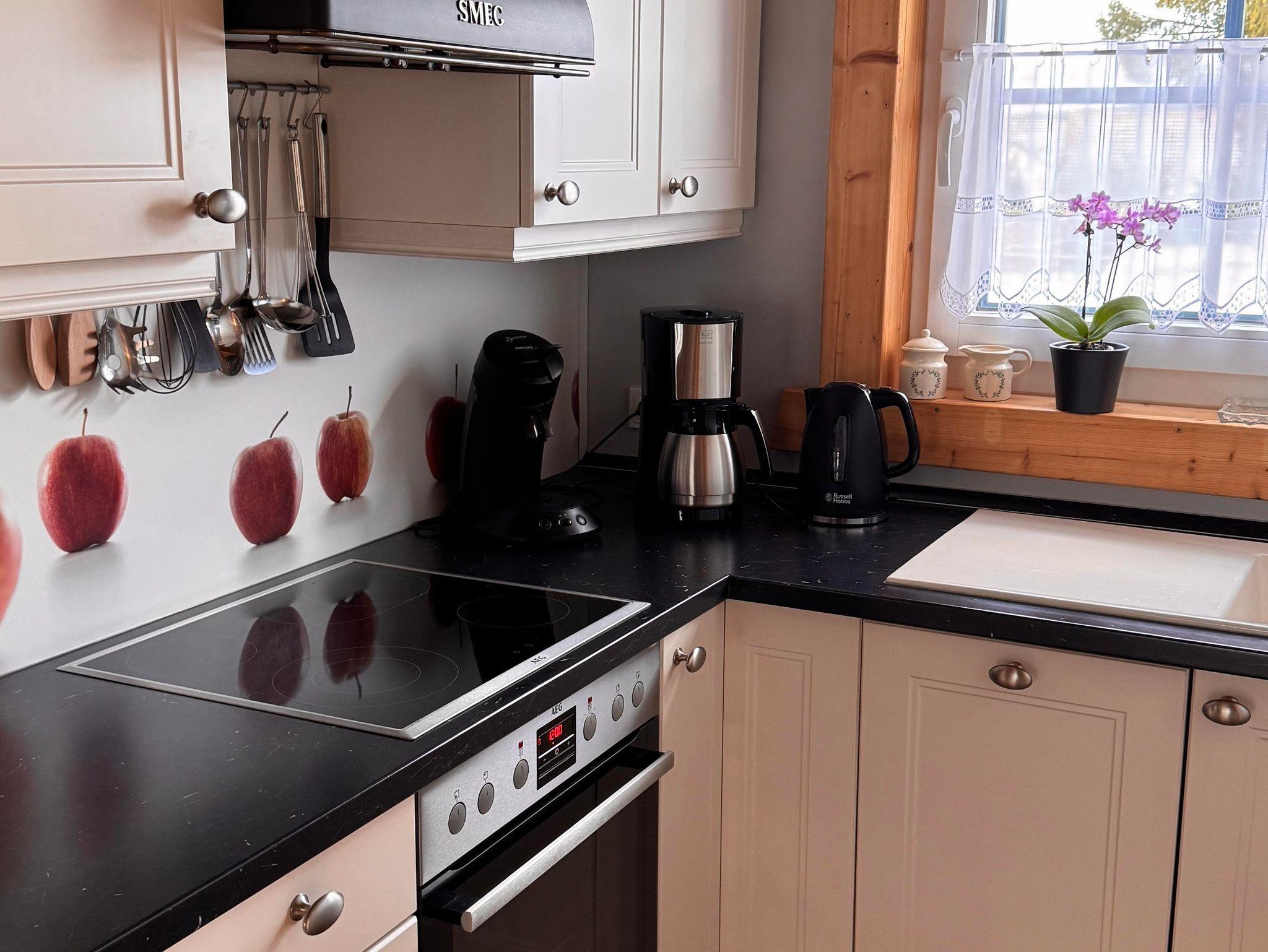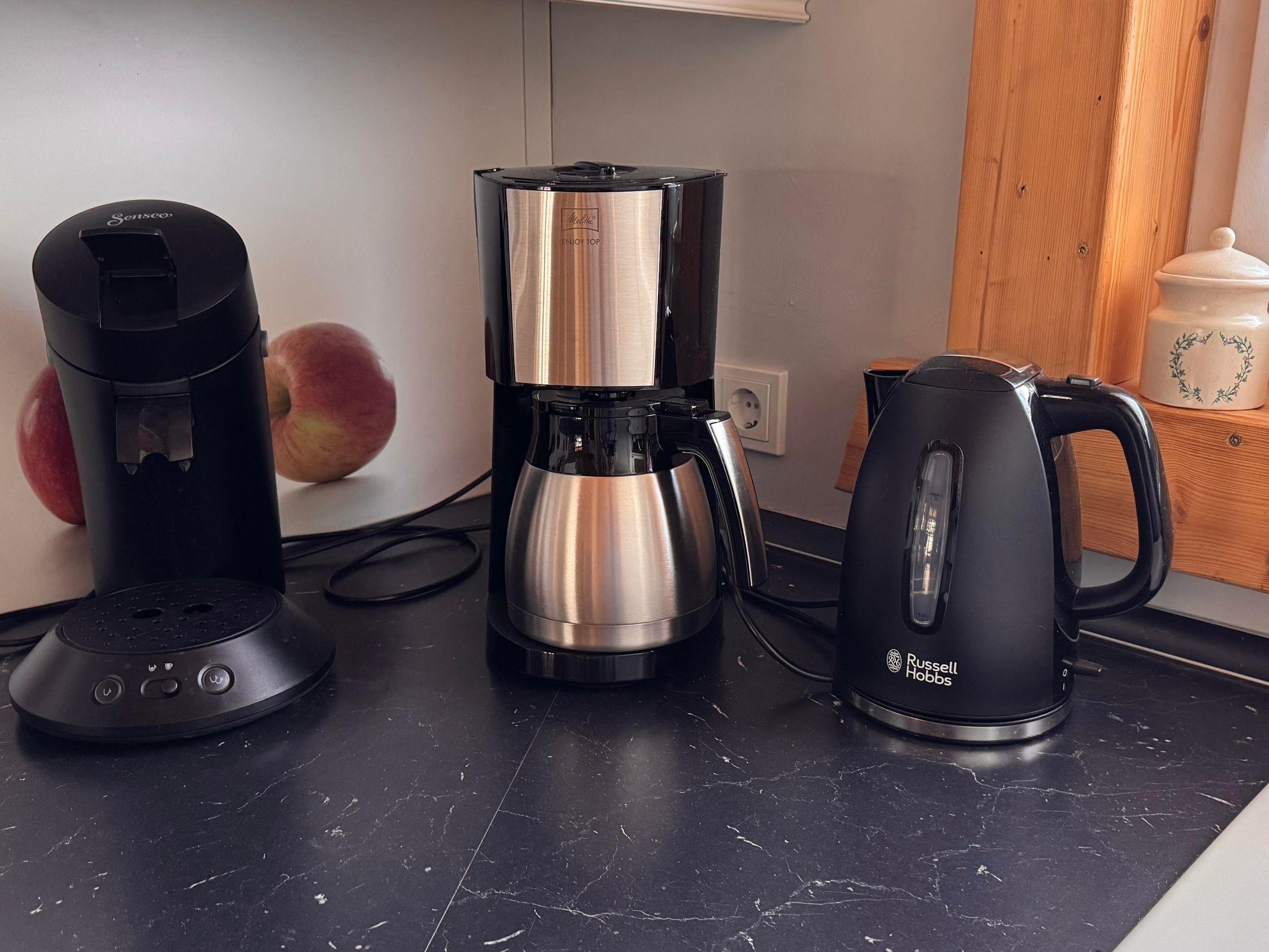 Die Küche ist mit gehobener Technik und umfangreichen Gebrauchsgegenständen ausgestattet. Hierzu gehören Herd mit Backofen und Dunstabzugshaube, Spülmaschine und großer Kühlschrank (ohne Gefrierfach). Weiterhin finden Sie in der Küche Filterkaffee-Maschine, Senseo-Pad-Maschine, Wasserkocher, Toaster, Waffeleisen, Handmixer, Stabmixer, Küchenmaschine, Brotschneidemaschine, ein elektrisches Fondue und einen Elektro-Grill.