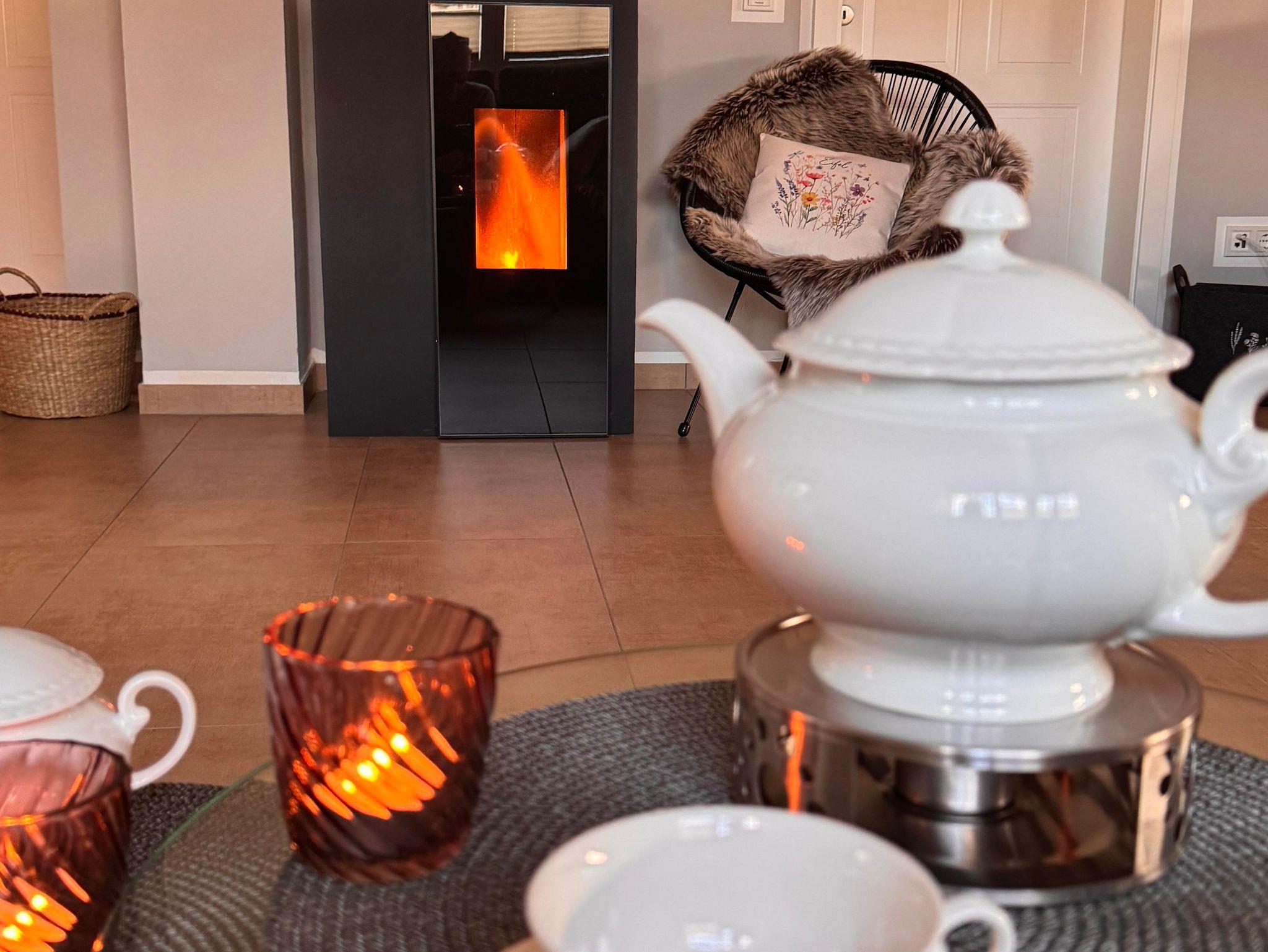 Der geräumige Wohn-/ Essbereich des Hauses verfügt über einen großen Esstisch mit 6 Stühlen und über eine komfortable gemütliche Couch mit Sessel. Zur Ausstattung gehört weiterhin ein großer schwenkbarer SAT-Fernseher, sowie eine kleine Musikanlage und ein gemütlicher Kaminofen. Für Ihren Aufenthalt stellen wir Ihnen eine Auswahl von Spielen, CDs, Zeitschriften und Büchern und sogar ein Fernglas zur Verfügung.