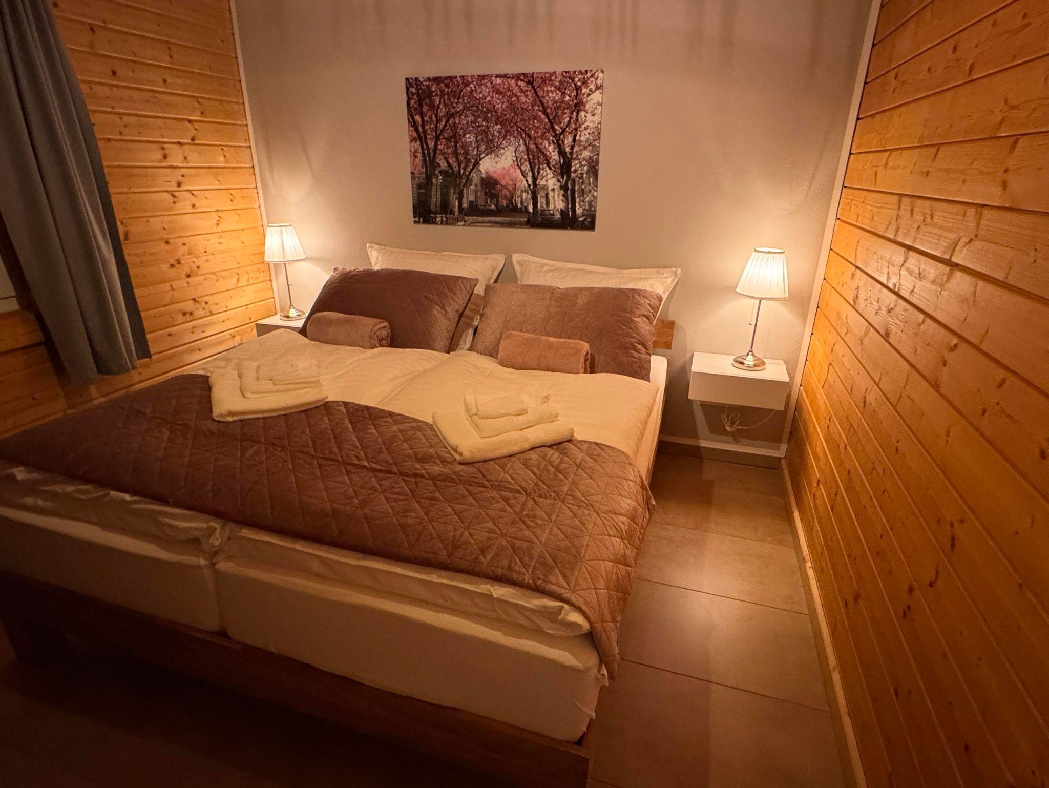 Das EifelChalet verfügt über 2 Schlafzimmer: Das größere Kirschblüten-Schlafzimmer mit Doppelbett (180 cm x 200 cm) und ohne TV und das kleinere Kuschel-Schlafzimmer mit Doppelbett (180 cm x 190 cm) und mit TV.
