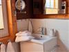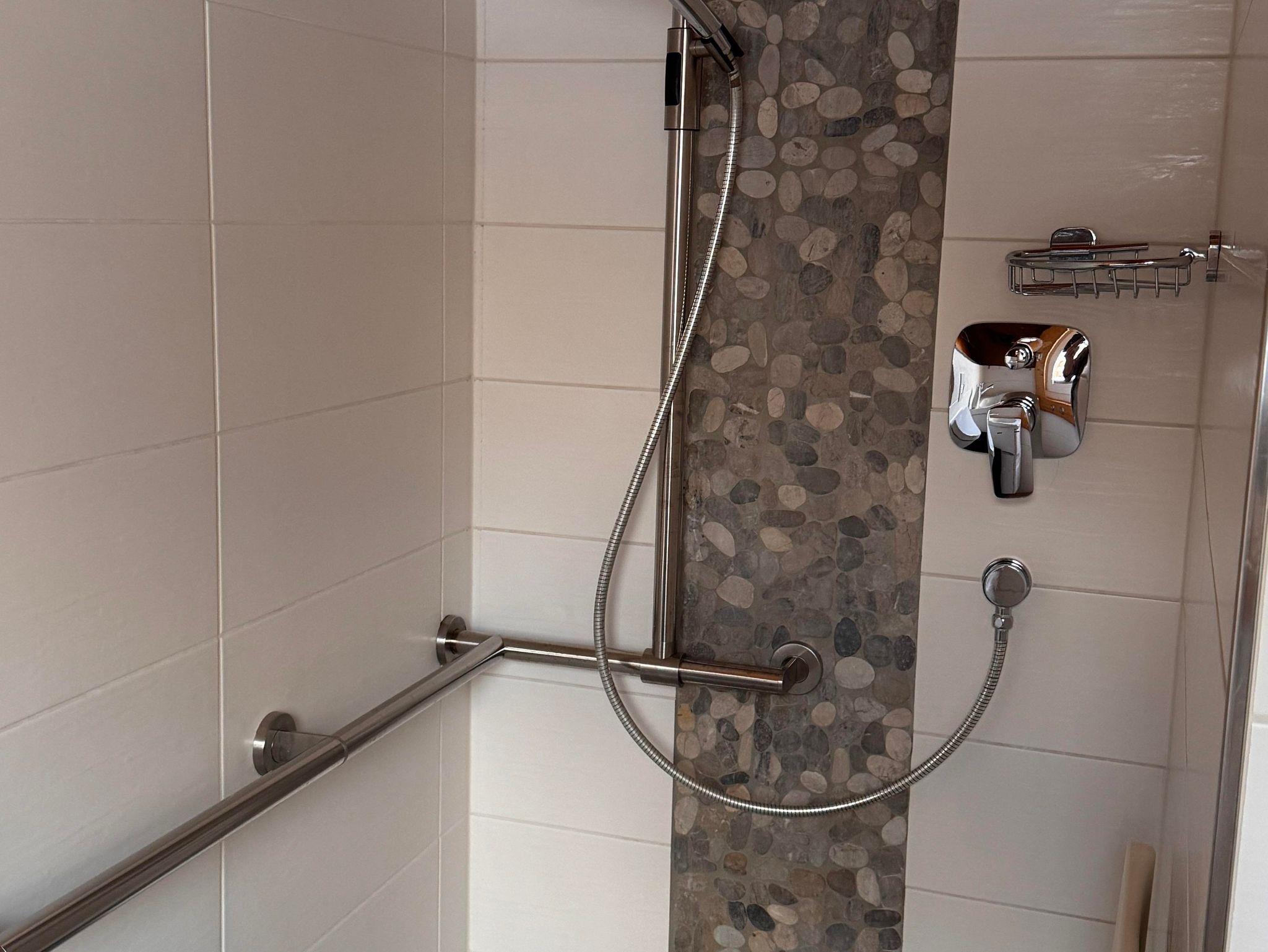 Das Badezimmer verfügt über eine ebenerdige Dusche mit zusätzlicher Regendusche, Haltegriffen und klappbarer Sitzgelegenheit in der Dusche, sowie über WC und Urinal, Waschtisch, Radio und beleuchtetem Spiegelschrank. Schminkspiegel und ein Fön stehen ebenfalls zur Verfügung.