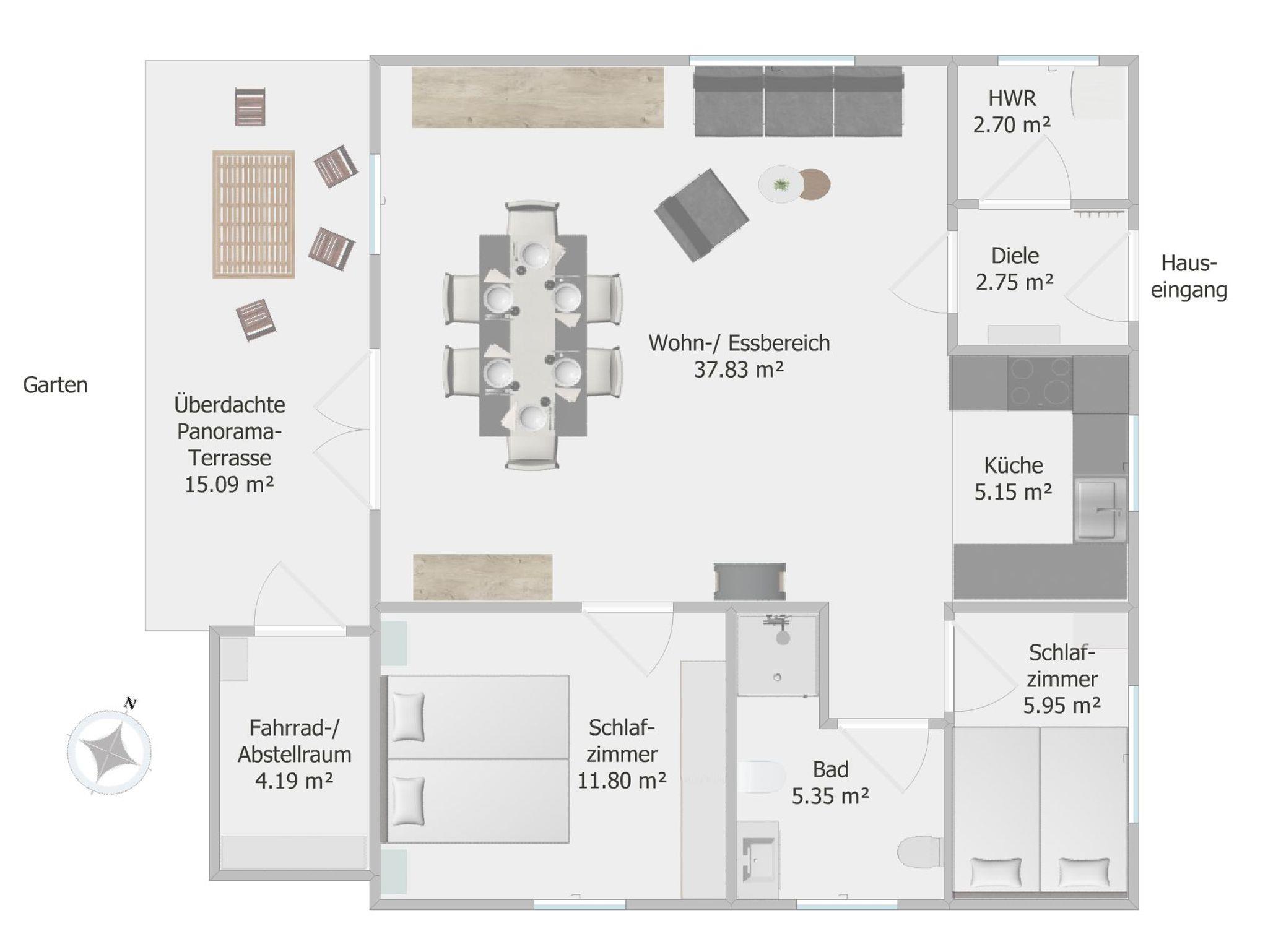 Unser Ferienhaus hat eine Wohnfläche von 91 m2 und ist aufgeteilt in zwei Schlafzimmer, ein Badezimmer, einen Hauswirtschaftsraum, Flur und einen großen Wohn-/ Essraum mit voll ausgestatteter Küche. Angrenzend an die große überdachte Terrasse befindet sich ein abschließbarer Abstellraum für z. B. Fahrräder. Ein Teil des Gartens kann mit benutzt werden und ein großer PKW-Stellplatz ist direkt am Ferienhaus auf dem Gelände verfügbar.