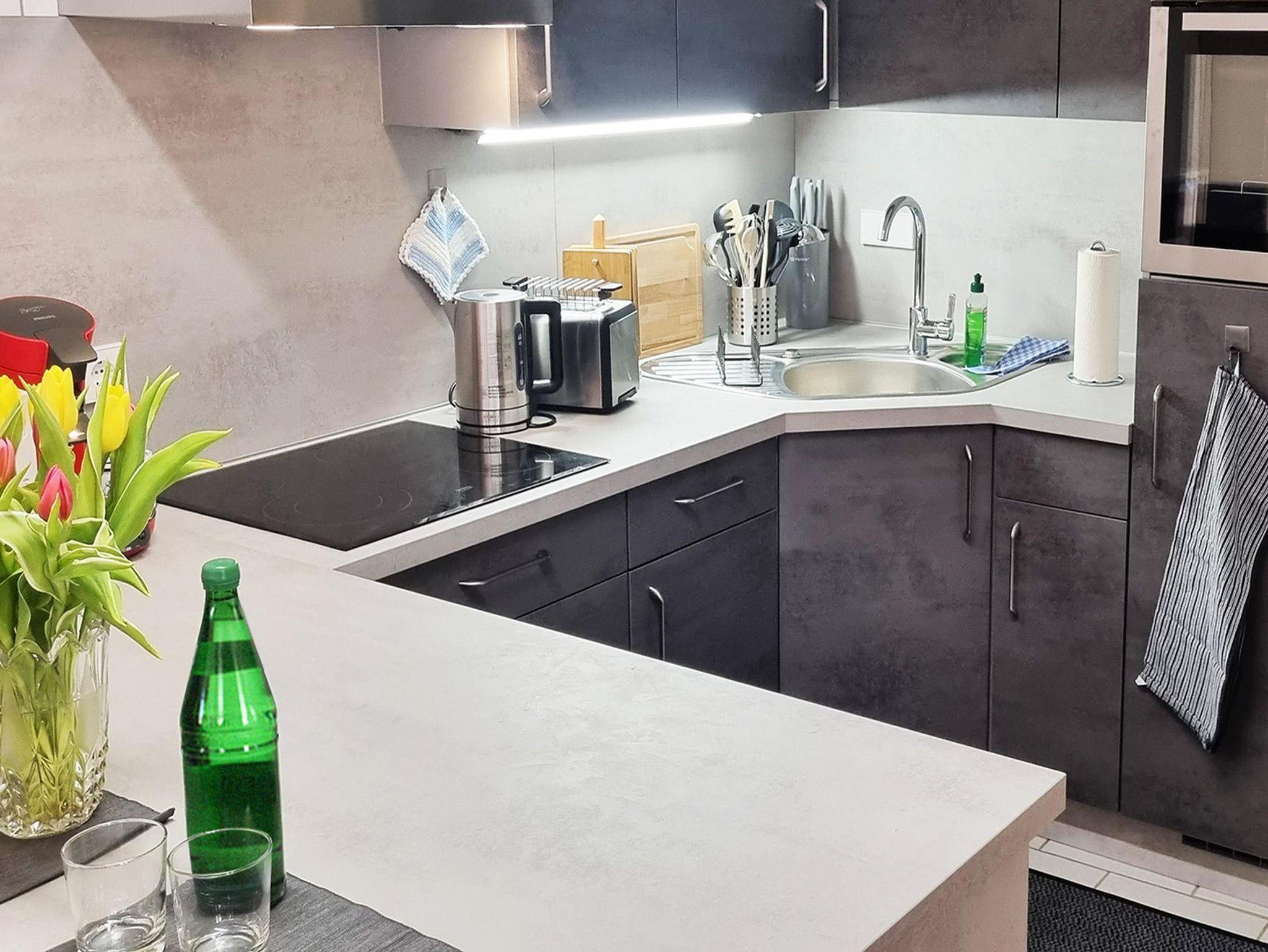 • Einbauküche mit voller Ausstattung (Ceranfeld, Backofen, Kühlschrank mit Gefrierfach, Wasserkocher, Kaffeemaschine, Toaster etc.)