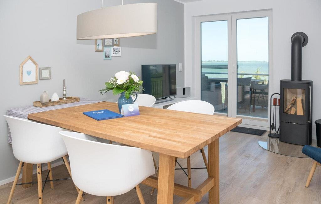 Vand overalt, hvor I ser. Feriehuset Achtern Schilf ligger direkte på den idylliske bredde af Slien i ferieområdet Olpenitz med fri udsigt over østersøfjorden Slien. Ud over den direkte vandbeliggenhed imponerer denne ferieejendom med sin højkvalitets indretning og smagfulde indretning. Tre terrasser, en romantisk pejs og den private wellness-oase med sauna og spabad gør jeres ferie perfekt og sikrer komfort i hver sæson. Den åbne stue/spisestue i stueetagen imponerer med gulv-til-loft vinduer, hvorigennem man kan se Sleiufers siv svaje i vinden og udstrækningen af Slien, som giver et betagende panorama direkte foran vindue. Siddeområde, pejs og et stort spisebord sikrer komfort og hygge. Direkte ved siden af stuen er terrassen med panoramaudsigt over Sleien. Uanset om det er en hyggelig grillaften med Weber Grill eller med vin og en bog, gør den umiddelbare nærhed til vandet jeres ferie uforglemmelig. Et Bose Sound Touch musiksystem og en Play Station 5 sørger for underholdning Det højkvalitets og fuldt udstyrede køkken lader intet tilbage at ønske og tilbyder alt hvad angår madlavningskomfort, en feriegæst kan ønske sig. Den eksisterende Sodastream tilbyder jer frisk mousserende vand til enhver tid. På øverste etage gør master bedroom drømme til virkelighed, da gæster kan vågne op og falde i søvn her med en betagende udsigt over Sleien. Om morgenen byder Sliens bredder på et sandt naturligt skue: Når ænderne og svanerne vågner, kan I starte dagen på terrassen ved siden af soveværelset. Et andet soveværelse byder på plads til to voksne med to enkeltsenge, mens en komfortabel lænestolsseng med et liggeareal på 92 x 196 cm tilbyder endnu et sted at sove for et barn. Der er også et andet fladskærms-tv med hjemmeunderholdningsprogram i dette soveværelse. Også på første sal er hovedbadeværelset med et personligt program: boblebad, sauna med udsigt til vandet og bruser gør dette badeværelse til et privat område. Et gæstetoilet i stueetagen giver ekstra komfort. Højdepunktet i feriehuset Achtern Schilf er den store tagterrasse, som byder på panoramaudsigt over vandet over Sleien og havnen i feriestedet Østersøen. Vores yndlingssted: At se sivene blæse i vinden og den blide drivende moskus om morgenen. Feriehuset Achtern Schilf er den ene halvdel af et hus. Der er parkeringsplads og cykelskur lige foran huset. I kan finde lademuligheder for el-cykler på terrassen. Bemærk venligst: OstseeResort Olpenitz er meget populært, og der bygges fortsat i parken. Ikke desto mindre kan I se frem til en 5-stjernet standard og et førsteklasses ophold. Byggeaktiviteterne kommer ikke til at forstyrre jer på ferien, og derfor gives der ikke yderligere afslag i prisen.