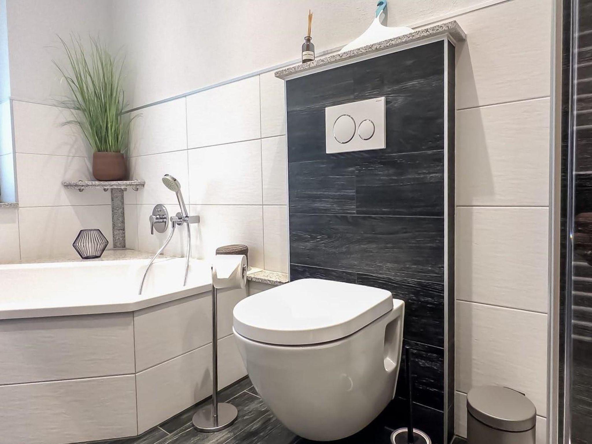 Das moderne Badezimmer mit ebenerdiger Dusche, Handtuchtrockner, Fußbodenheizung und Eckbadewanne lädt zum entspannen ein.