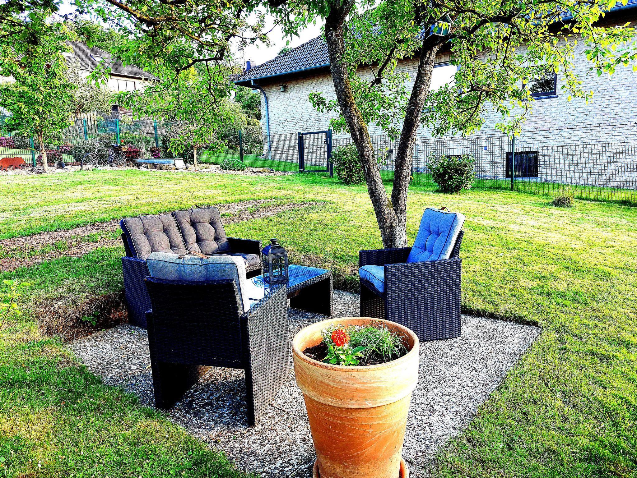 Vor allem im Sommer können sie entspannte Grillabende in unserem Garten verbringen. Eine große Feuerschale rundet das Gesamtbild ab.