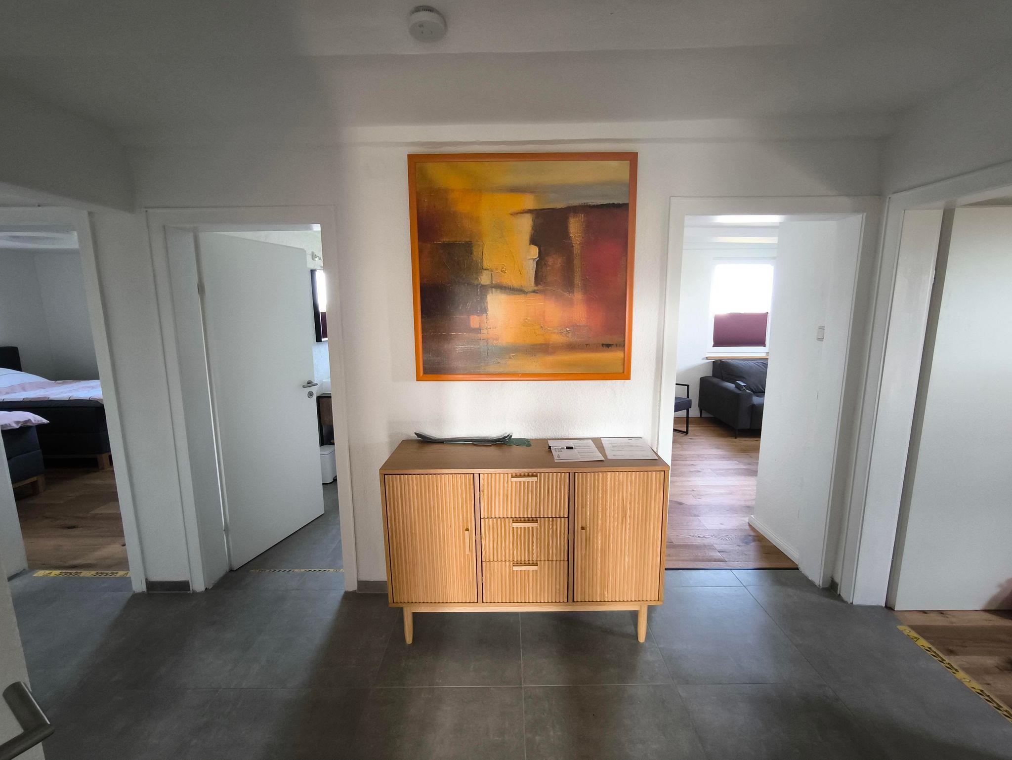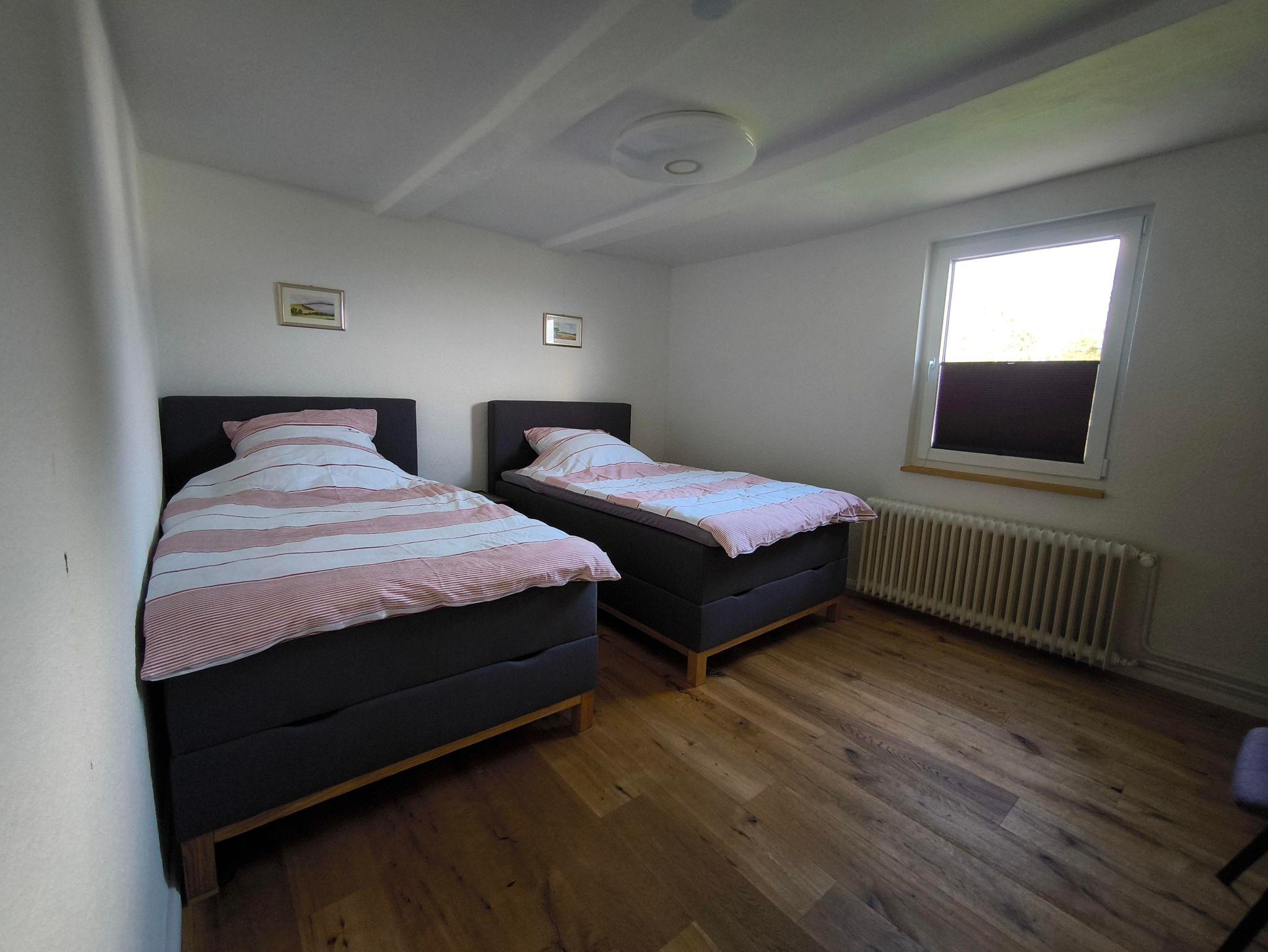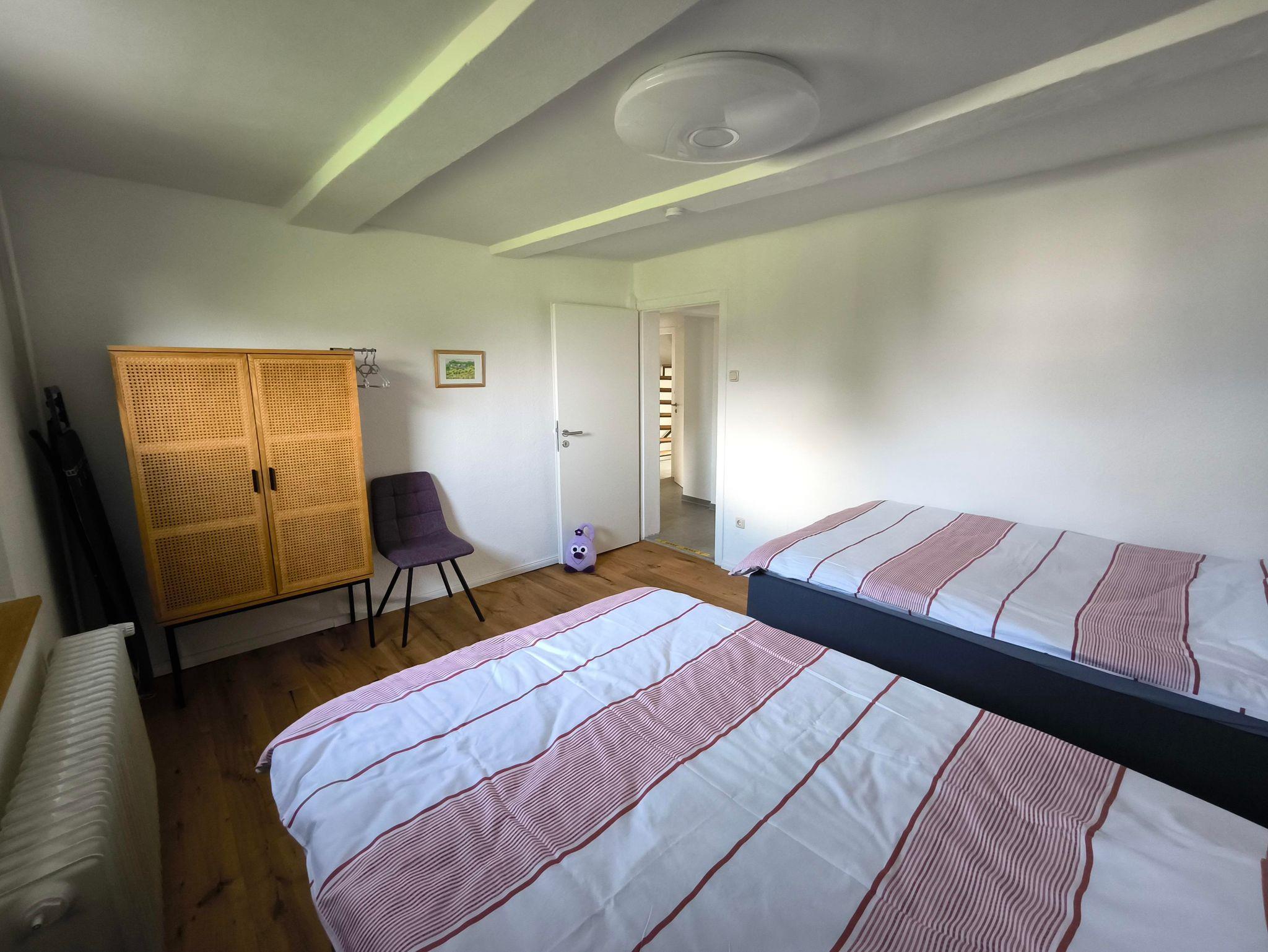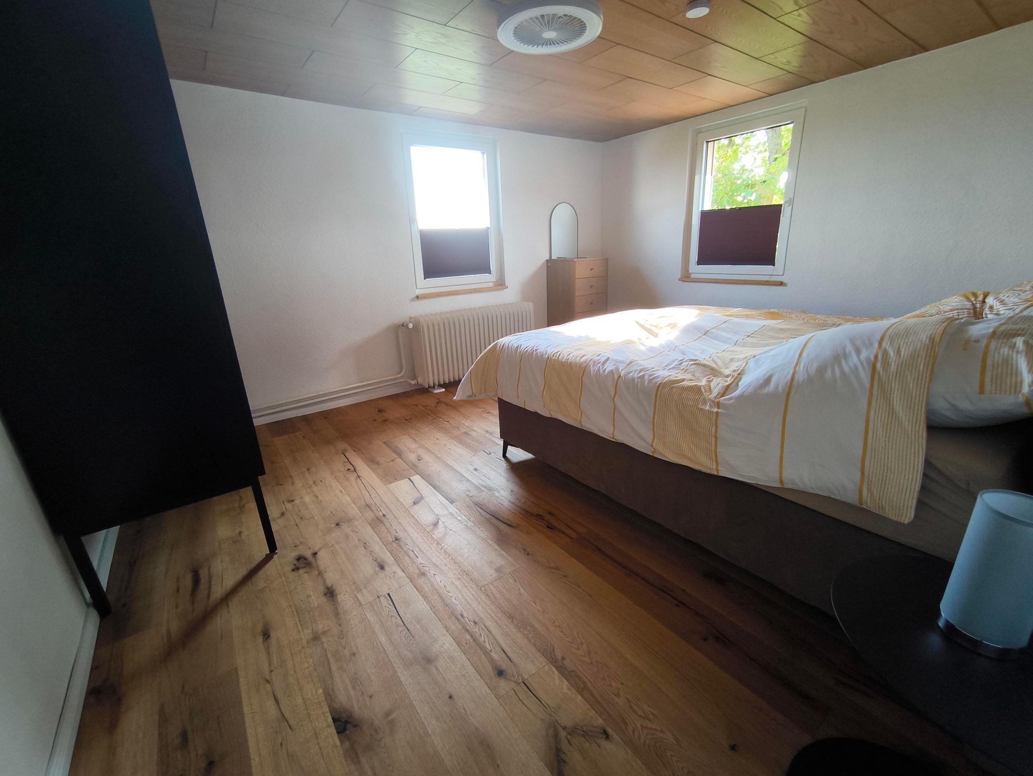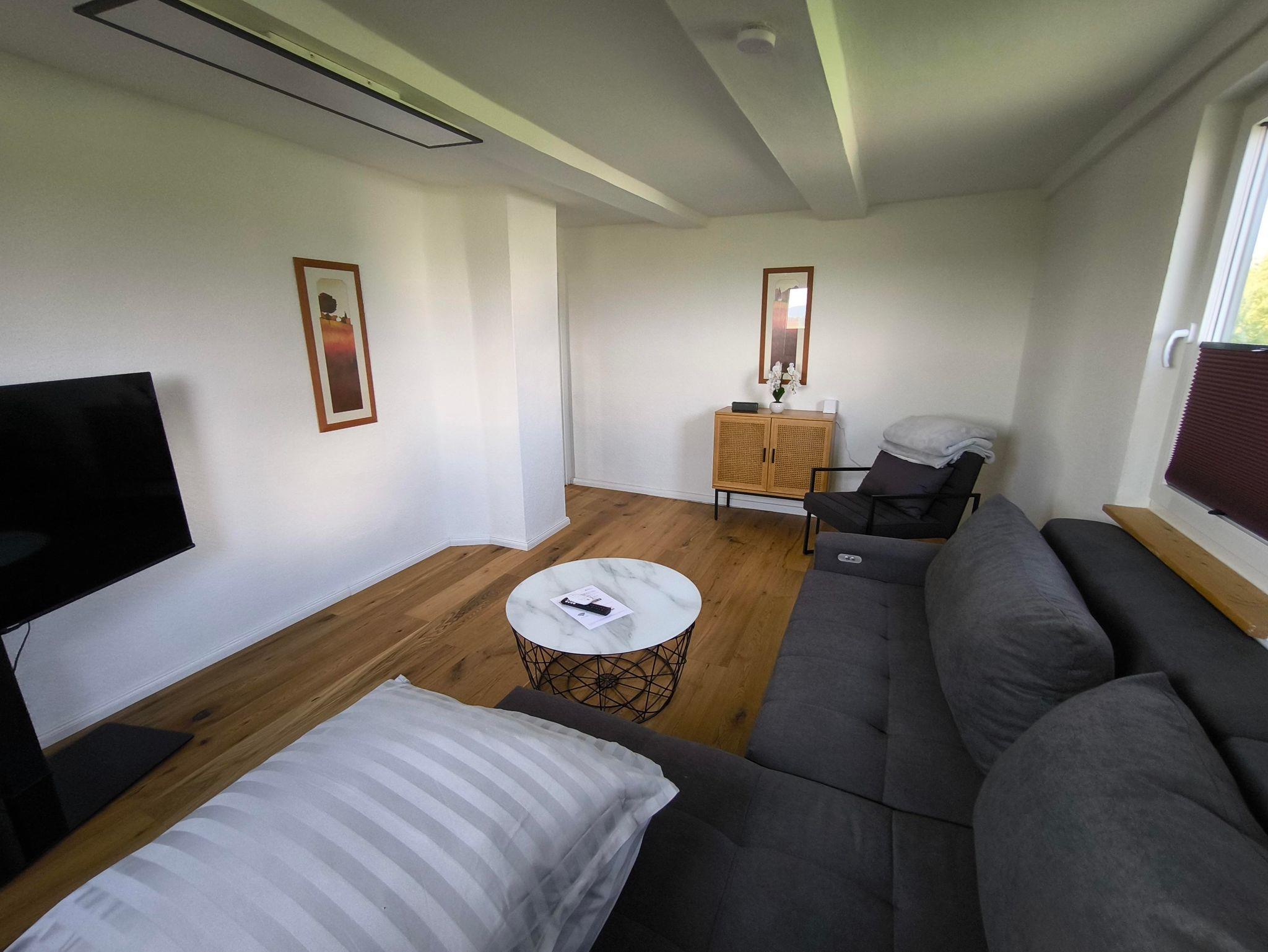 Unsere Ferienwohnung im Obergeschoss (85qm). Ein großzügiges Wohnzimmer (Ausziehsofa) und zwei Schlafzimmer (Elternschlafzimmer mit großem Doppelbett und ein Kinderschlafzimmer mit einem Einzelbett und einem Ausziehsofa) bieten bis zu 5 erwachsenen Personen ausreichend Platz für einen erholsamen Urlaub. Gemütlich kann man den Abend mit der ganzen Familie vor dem 55 Zoll großen TV ausklingen lassen.