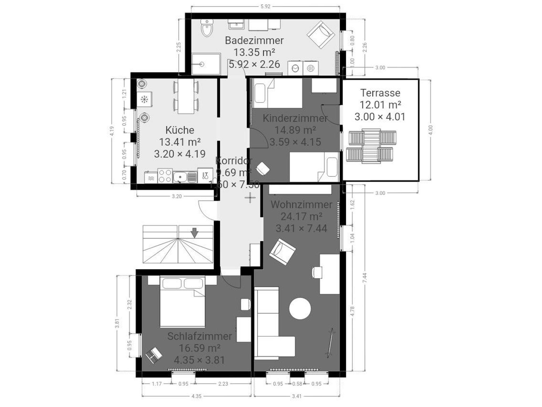 Die vollausgestatte moderne Küche (Induktionskochfeld, Ofen, Geschirrspüler, Microwelle, Kühlschrank mit Gefrierfach, etc.) ist groß genug, um mit der Familie nicht nur Essen zuzubereiten, sondern auch gemütlich zu speisen. Diese Wohnung bietet auf der Etage einen kleinen Wintergarten mit sehr schönem Ausblick.