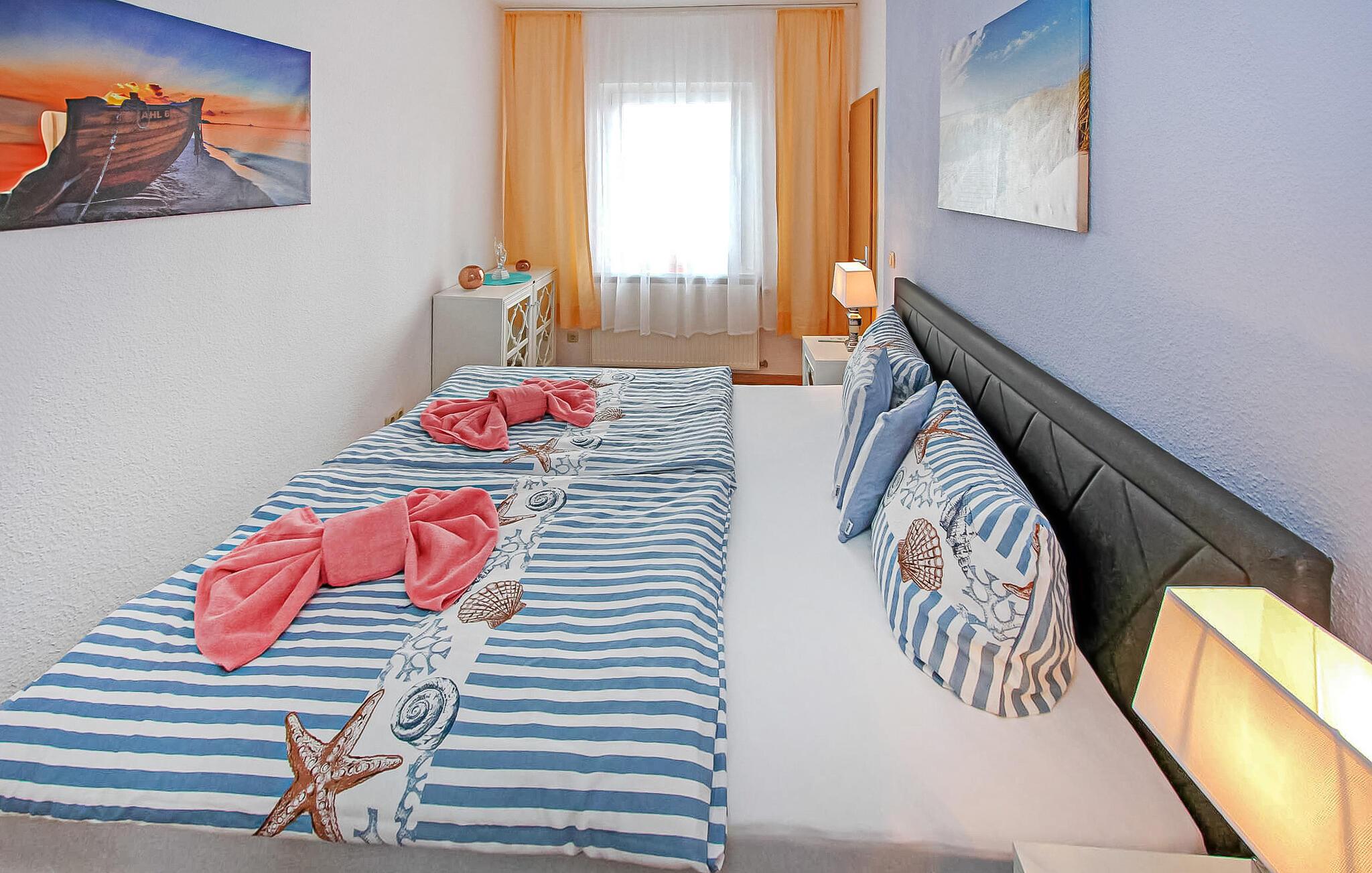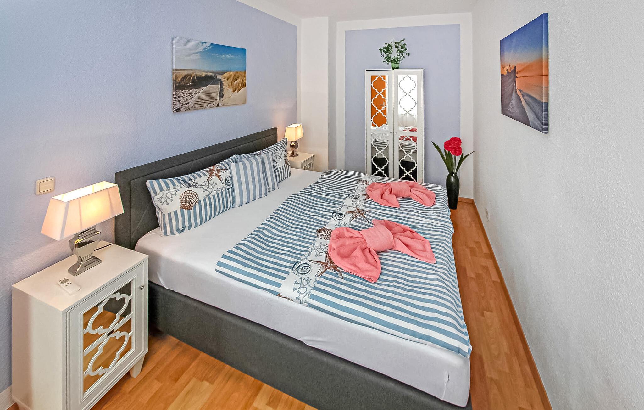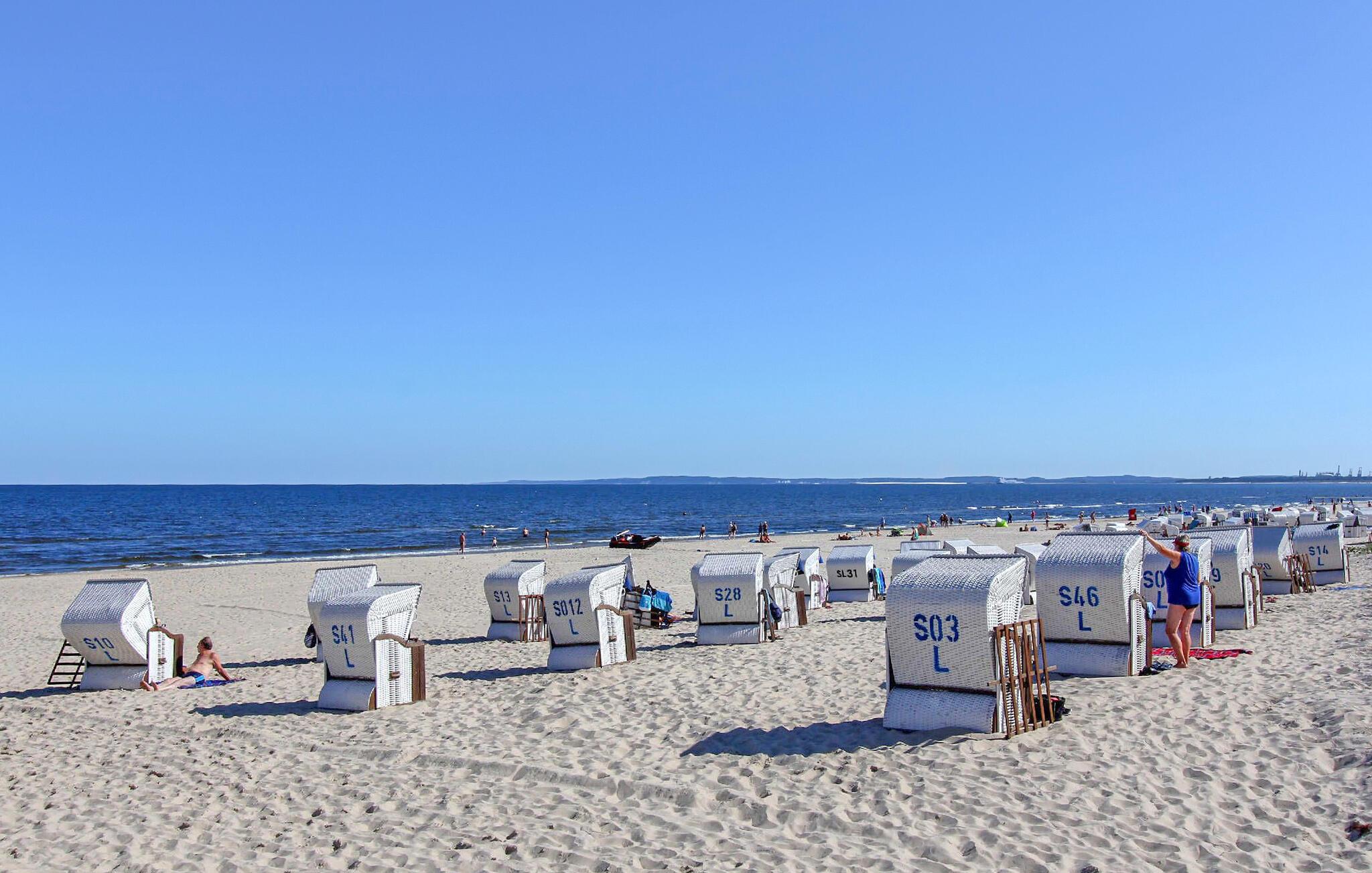 Denne ferielejlighed og tre lejligheder ligger i stueetagen og øverste etage i en separat ferielejlighed i gården til en badevilla, kun cirka 200 m fra Ahlbeck-molen og Østersøstranden. Butikker og restauranter ligger inden for få hundrede meter. På det udendørs område er der et lille overdækket opholdsområde, en grill, to strandstole til fælles brug samt et cykelrum og en parkeringsplads (fra 2024 mod et gebyr på EUR 3,00/dag). Den samlede pris inkluderer slutrengøring, sengelinned, håndklæder samt vand- og energiforbrug. Da Østersøferiestedet Ahlbeck er et spa-/rekreativt feriested, opkræves en turistskat på stedet. Ferielejligheden ligger på øverste etage i feriehuset. Adgang via separat udvendig trappe. Faciliteter med stue (polstret opholdsområde inkl. sovesofa, TV, radio), soveværelse (dobbeltseng), køkken med tekøkken og spiseplads, bad/toilet, centralvarme, udendørs opholdsområde. Indkvarteringen er ikke egnet til babyer eller små børn. Badebyerne Bansin, Heringsdorf og Ahlbeck er de såkaldte kejserlige feriesteder på øen Usedom. De har brede sandstrande, moler med moler og er forbundet med hinanden af en promenade, der fører til Swinoujscie i Polen. I byerne er der leje af cykler, båd og strandstole, tennisbaner og et netværk af godt afmærkede vandrestier. Et moderne vandland, "Ostseetherme", ligger centralt mellem Heringsdorf og Ahlbeck. Grænseovergangen til Polen kan nås fra Ahlbeck på få minutter.