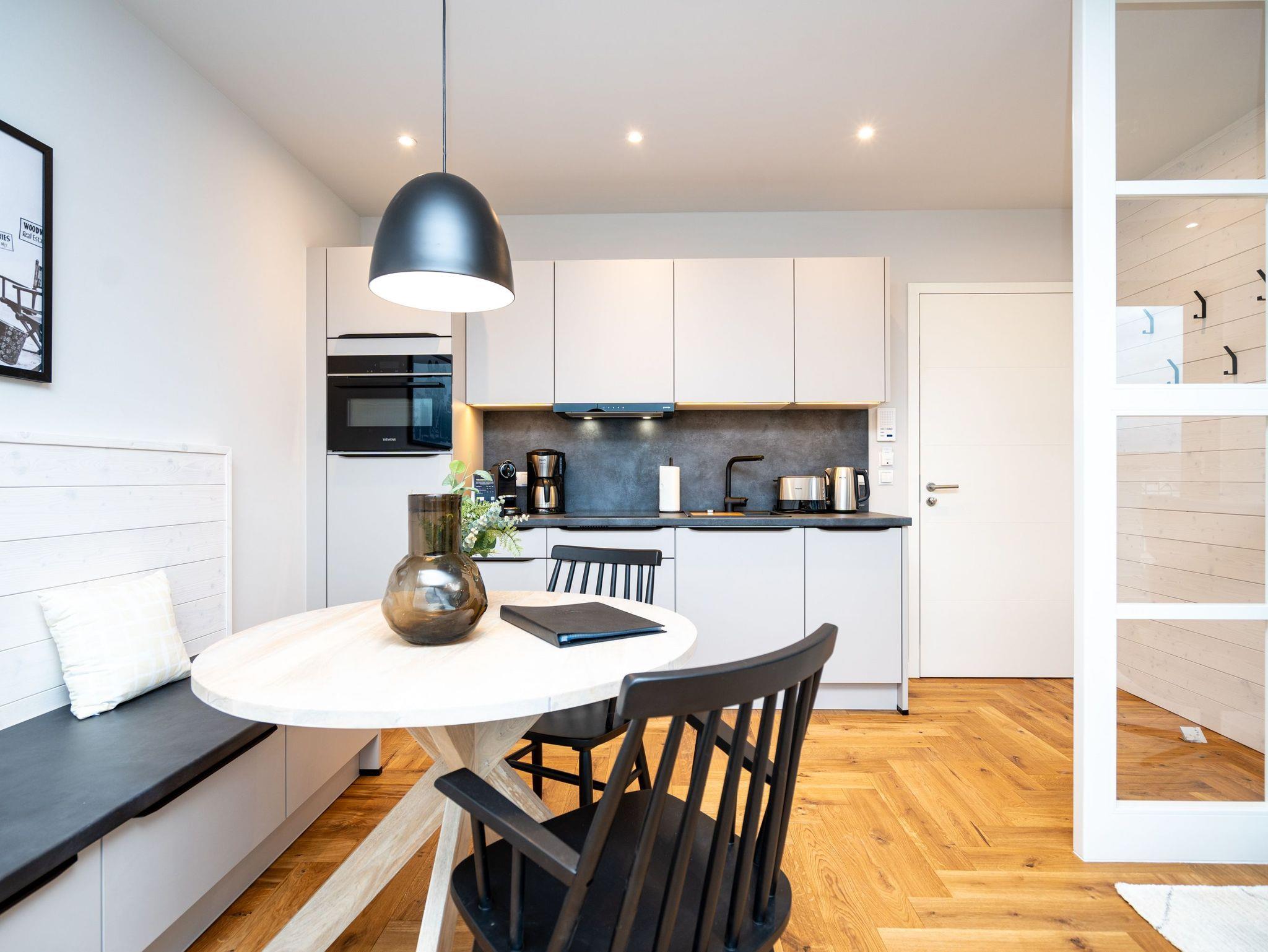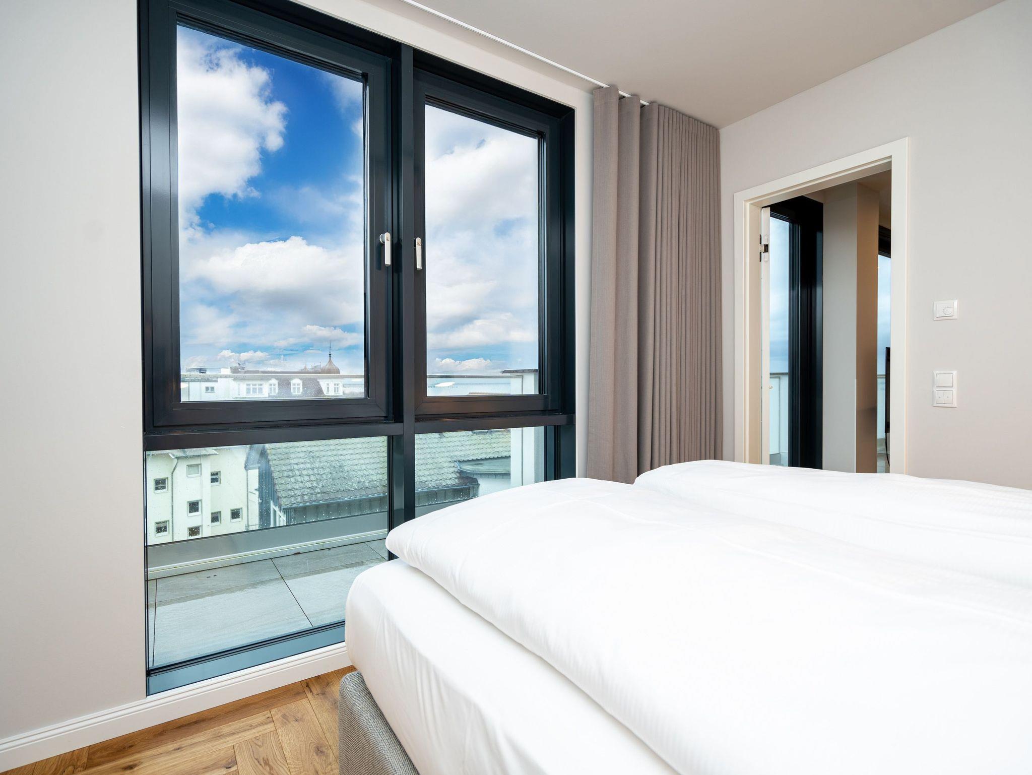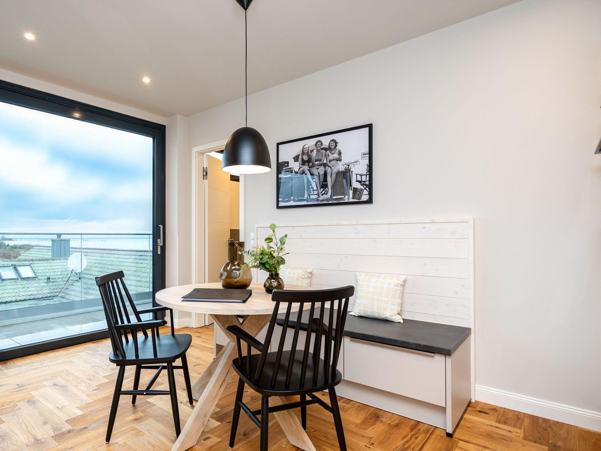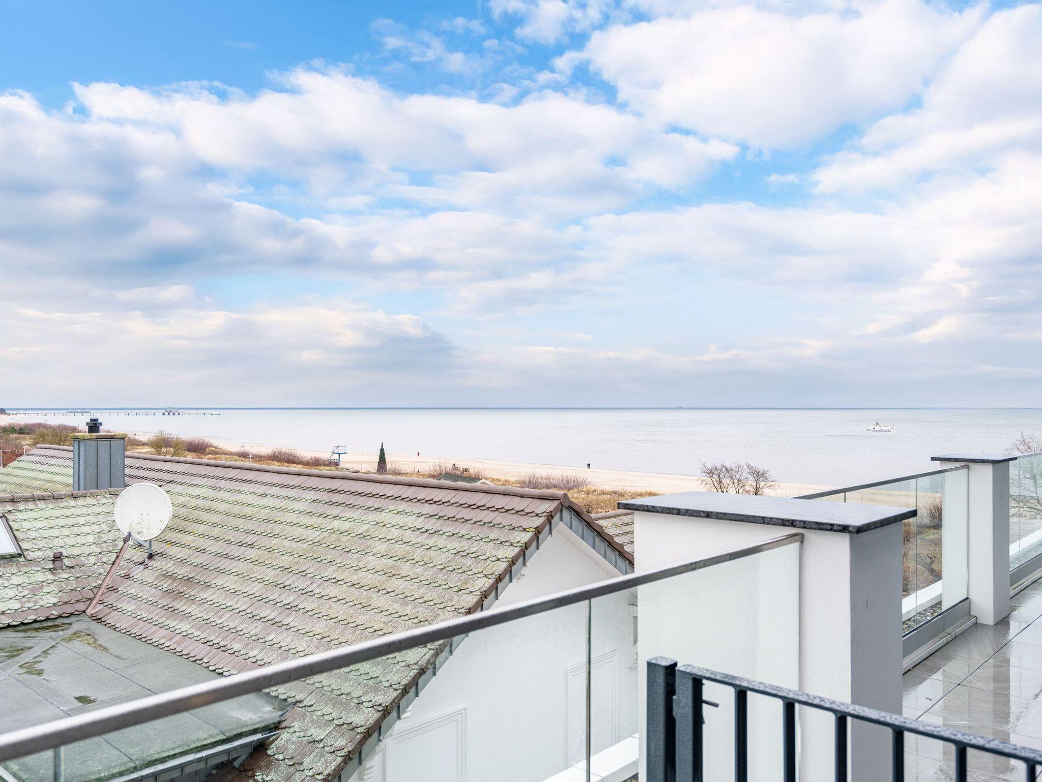 Willkommen im Penthouse-Appartement. 4.1! Dieses exklusive Appartement befindet sich im Penthouse des Hauses A auf der 4. Etage und begeistert mit einer stilvollen Einrichtung sowie einem atemberaubenden Meerblick über die Dächer von Ahlbeck. Auf 49 m² finden 2 Personen alles, was das Herz begehrt, um den Urlaub entspannt zu genießen. Der offene Wohnbereich mit edlem Echtholzparkett lädt zum Verweilen ein: Machen Sie es sich in den drehbaren Relaxsesseln bequem, die Füße entspannt auf dem Hocker, und genießen Sie Ihre Lieblingssendung auf dem 50-Zoll-Flat-TV oder lassen Sie einfach die Seele baumeln beim traumhaften Blick über die Ostsee. Die moderne Küchenzeile ist perfekt ausgestattet ? mit einem 3-Platten-Induktionsherd, Backofen mit Mikrowellenfunktion, Spülmaschine und allem, was Sie für Ihre kulinarischen Abenteuer benötigen. Der angrenzende Essbereich mit Sitzbank, Esstisch und zwei Stühlen bietet den idealen Ort für gemütliche Mahlzeiten. Das separate Schlafzimmer verspricht erholsame Nächte im komfortablen Boxspringdoppelbett (1,80 m x 2,00 m). Ein geräumiger Kleiderschrank und ein weiterer 43-Zoll-Flat-TV sorgen für zusätzlichen Komfort. Vom Wohnbereich haben Sie Zugang zur großzügigen Nord-West-Dachterrasse, wo Sie herrliche Sonnenuntergänge erleben können. Das moderne Tageslichtbad mit Dusche, Toilette und Waschtisch rundet das Angebot perfekt ab. Natürlich steht Ihnen kostenfreies WLAN zur Verfügung, und Ihr Auto parkt sicher auf dem Tiefgaragenstellplatz. Erleben Sie unvergessliche Tage an der Ostsee in dieser traumhaften Ferienwohnung ? wir freuen uns auf Sie!