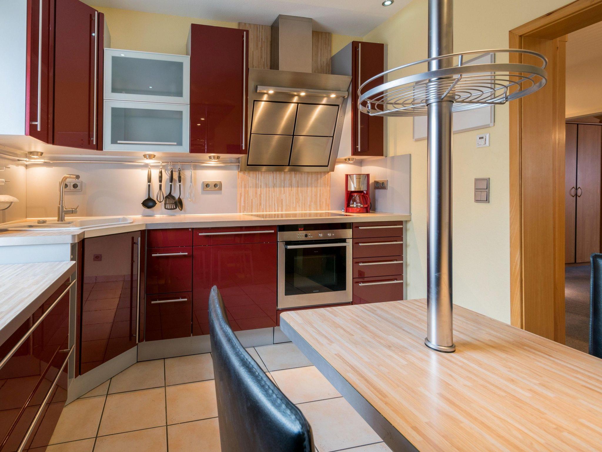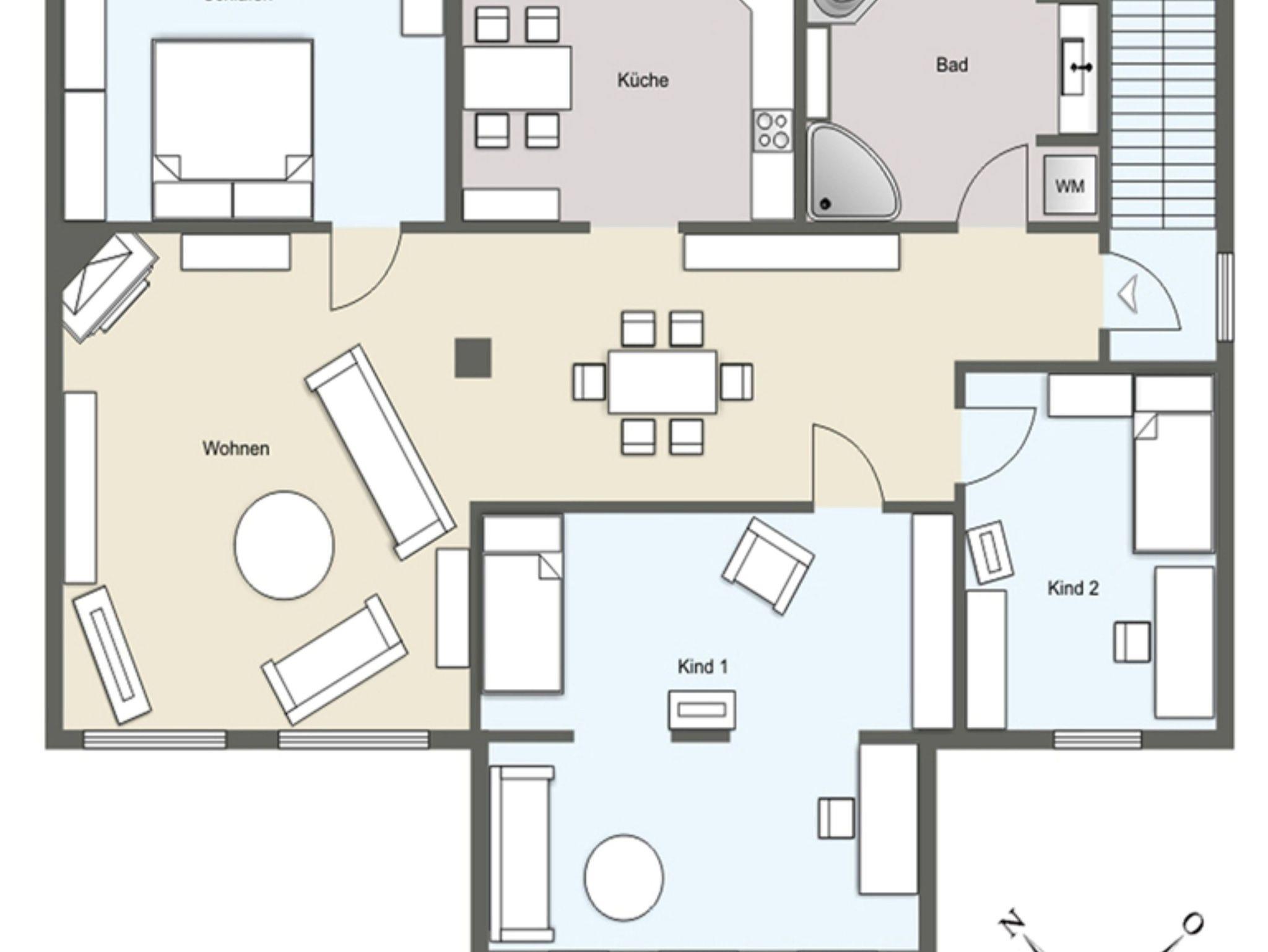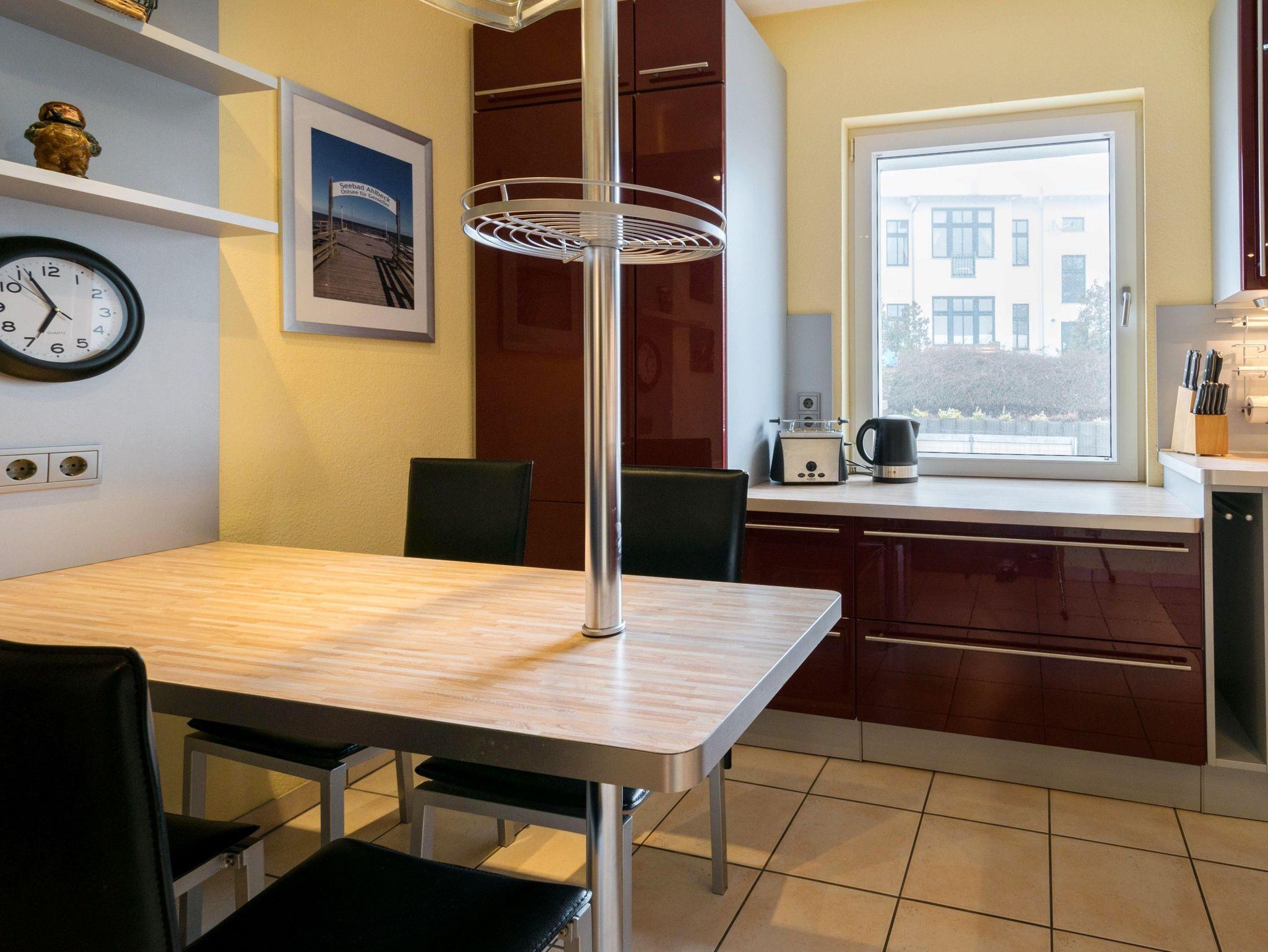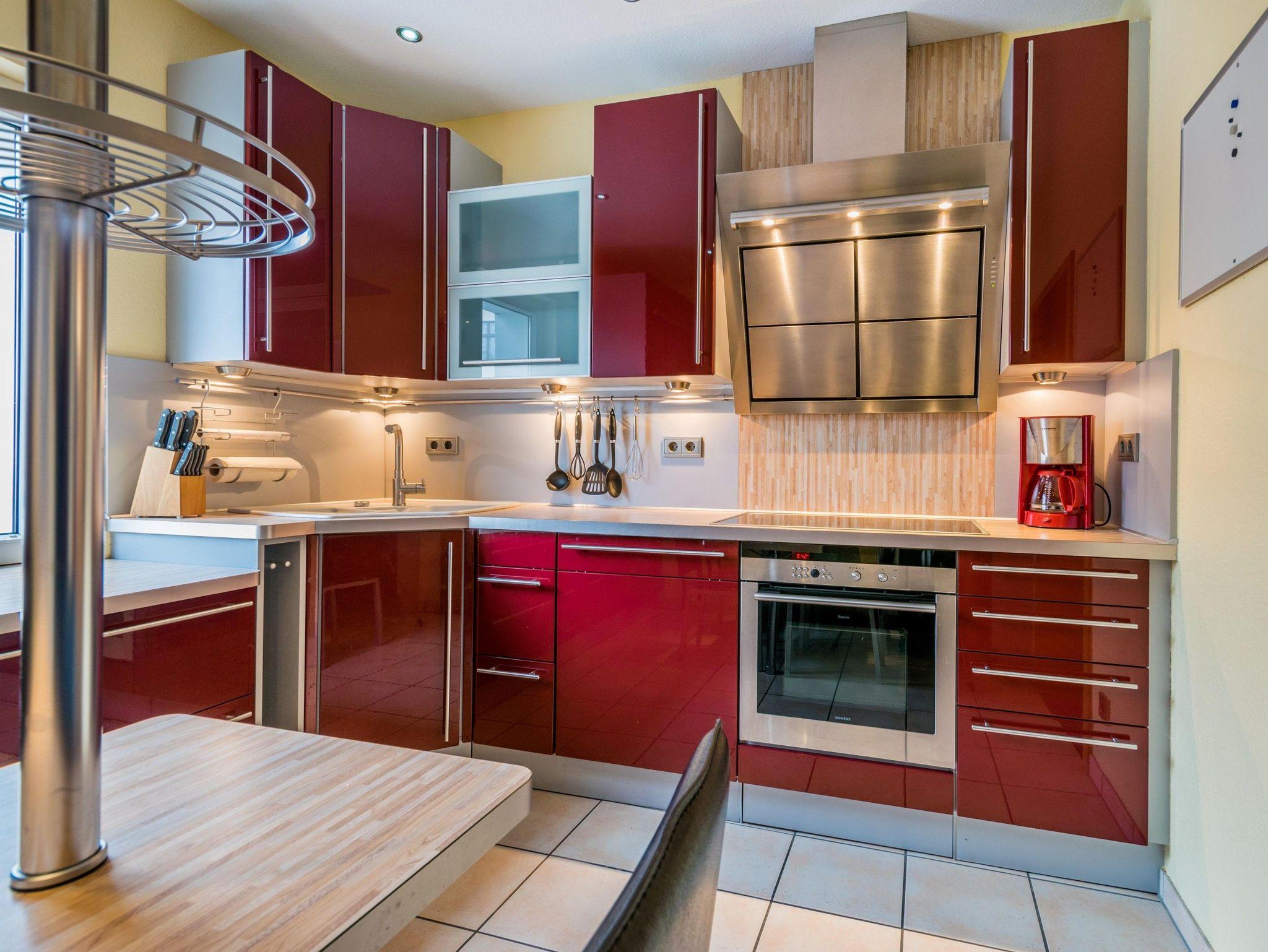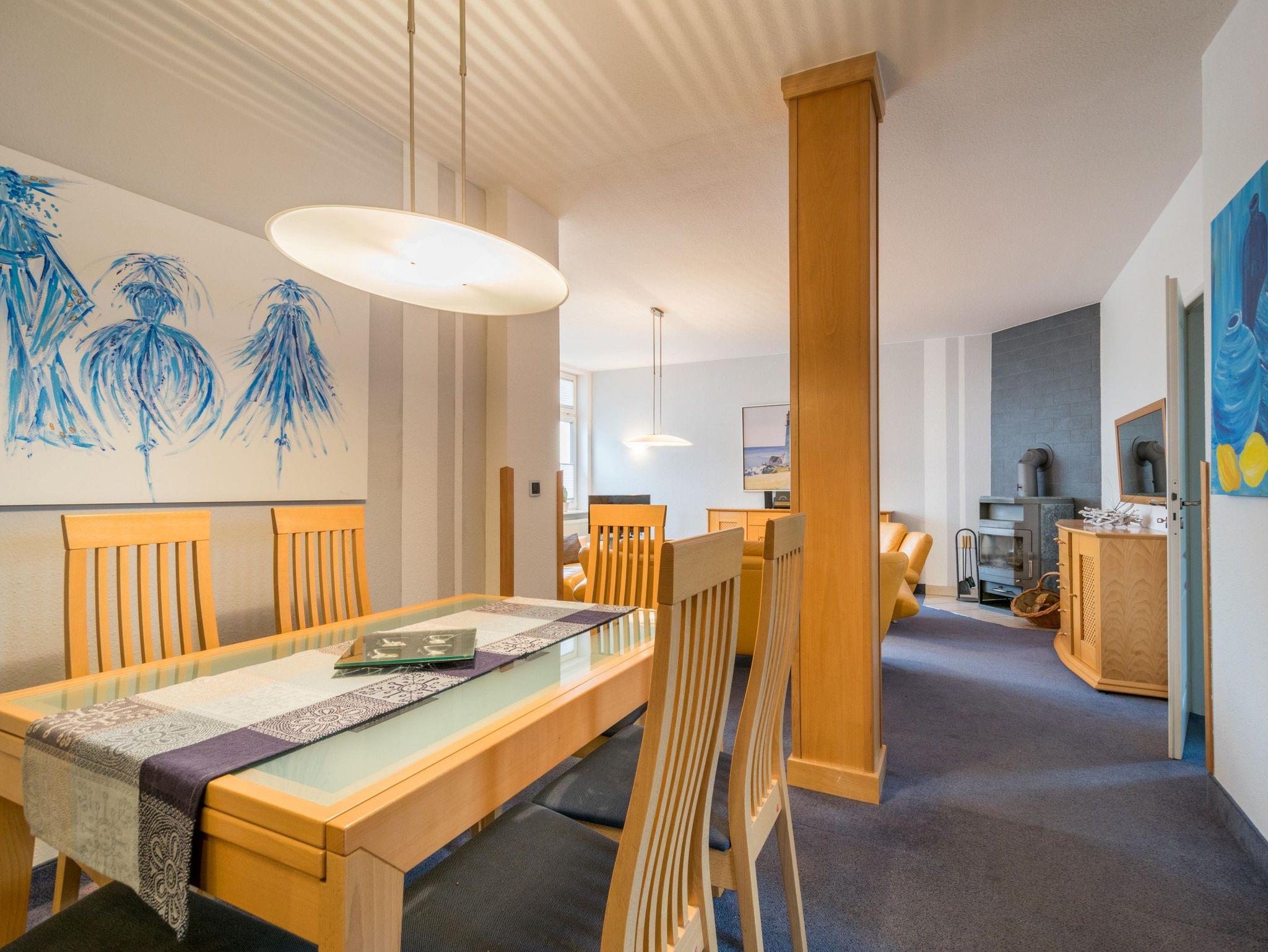 Die großzügig geschnittene Wohnung mit 95 qm befindet sich im ersten Obergeschoss und bietet Platz für bis zu 6 Personen. Sie verfügt über einen großen Wohnraum mit gemütlicher Couchlandschaft sowie Kamin und Essbereich. Eine voll ausgestattete Küche mit Backofen mit Mikrowellenfunktion, Spülmaschine, Kühlschrank (mit Gefrierabteil) sowie Kaffeemaschine, Wasserkocher und Toaster ist vorhanden.