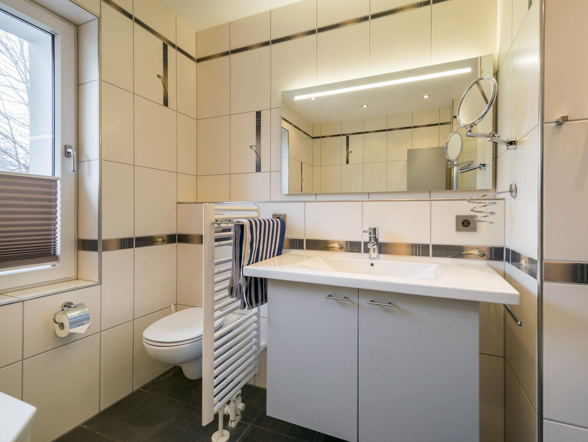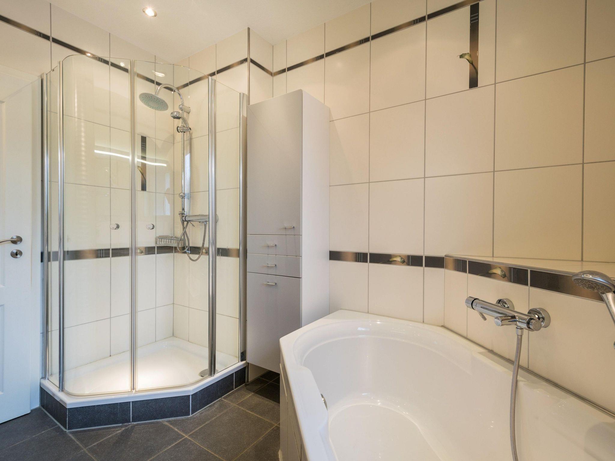 Tageslichtbad mit ebenerdiger Dusche und Badewanne. Sie haben WLAN und einen Parkplatz vor dem Haus.