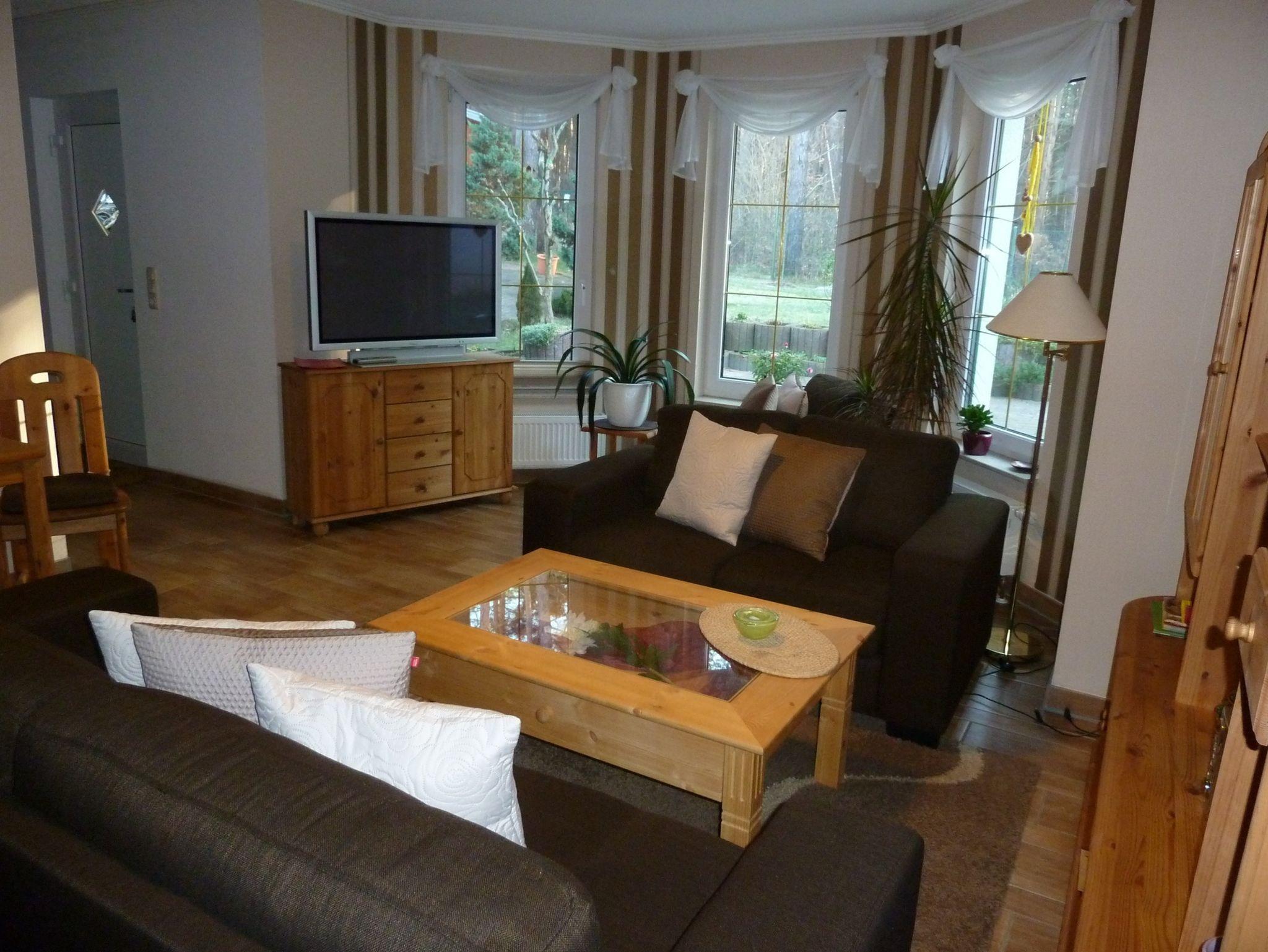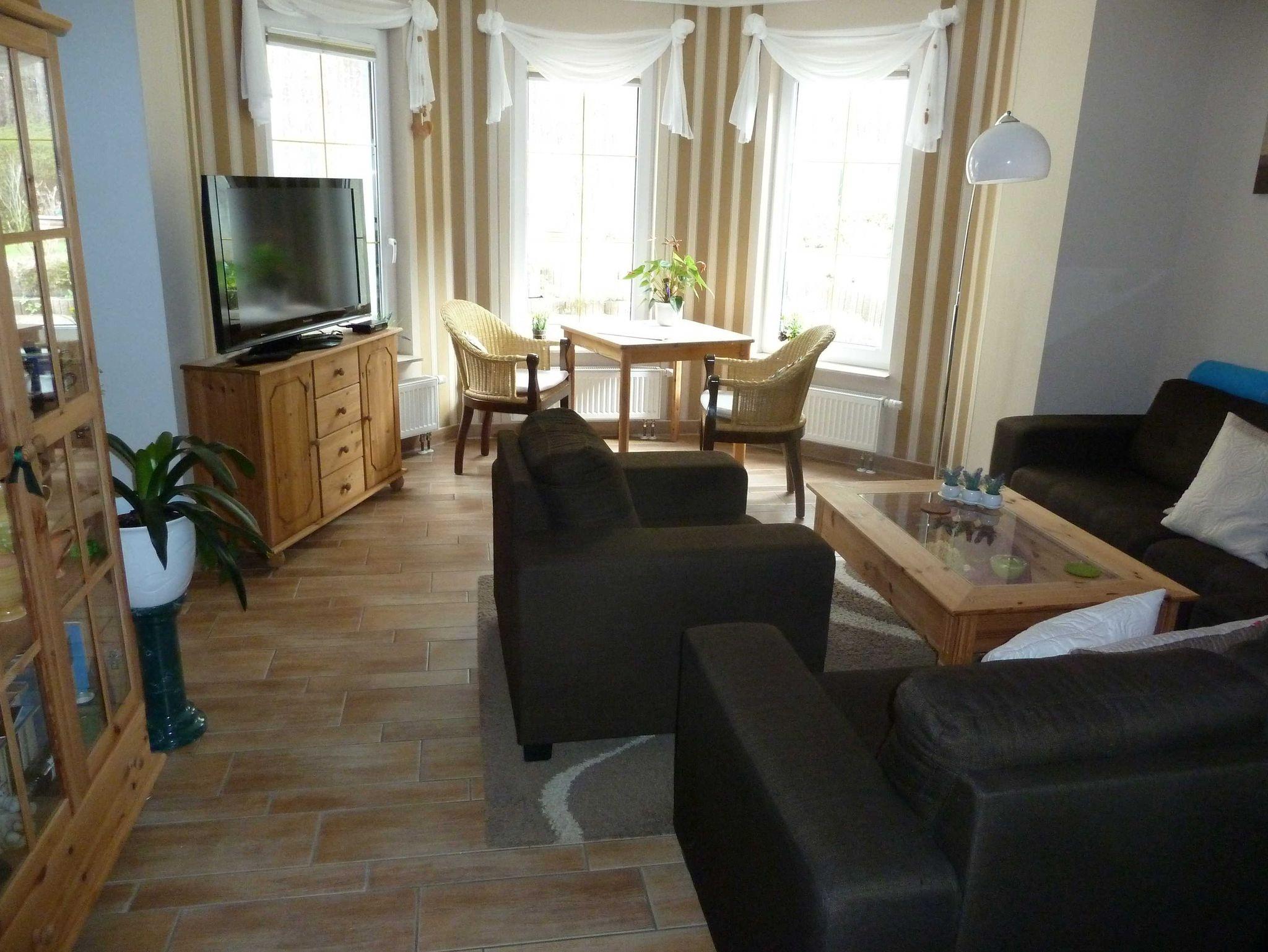 - Wohnzimmer; gemütlicher Erker mit Sitzgruppe2-Sitzer, 3-Sitzer und Sessel, Essecke, Kabel - TV, Radio, CD-Spieler