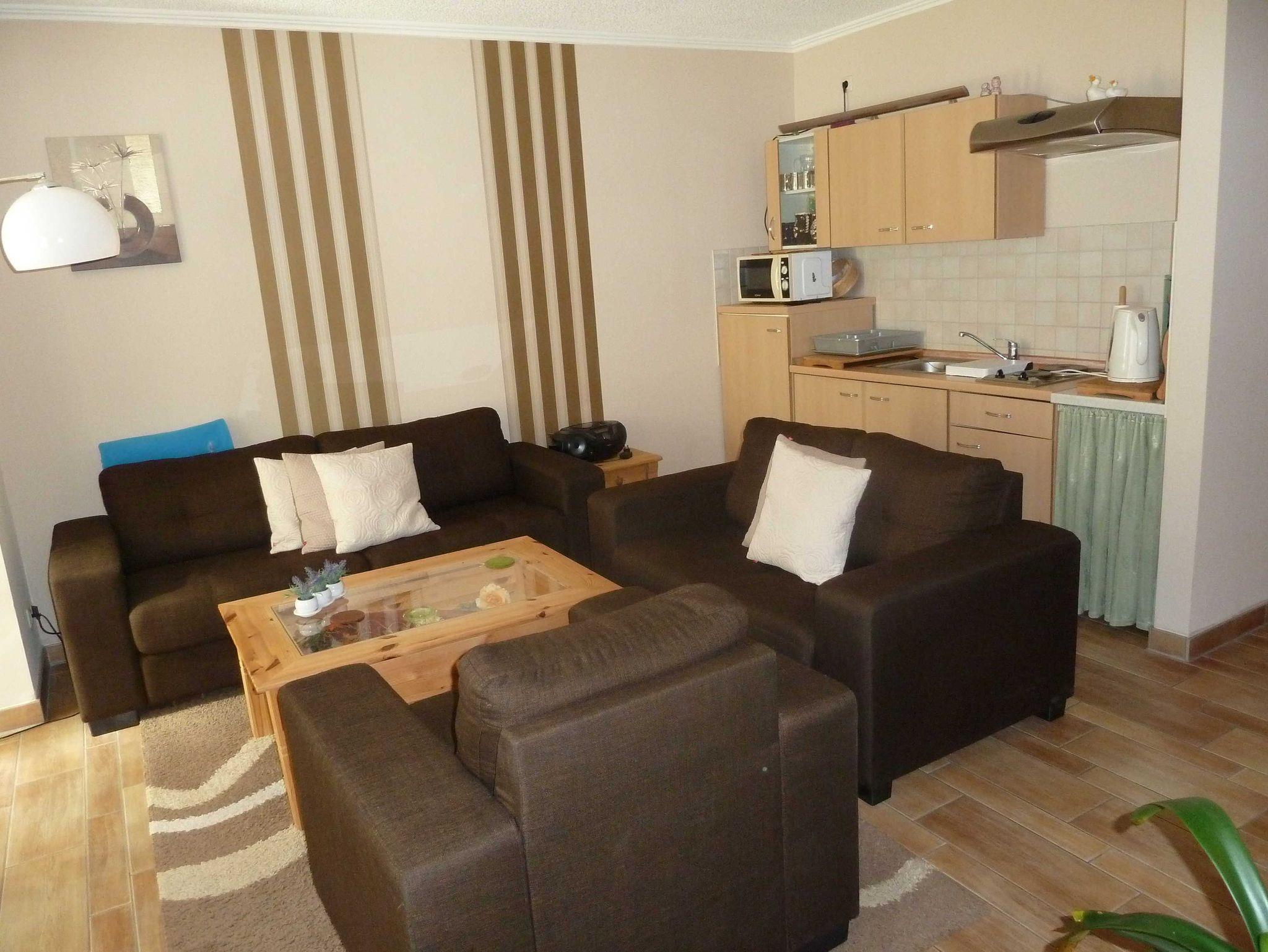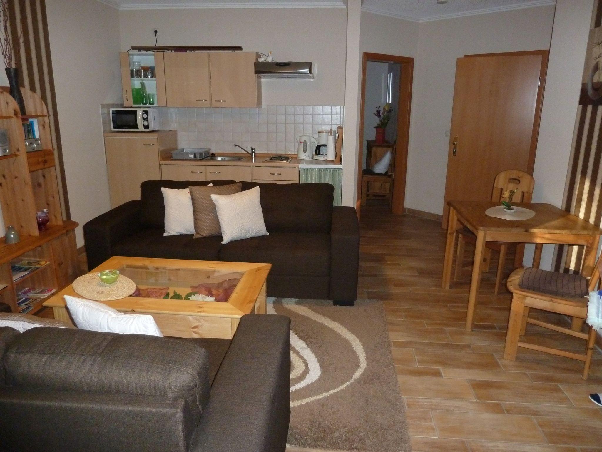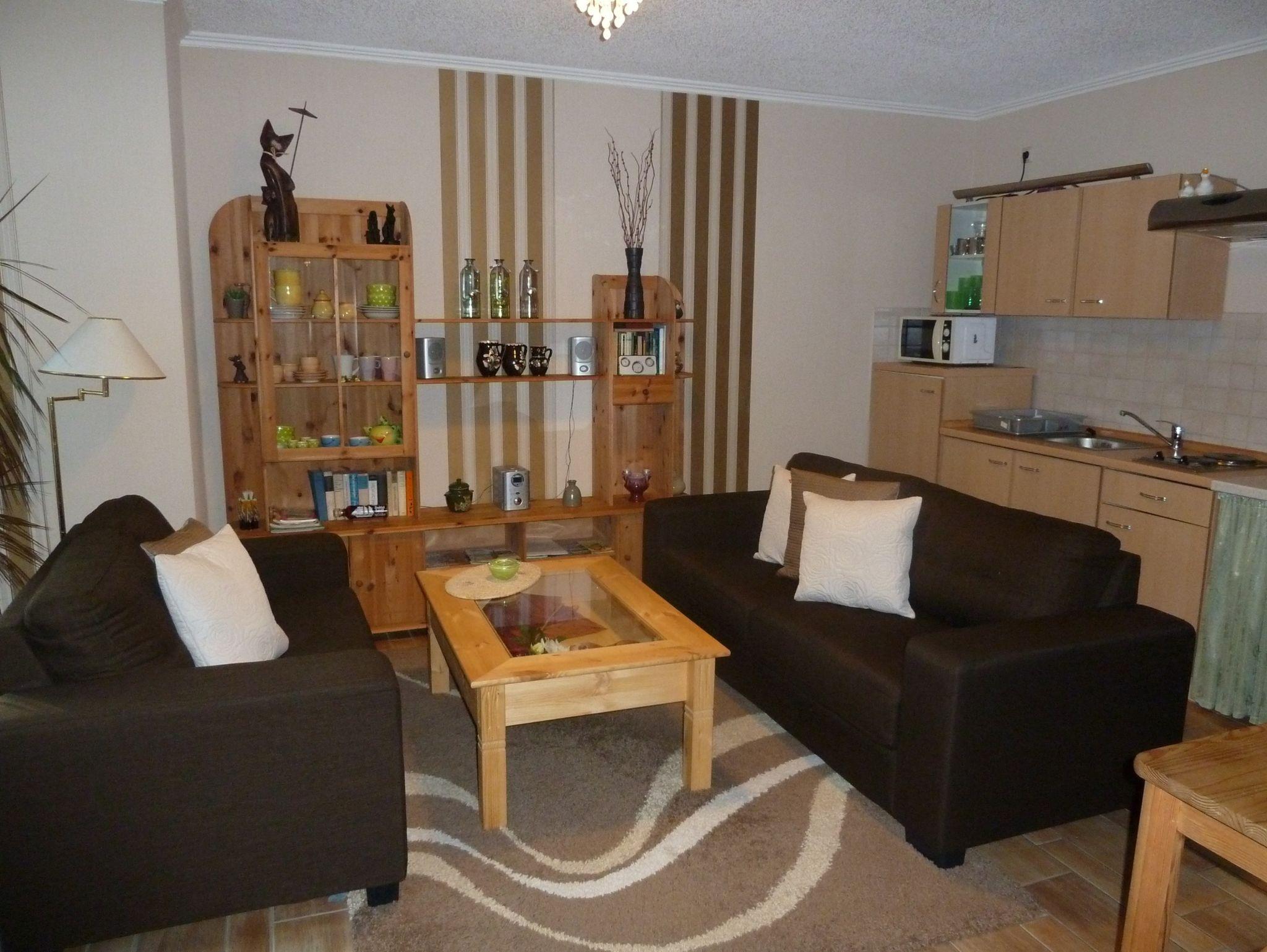 Die Ferienwohnung ist ca. 50 qm groß und ideal für 2 Personen. 1 Aufbettung mit Beistellbett. - Küchenzeile, großer Kühlschrank, 2-Platten Herd, Spüle, Mikrowelle und sämtliches Küchenzubehör