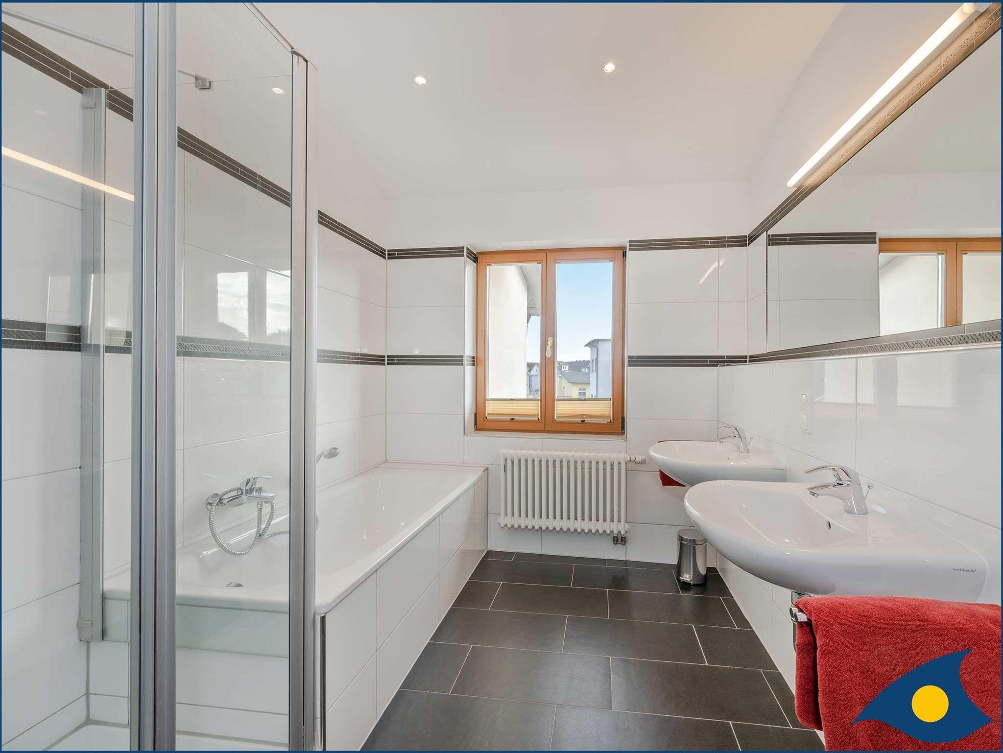 Das Tageslicht-Badezimmer überzeugt mit Badewanne und Dusche sowie zwei Waschbecken und Bidet.