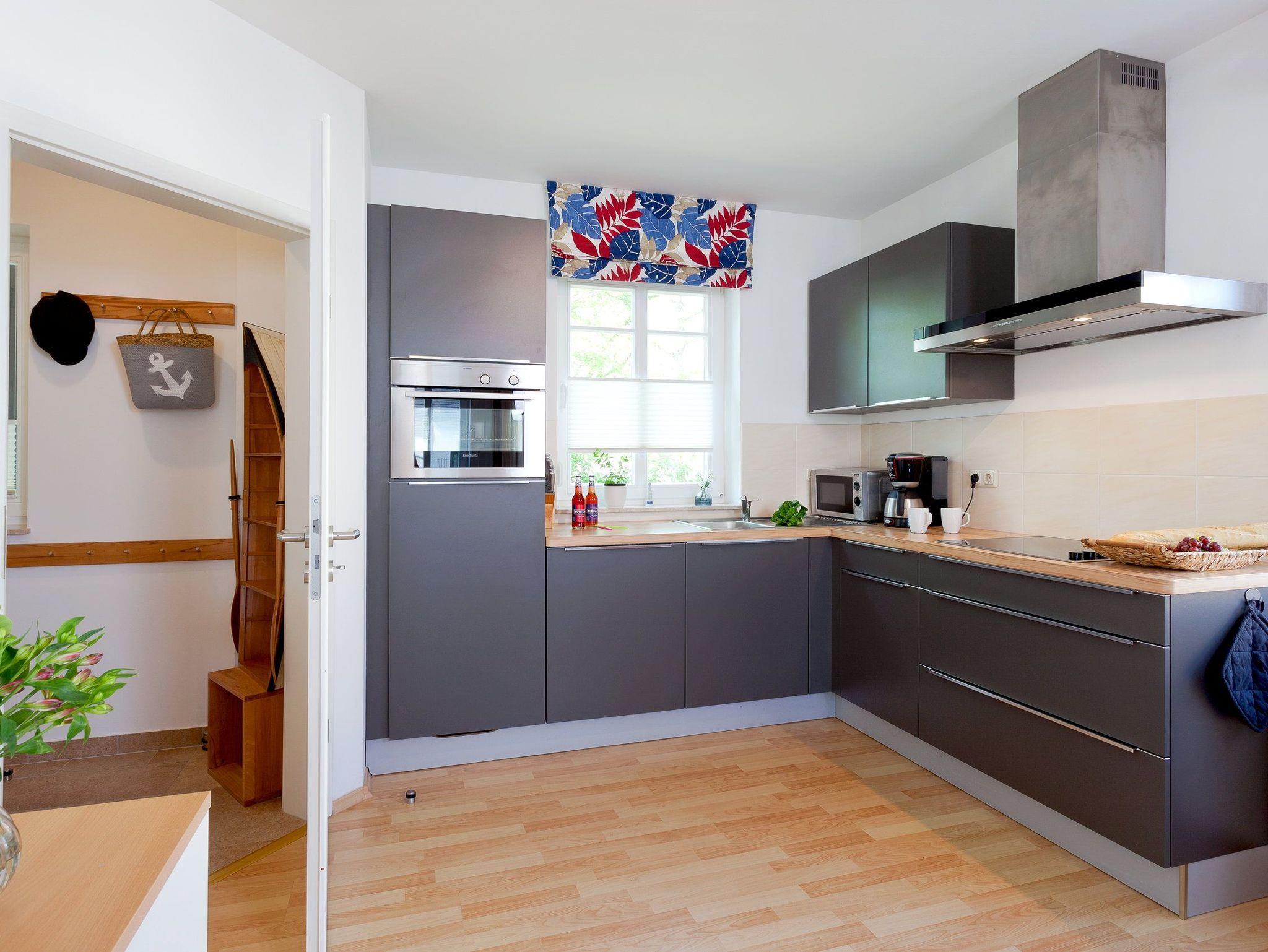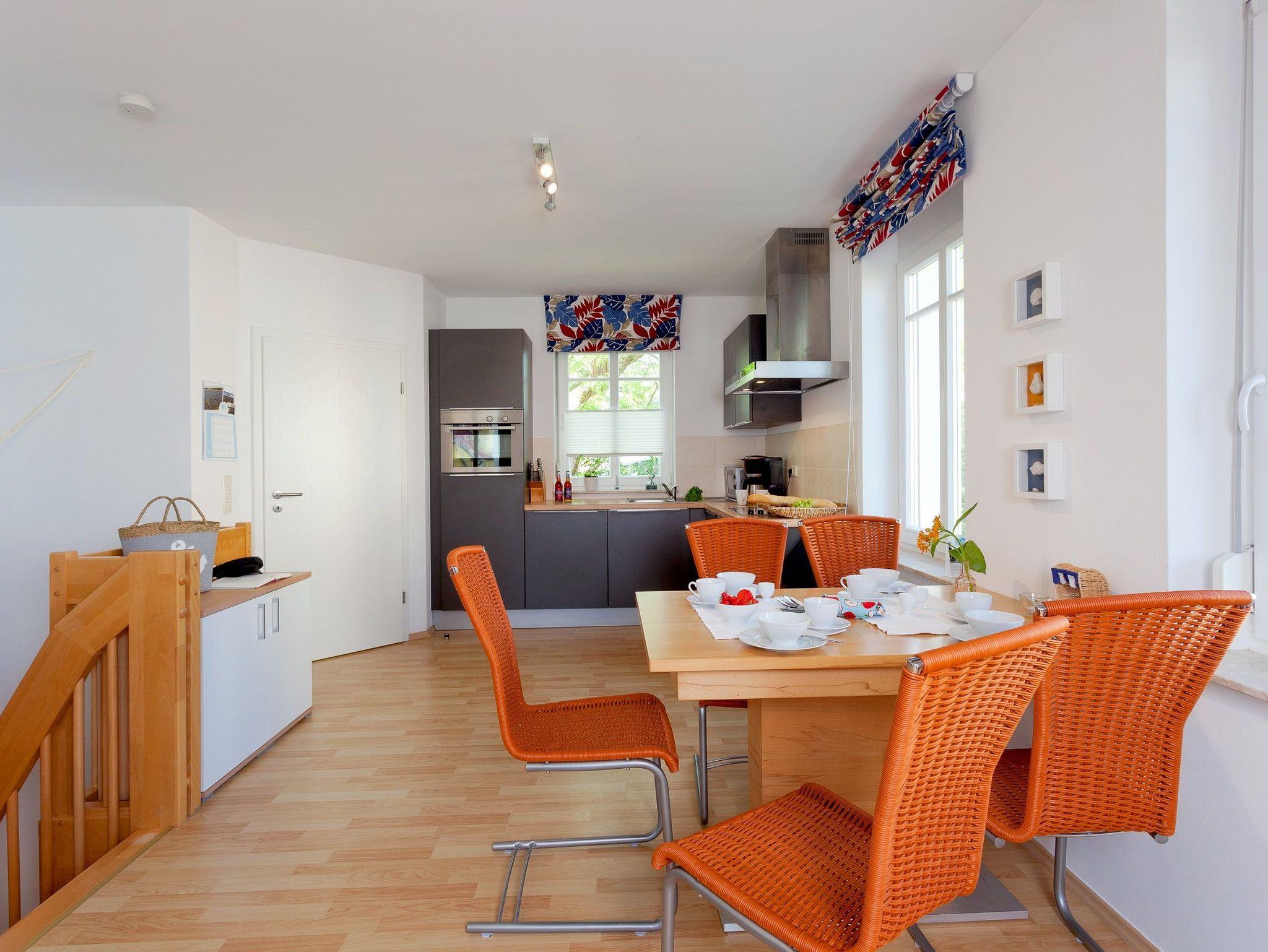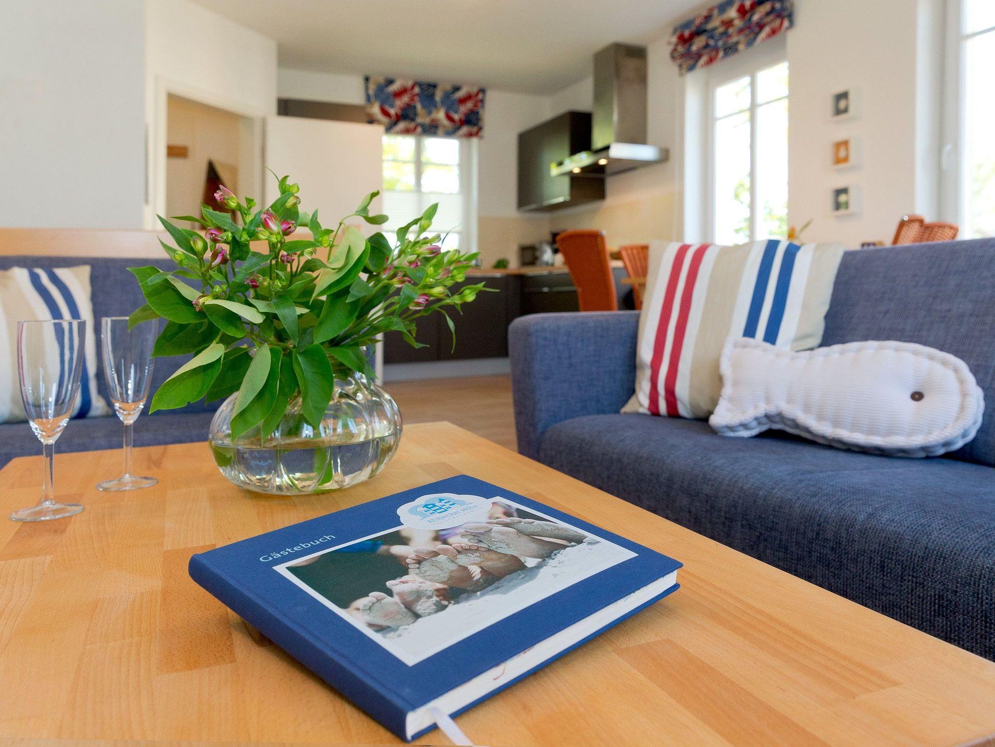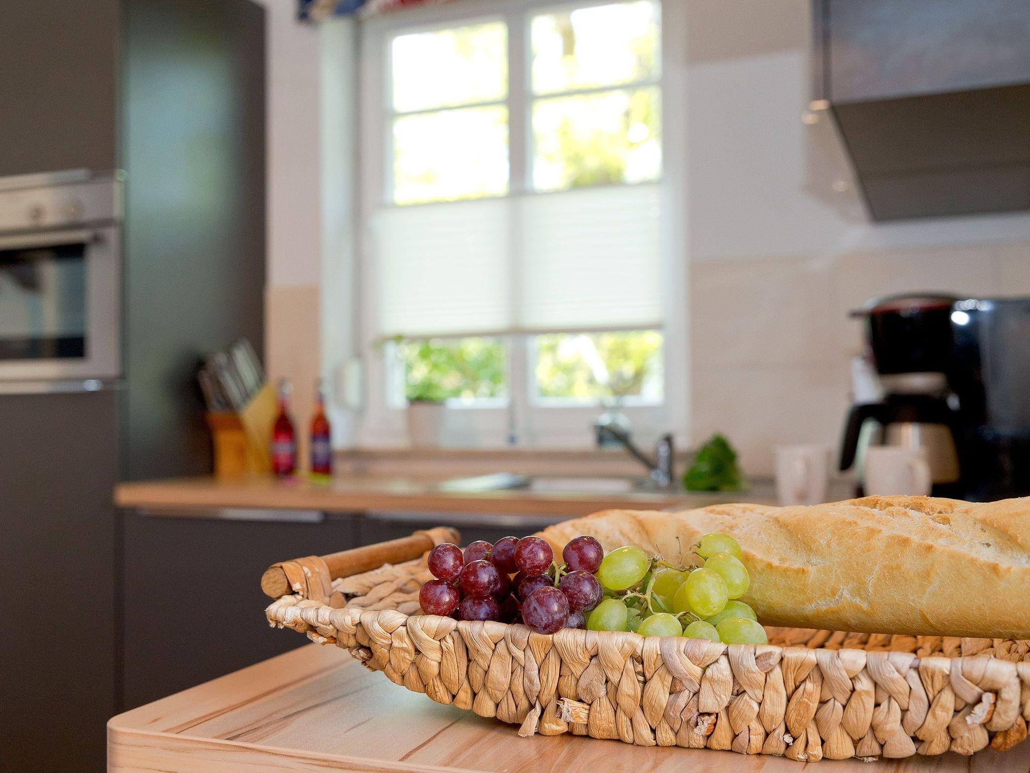 Der Wohnbereich verfügt über eine gemütliche Couch (mit Ausziehfunktion für Aufbettung) mit Leselampe, Flachbild-TV (32 Zoll), CD / DVD / Bluray 2.1 Dolby System sowie einen Esstisch mit Schwingstühlen. Vom Wohnbereich gelangen Sie auf Ihren Balkon mit Zugang zum Garten. Die im Wohnbereich integrierte komplett ausgestattete Einbauküche verfügt zudem über Kühlschrank, Mikrowelle, Cerankochfeld (4 Platten), Backofen, Spülmaschine, Wasserkocher, Toaster, Kaffeemaschine (4er Filter), Messerblock.