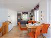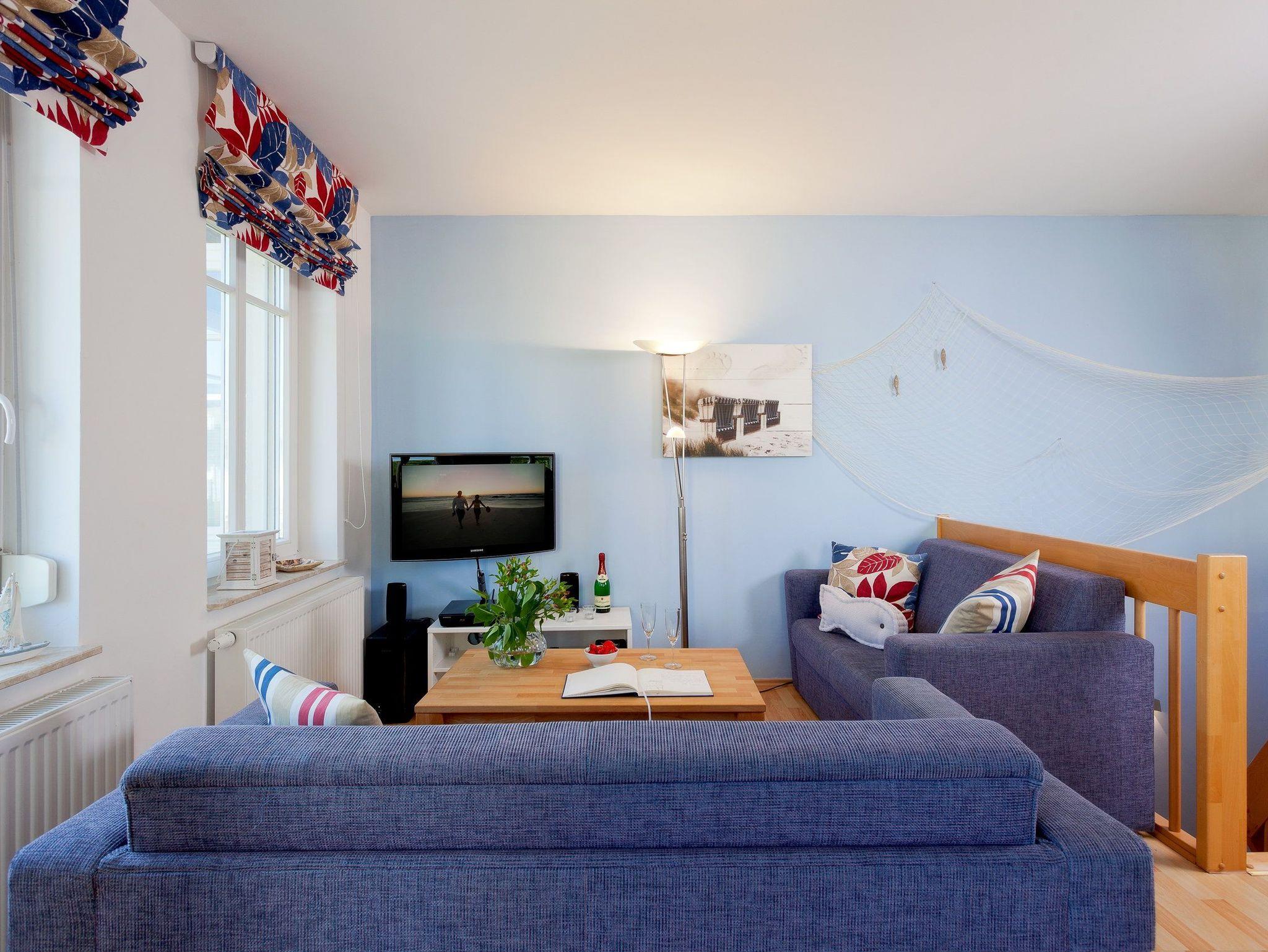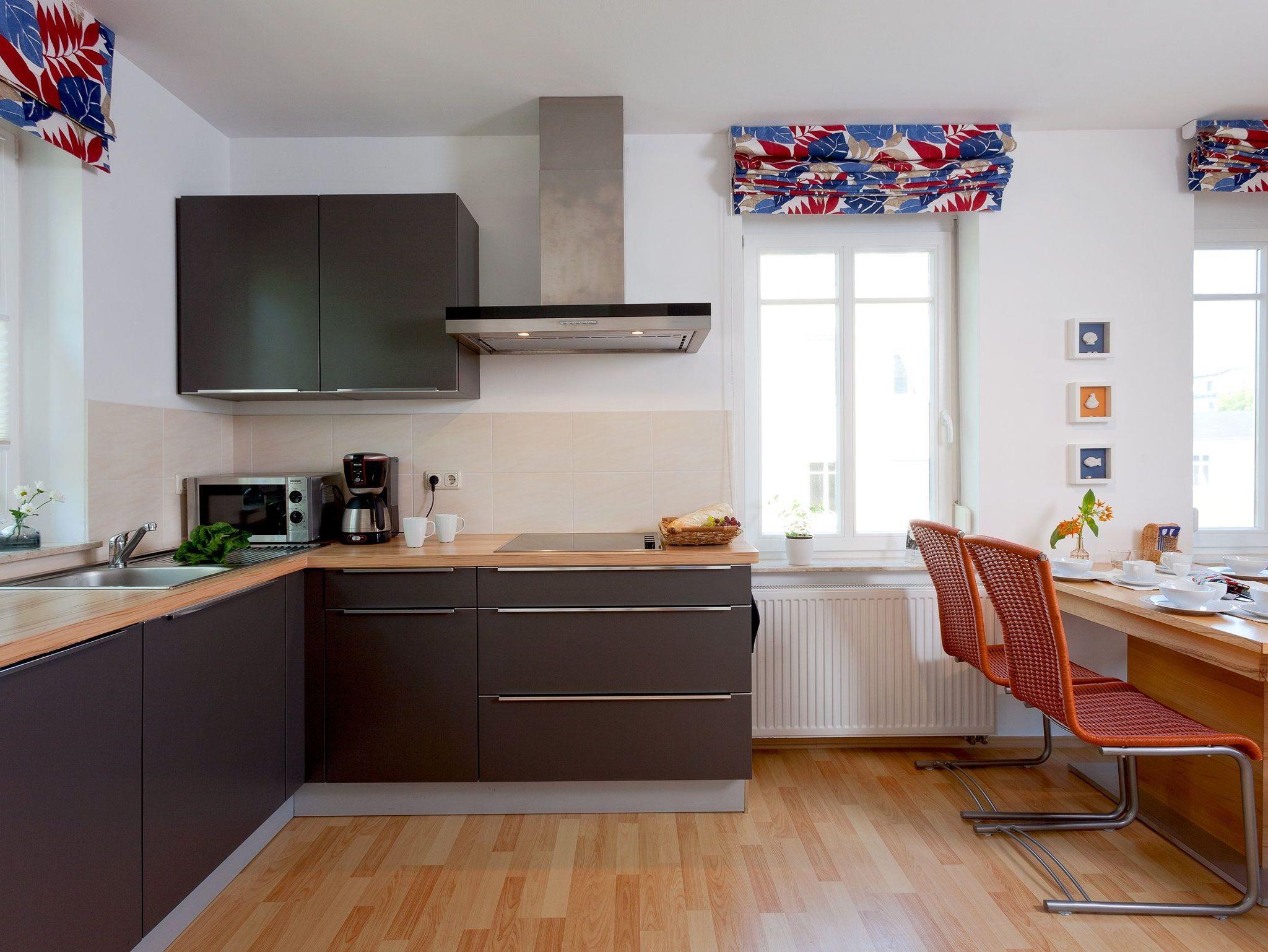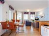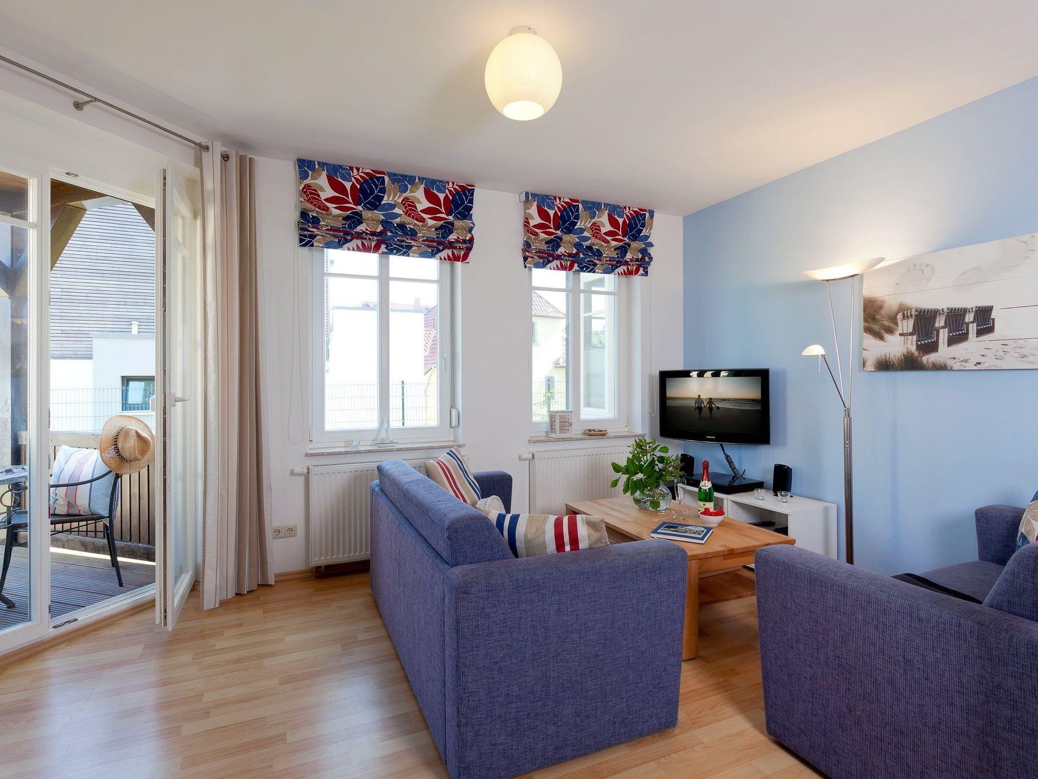 Der Wohnbereich verfügt über eine gemütliche Couch (mit Ausziehfunktion für Aufbettung) mit Leselampe, Flachbild-TV (32 Zoll), CD / DVD / Bluray 2.1 Dolby System sowie einen Esstisch mit Schwingstühlen. Vom Wohnbereich gelangen Sie auf Ihren Balkon mit Zugang zum Garten. Die im Wohnbereich integrierte komplett ausgestattete Einbauküche verfügt zudem über Kühlschrank, Mikrowelle, Cerankochfeld (4 Platten), Backofen, Spülmaschine, Wasserkocher, Toaster, Kaffeemaschine (4er Filter), Messerblock.