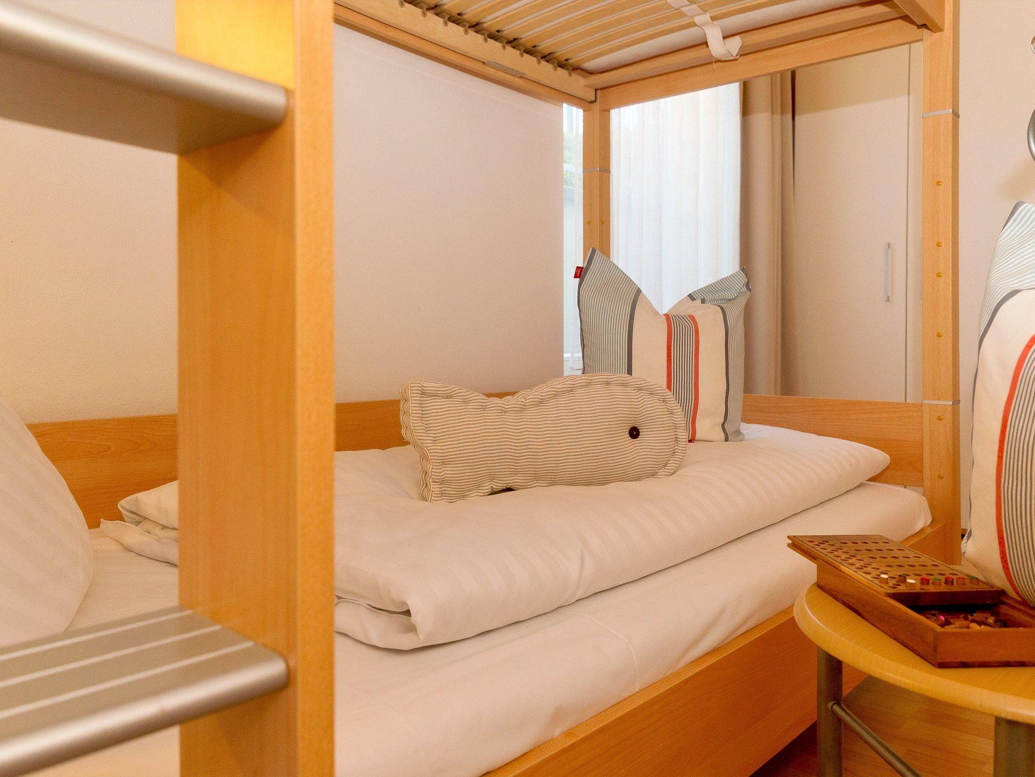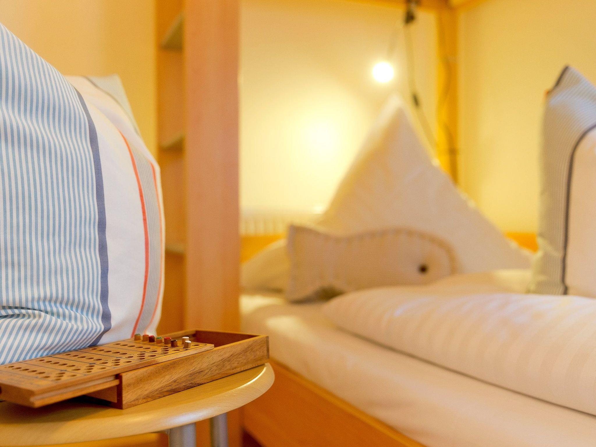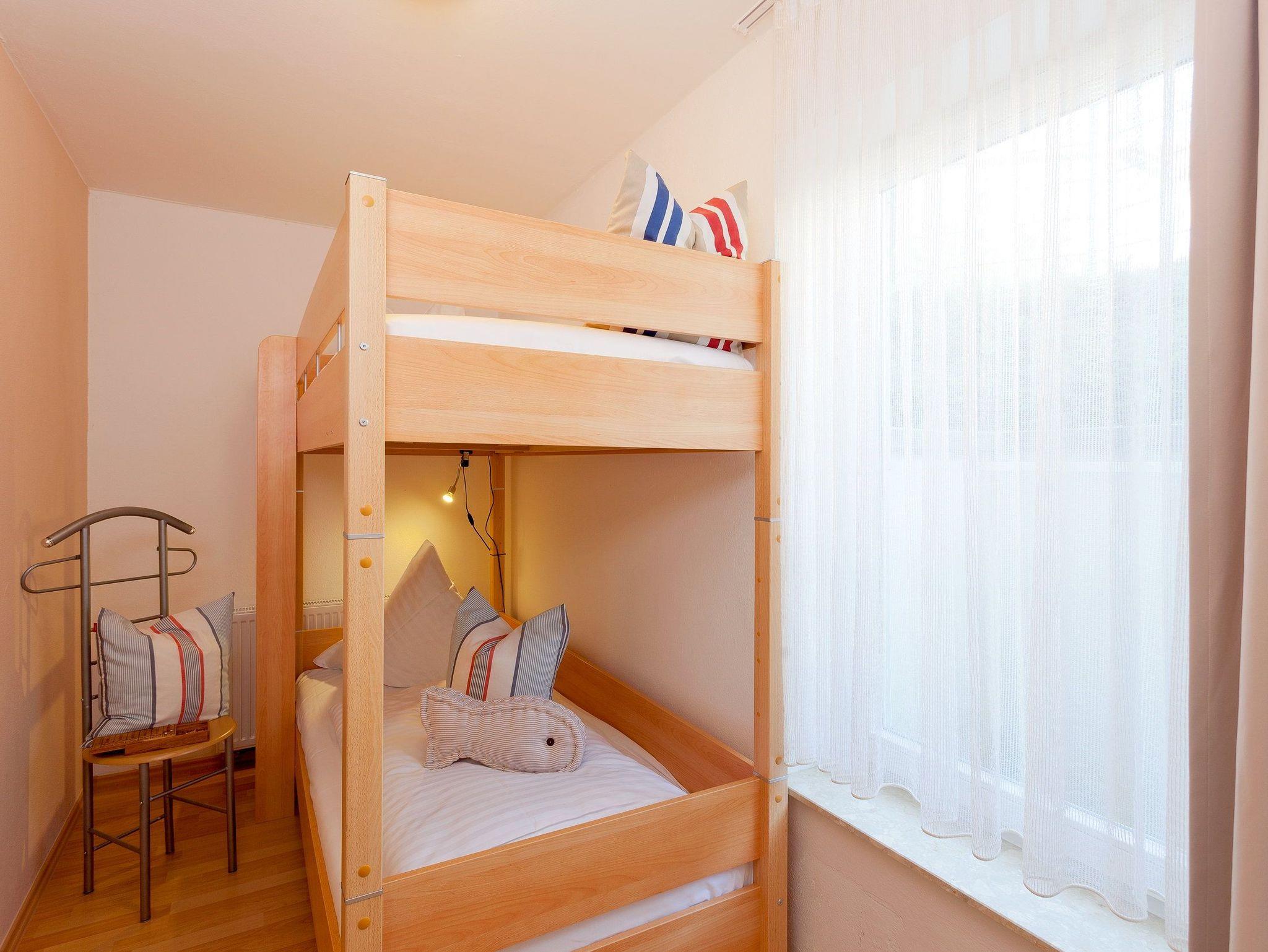 Damit Sie Ihre wohlverdiente Urlaubszeit bereits am Anreisetag in vollen Zügen genießen können, haben wir das Bett für Sie und das für Ihre lieben Mitreisenden bereits bezogen und ein Duschtuch sowie ein kleines Handtuch bereitgelegt. Die Aufbettung für ein Kind ist im Schlafzimmer im Babyreisebett (max. 3 Jahre) oder auf Faltmatratze (3 bis10 Jahre) 80 x 200 cm möglich. Im 2. Schlafzimmer befindet sich für unsere kleineren Gäste ein Etagenbett (jeweils 90 x 200cm). Das Badezimmer ist mit Dusche, WC, Handtuchtrockner und Fußbodenheizung ausgestattet.