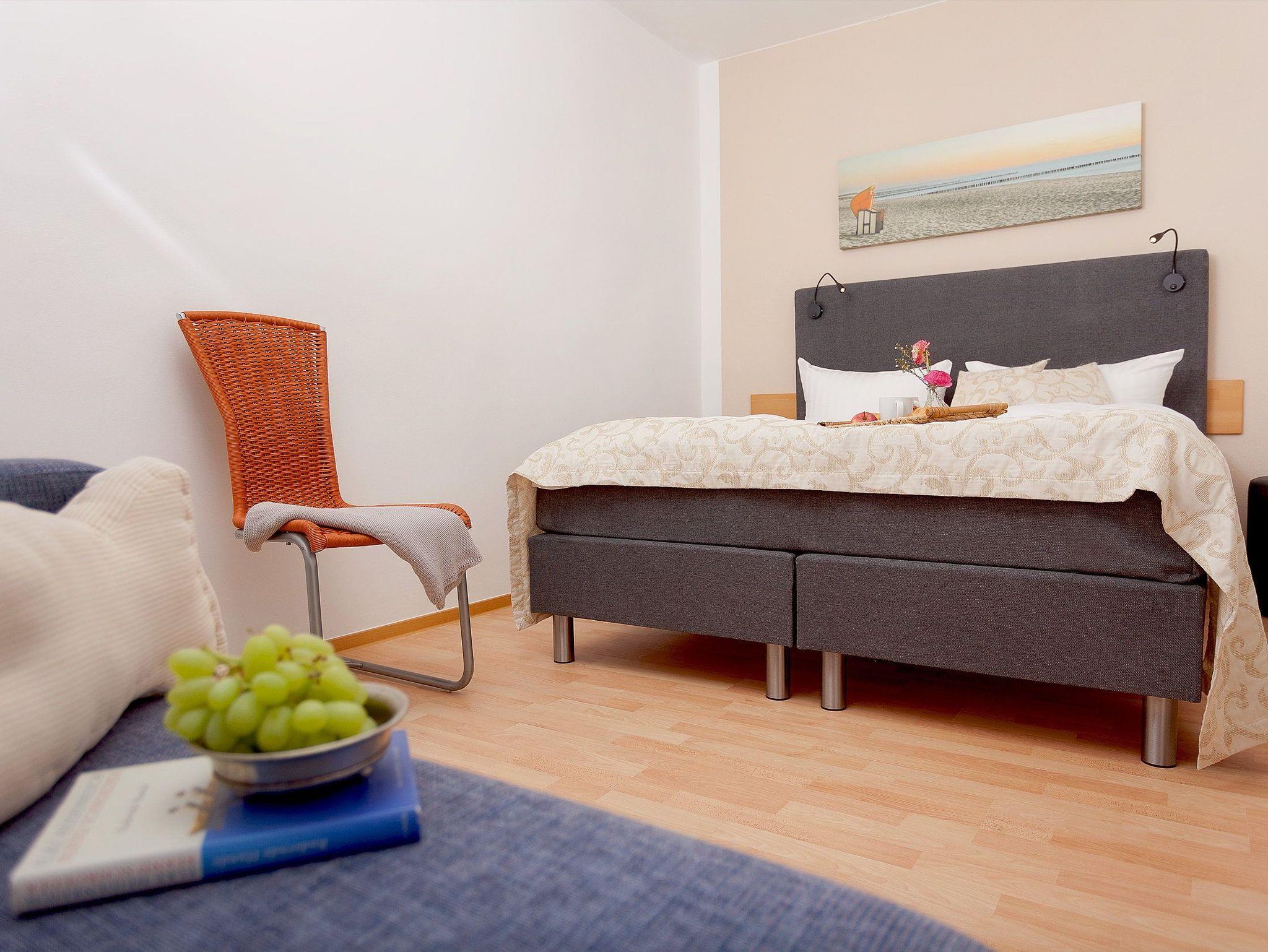 Über eine Treppe gelangen Sie vom Erdgeschoss in den Souterrain-Bereich. Dort befinden sich die beiden Schlafzimmer. Das eine Schlafzimmer ist mit einem hochwertigen Boxspringbett (160 x 200 cm) und Leselampe ausgestattet.
