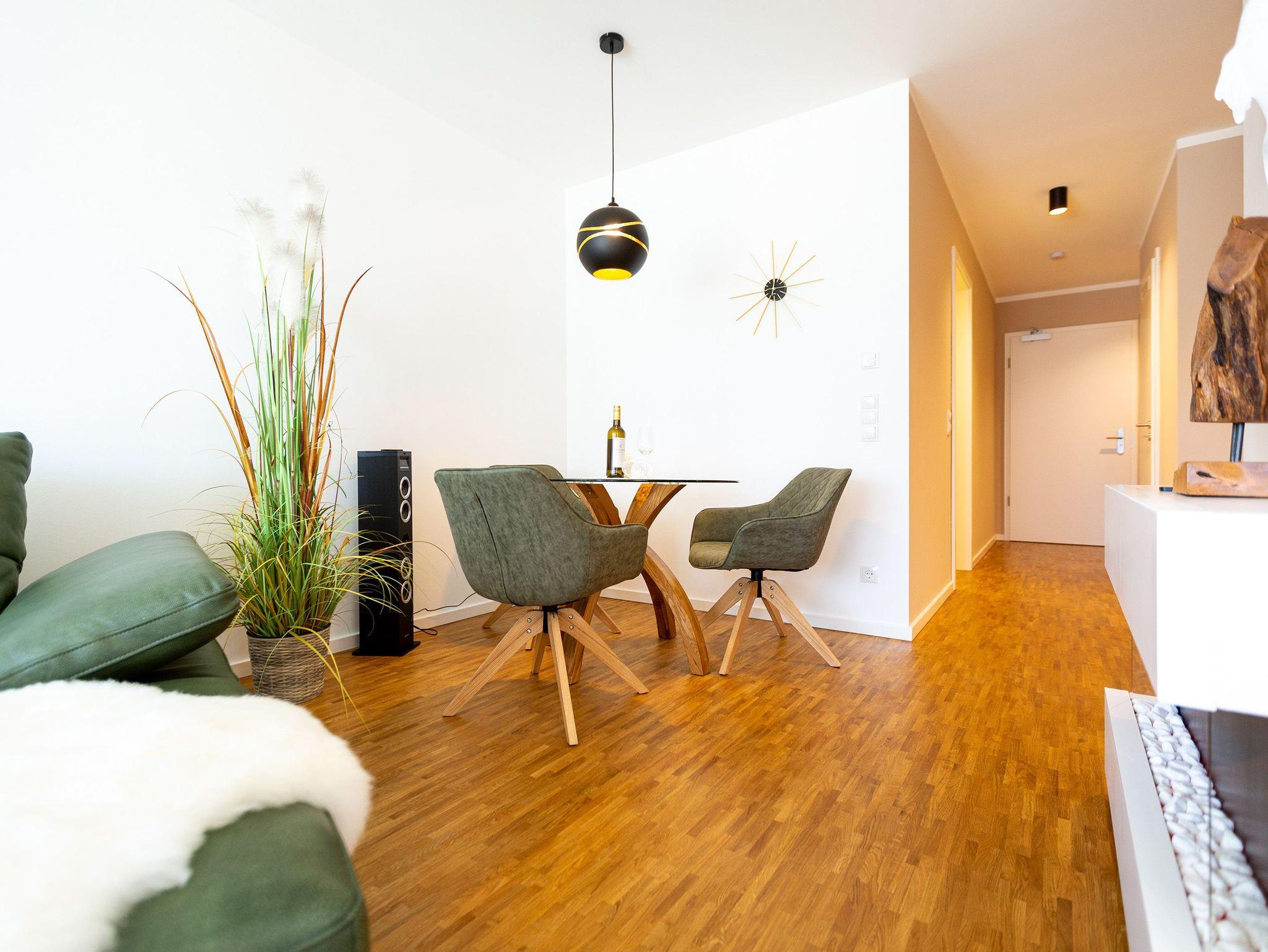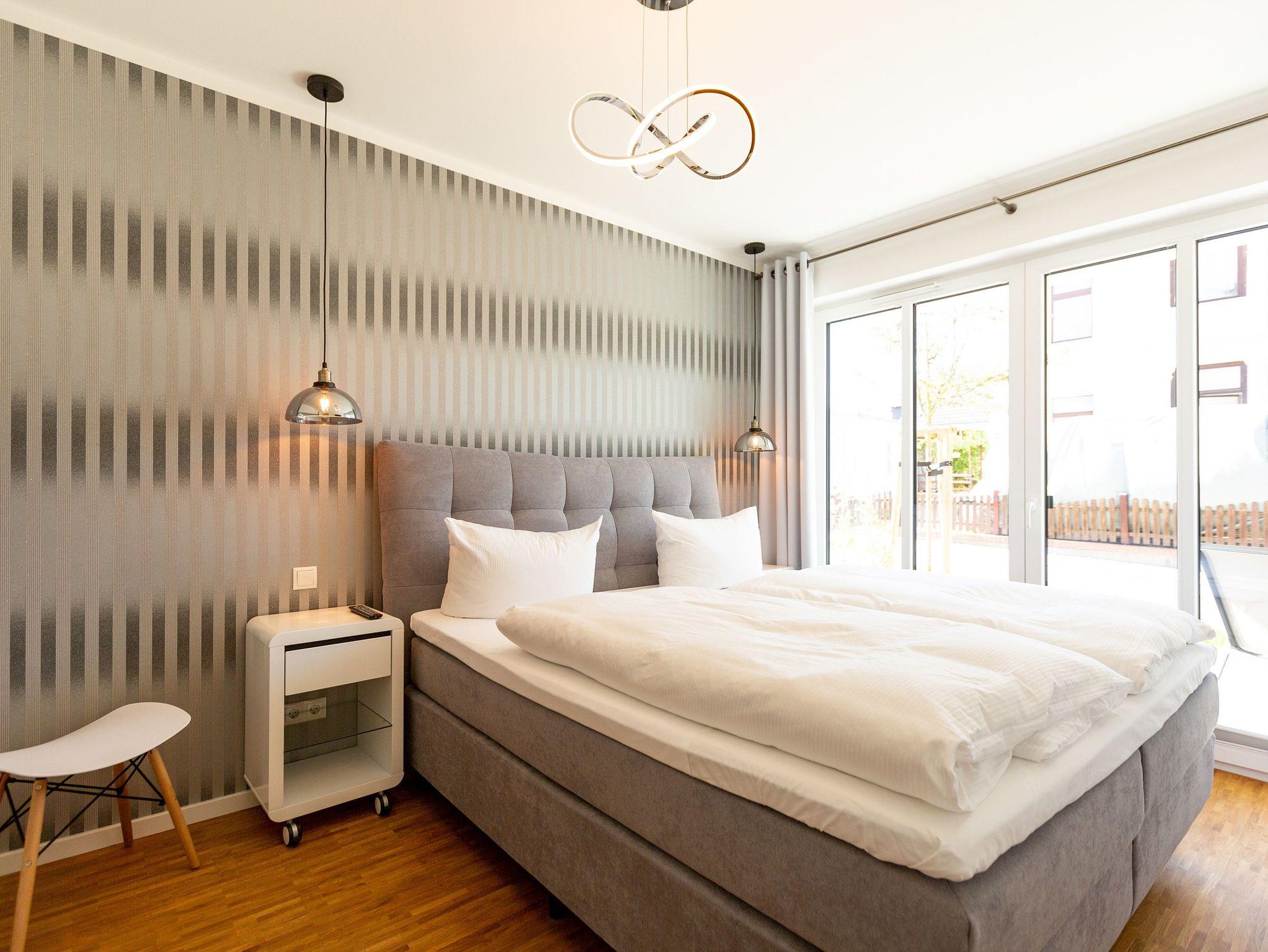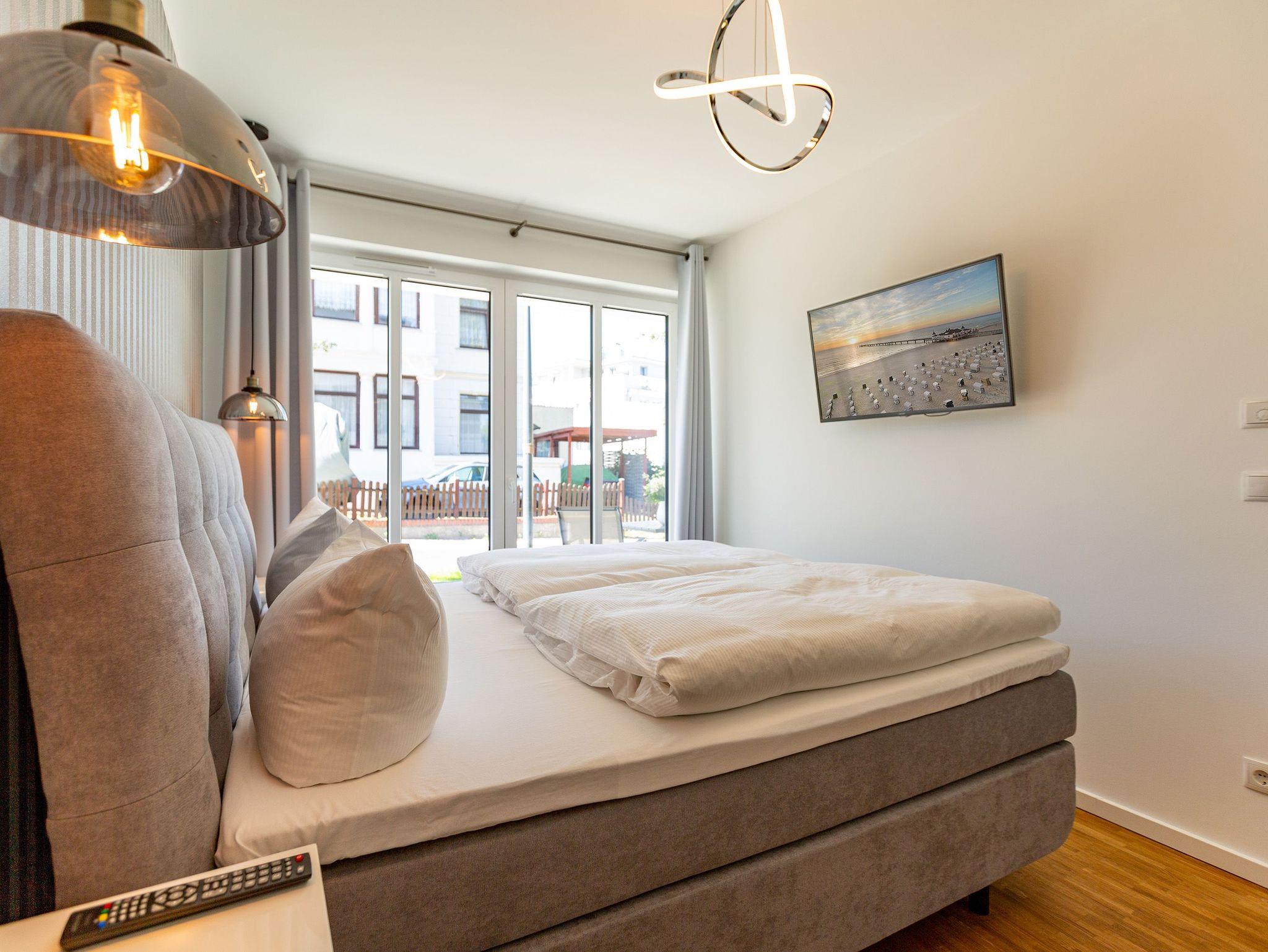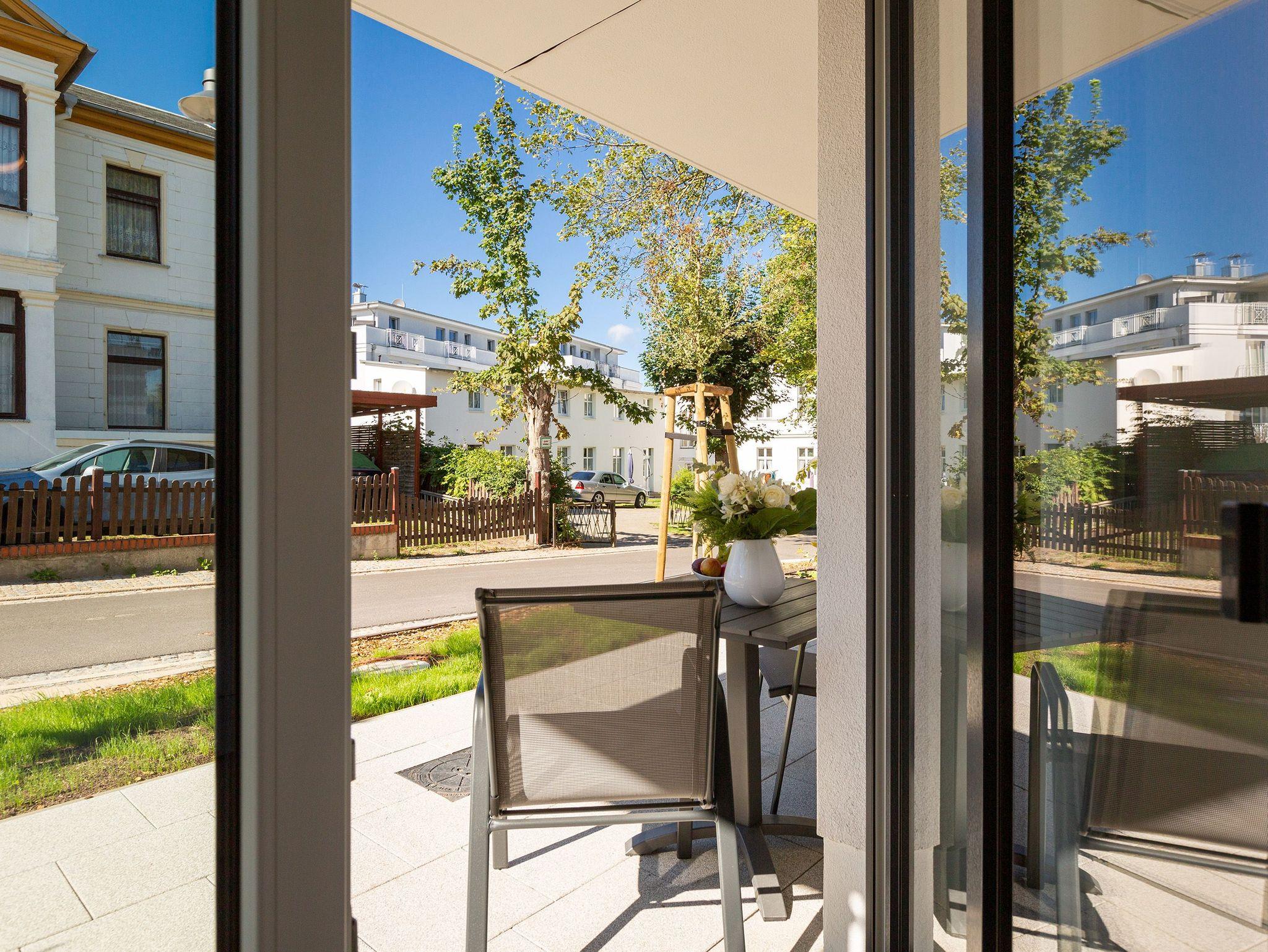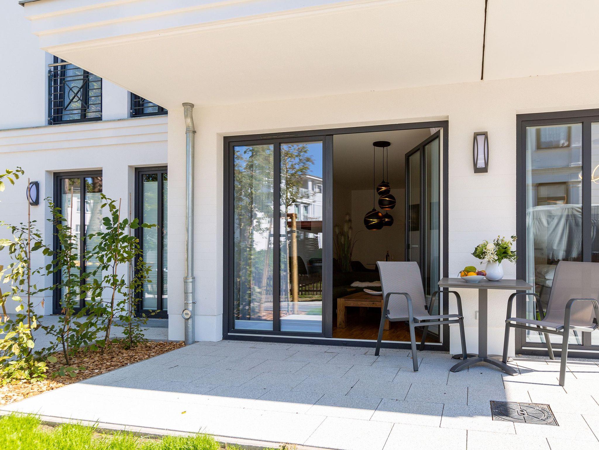 Ein Feriendomizil mit Stil und einer schönen Terrasse erwartet Sie im Erdgeschoss vom Quartier 7. Für zwei Personen ist dieses wunderschön eingerichtete Zwei-Zimmer-Appartement das ideale Auszeit-Zuhause. Auf den 50 Quadratmetern finden Sie alles, was Sie für eine entspannte Zeit auf Usedom brauchen können. Ein großzügiges und offenes Wohnzimmer lädt zum Relaxen ein. Ein großer Flat-TV gehört zur Ausstattung dazu. Ebenso ein Elektro-Kamin mit Panoramascheibe. Sollte es auf Usedom einmal widererwartend ungemütliches Wetter geben, sorgt er dafür, dass Sie sich schnell kuschelig und geborgen fühlen. Entspannen Sie auf der großen Ledersofalandschaft und genießen Sie einfach die Zeit, die hier auf der Insel bedeutungslos wird. Das WLAN ist hier kostenfrei nutzbar. Die Liebe zum Detail und zur Natur wird in den kleinen Dekorationen sichtbar. Zum Wohnzimmer hin öffnet sich eine komplett ausgestattete Küche. Markengeräte und edles Geschirr erleichtern das Zubereiten der Mahlzeiten. Am modernen Glastisch können Sie gemütlich sitzen und essen. Ist das Wetter schön, eignen sich dafür allerdings auch die Gartenmöbel auf der sonnenüberfluteten Süd-West-Terrasse (14 Quadratmeter). Skandinavisches Design: Im Schlafzimmer wartet ein bequemes und großes Boxspringdoppelbett (1,80 m x 2,00 m) nur darauf, Ihnen den Schlaf zu versüßen. Wenn die Ostsee nicht so ein Magnet wäre, könnte man hier glatt den ganzen Tag verkuscheln. Für das Kino-im-Bett-Gefühl ist ein Flat-TV vorhanden. Ein geräumiger Schrank bietet viel Platz für Kleidung. Auch vom Schlafzimmer aus haben Sie einen Zugang zur Terrasse. Das Bad ist mit Dusche und WC ausgestattet. Freuen Sie sich hier auf ein kleines Highlight: Eine finnische Sauna. Entspannen Sie ausgiebig in ihrem eigenen kleinen Private SPA. Handtücher liegen bereit. Ebenso ist das Bett bei Ihrer Anreise bezogen. In der Tiefgarage ist der Stellplatz Nr. WE 02 für Sie reserviert.
