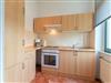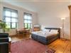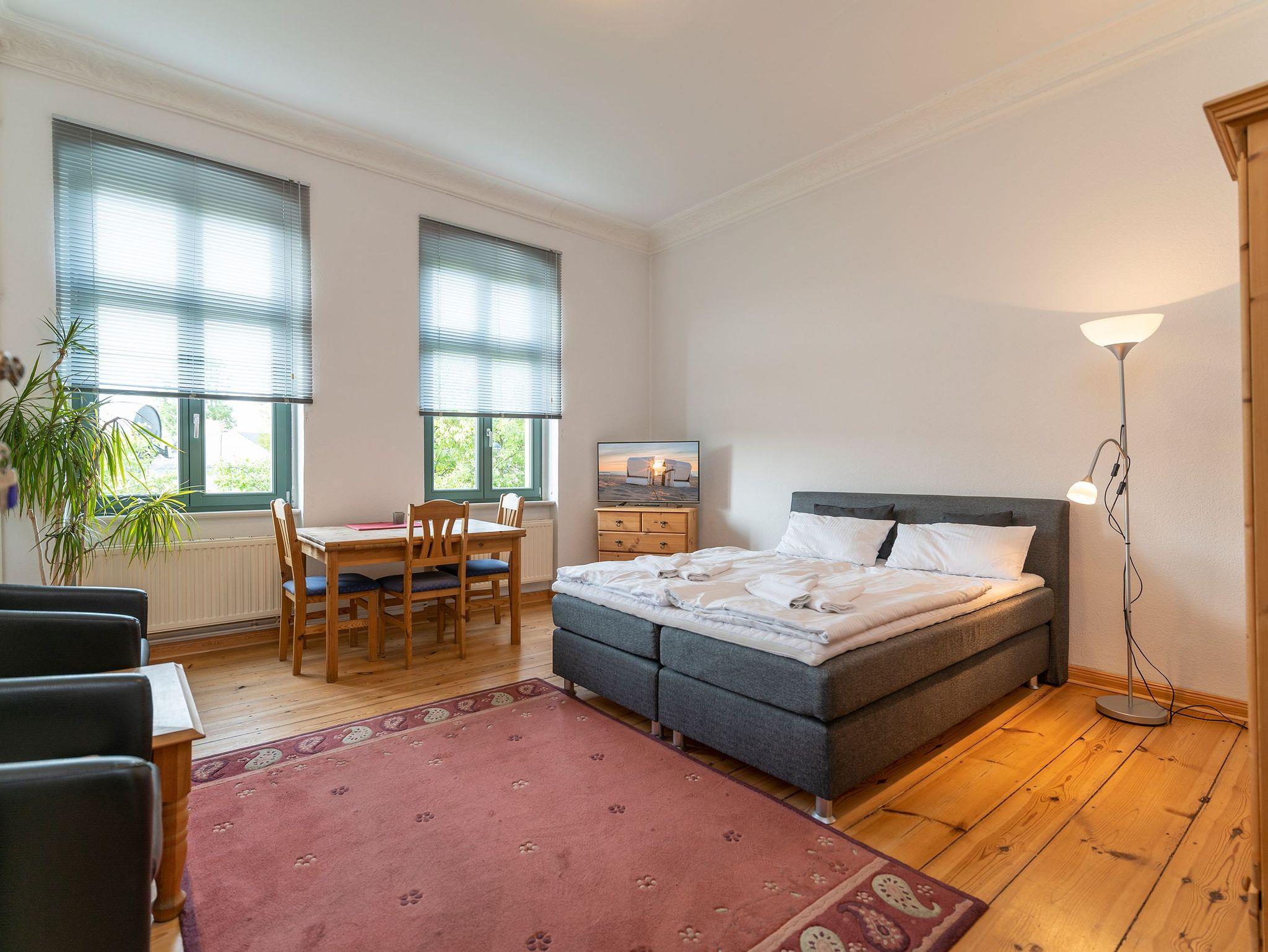 Die Lila Wohnung hat einen Wohn-/ Schlafraum mit Boxspringbett und Sitzmöglichkeiten, eine kleine Küche und ein Badezimmer.