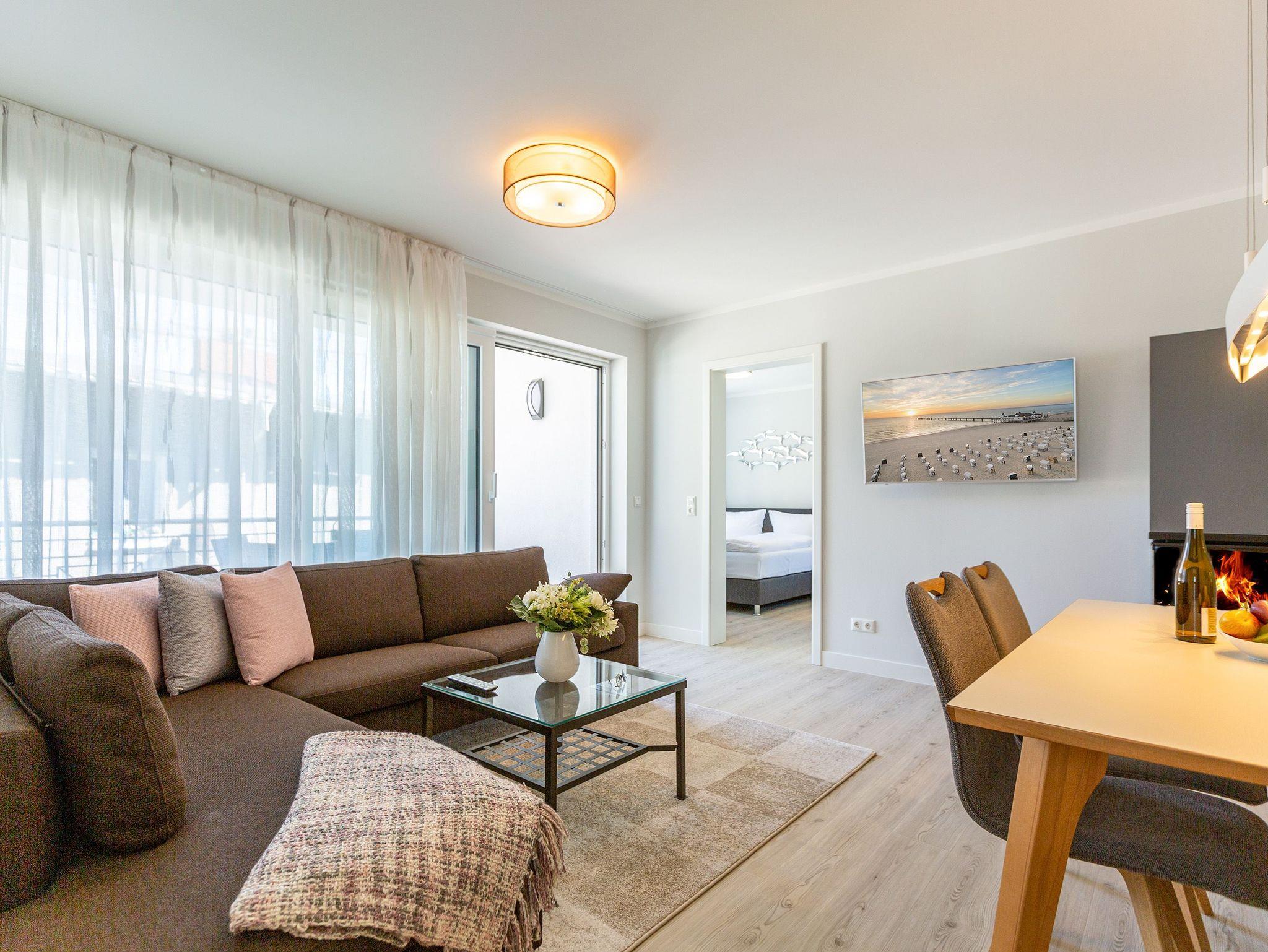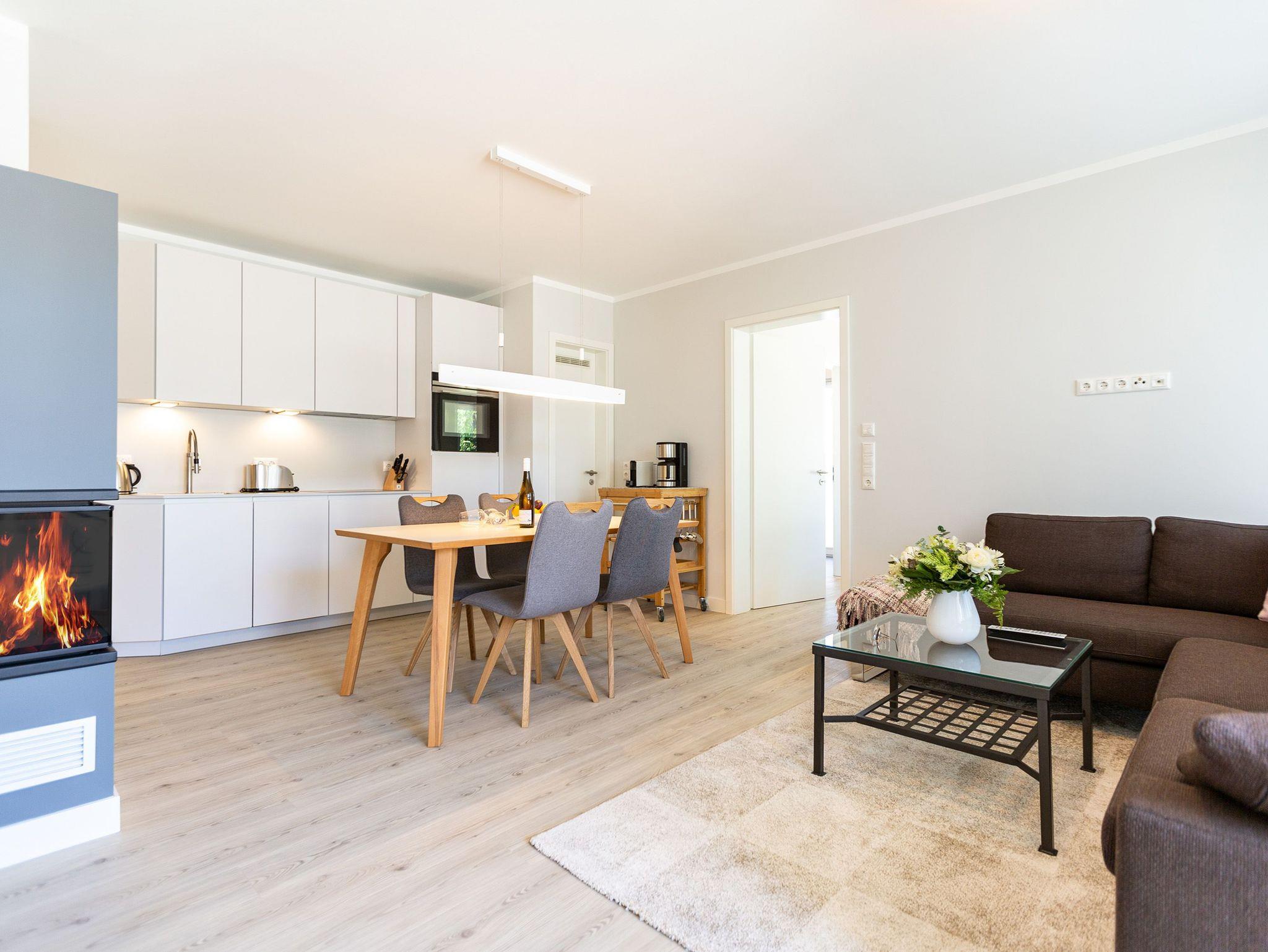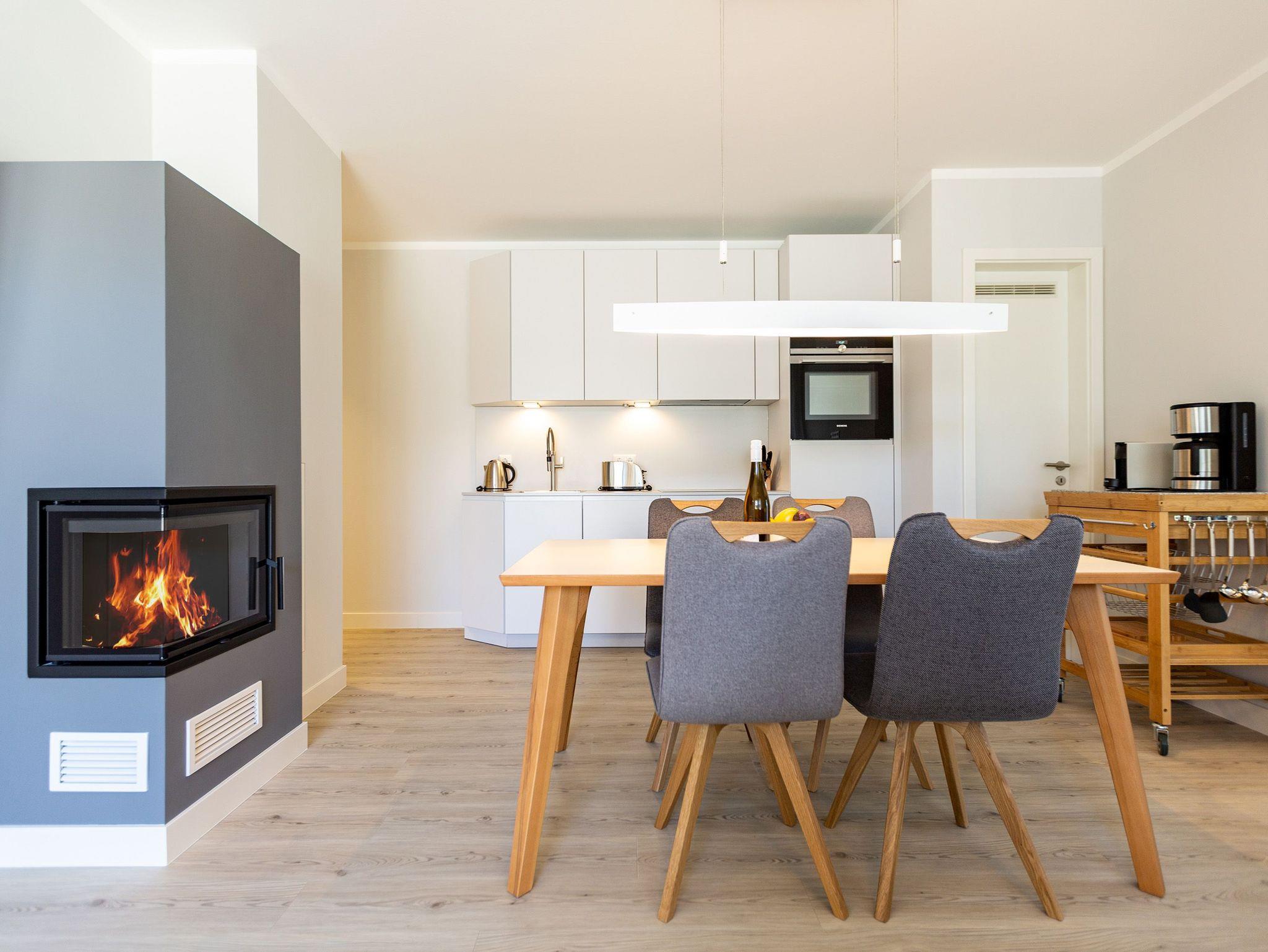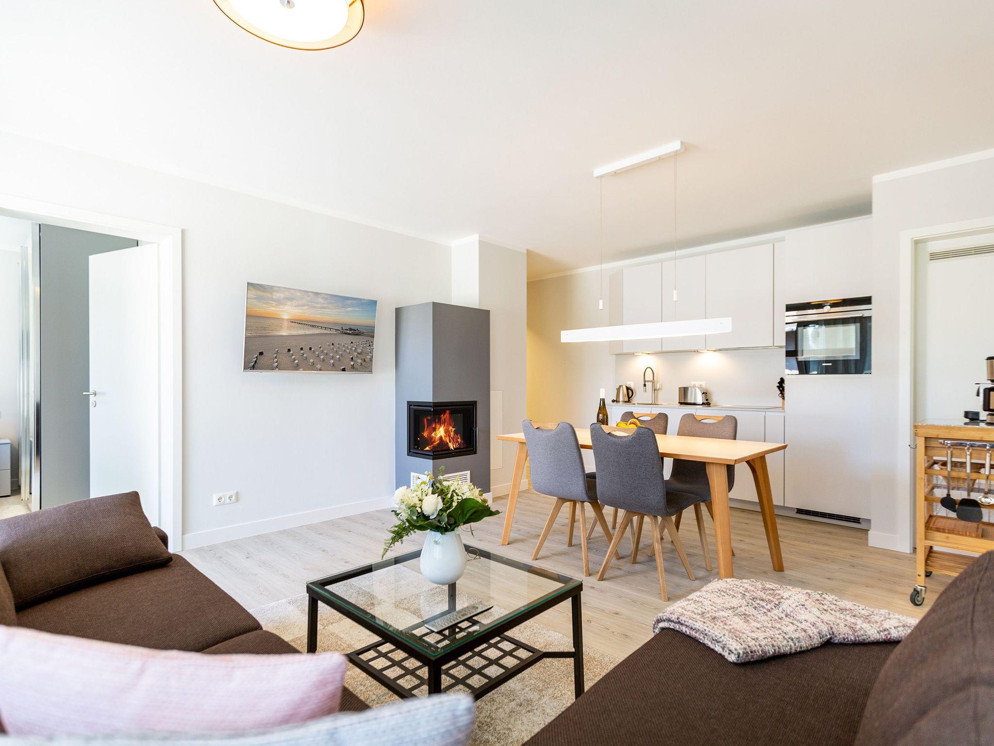 Hell und mit einer freundlichen Atmosphäre empfängt Sie dieses wunderschöne, 68 Quadratmeter große Ferienappartement im 1. Oberschoss. Bodentiefe Fenster lassen viel Sonne in das moderne Urlaubsdomizil und schenken lichte Behaglichkeit für bis zu vier Personen und ein Kleinkind (im Kinderreisebett). Ganz gleich ob Sie draußen auf dem Balkon (7 Quadratmeter) in den Gartensesseln die frische Ostseeluft genießen oder auf der bequemen Sofalandschaft im offenen und geräumigen Wohn-Esszimmer einen spannenden Film auf dem Flat-TV schauen ? Sie werden sich hier wohlfühlen. Für kuschelige und vor allem romantische Stunden sorgt ein Kamin. Ein schöner, großer Esstisch lädt zum Schlemmen ein. In der ins Wohnzimmer integrierten Küchenzeile finden Sie alles Nötige zum Kochen feiner Gerichte. Hochwertige Markengeräte erleichtern Ihnen die Arbeit während und nach dem Zubereiten der Mahlzeiten. Für erholsame Nächte warten zwei gut ausgestattete Schlafzimmer nur darauf, Sie ins Traumland zu entführen. Jedes der beiden Zimmer verfügt über ein Boxspringdoppelbett (1,80 m x 2,00 m), über einen Flat-TV und einen geräumigen Schrank mit Spiegel und viel Stauraum. Damit es beim täglichen Frischmachen nicht zu Engpässen kommt, hat Ihr Ferienappartement zwei Badezimmer mit Dusche und WC. Die Duschen sind ebenerdig und bieten Wasserliebhabern viel Platz. Eines der Badezimmer besitzt eine finnische Sauna und einen Waschtrockner. Bei Anreise liegen Handtücher bereit und auch die Betten sind bezogen. Sie brauchen sich also um solche Dinge nicht mehr selbst kümmern. Das WLAN ist kostenfrei nutzbar. In der Tiefgarage ist Ihnen der Stellplatz Nr. 9 zugewiesen.