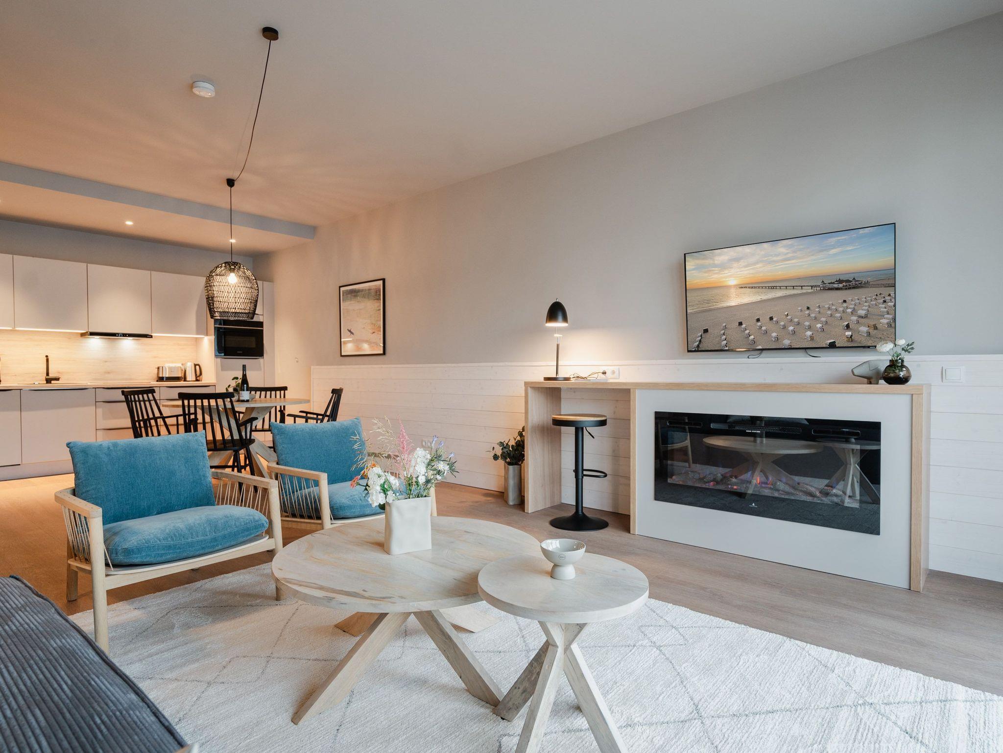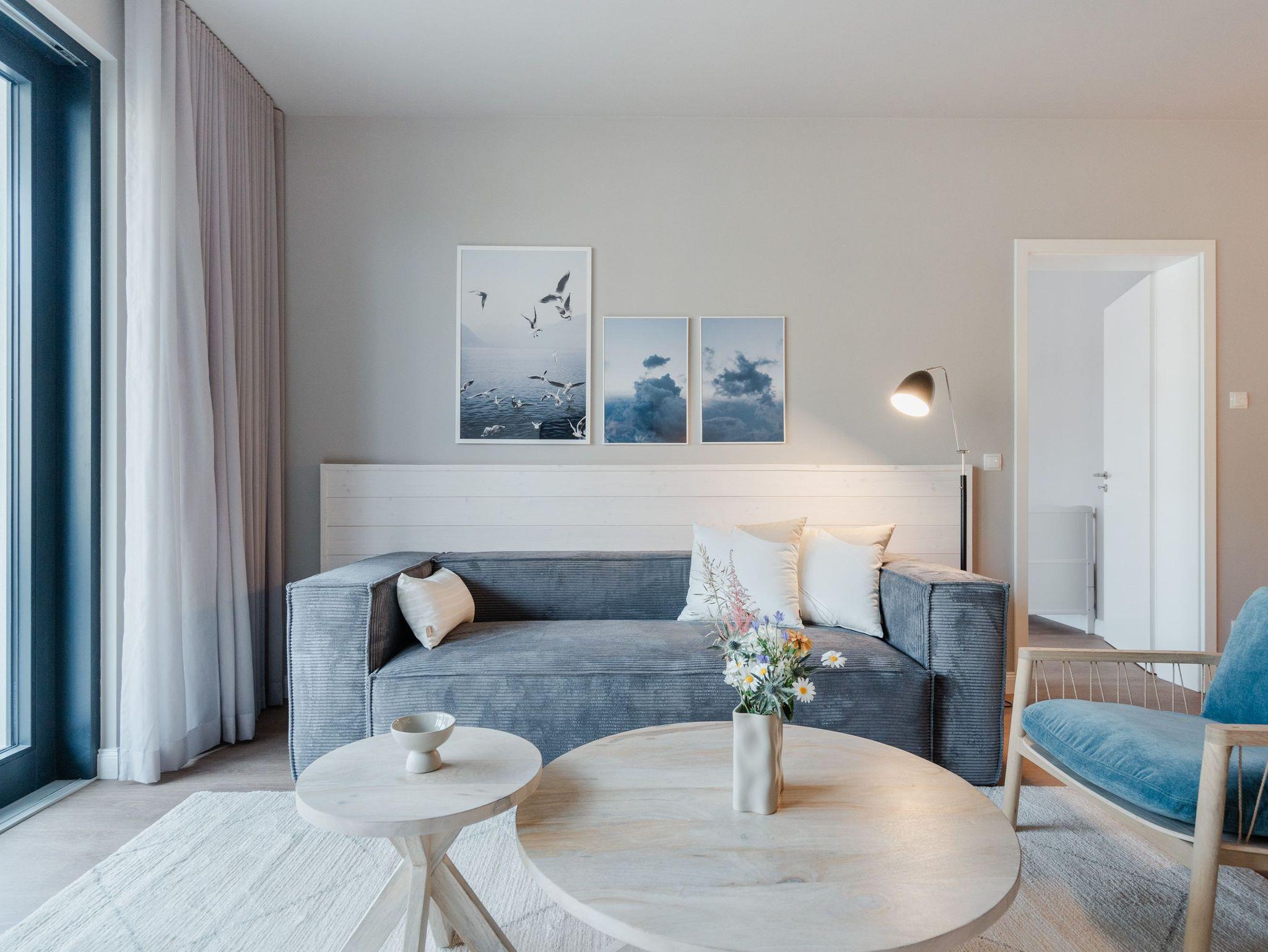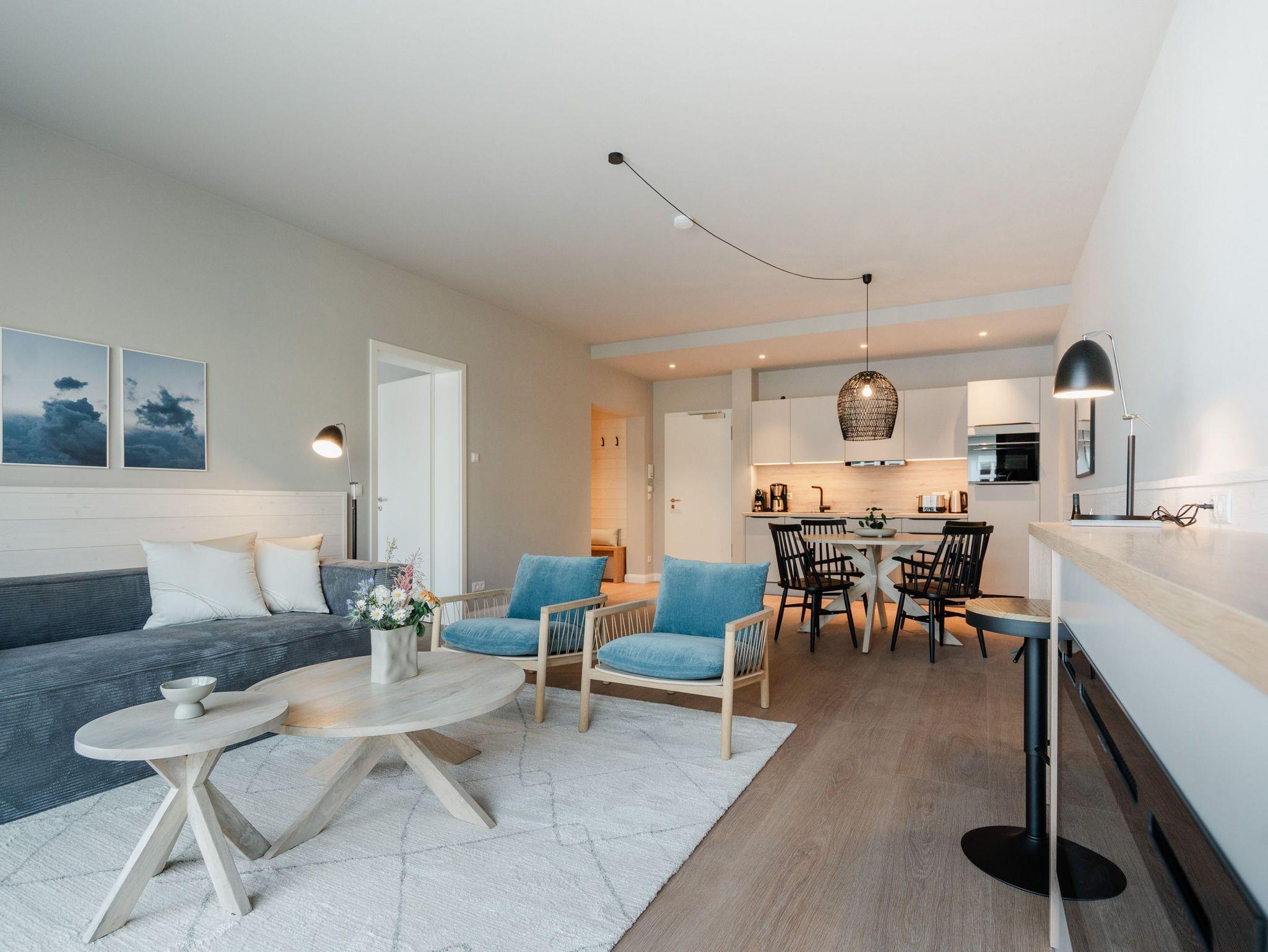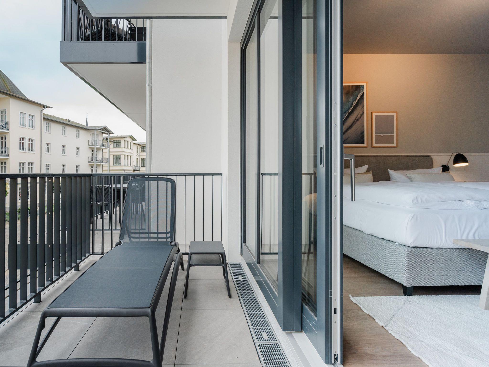 Ein Appartement, das wie gemacht ist für ein paar unvergesslich schöne Tage am Meer. Denn das 2-Raum-Appartement B 1.3 im Haus B der Strandterrasse ist gerade einmal 80 Meter vom Strand entfernt. Mit seinen 79 Quadratmetern bietet dieses stilvolle Urlaubsdomizil viel Platz für 2 Personen und maximal 1 Kleinkind im Babybett. Offen, hell und modern sind die Räume gestaltet und eingerichtet. Nordisches Design durchzieht von der sanften Farbgebung bis hin zu den stylischen Möbeln und den ausgesuchten Accessoires das gesamte Appartement. Hier kann man sich rundum wohlfühlen und die Hektik des Alltags in einer wundervoll harmonischen Umgebung schnell vergessen. Auf den beiden Balkonen, die in Richtung Osten hinausgehen und einen seitlichen Blick auf die Ostsee erlauben, können Sie die frische Meeresbrise tief einatmen und dem Rauschen der Wellen lauschen. In den geräumigen Wohnbereich integriert ist eine offene Küche, die mit allem Nötigen bestückt ist. Ein Backofen, ein 4-Platten-Induktionsherd und eine Nespresso-Kapselmaschine machen das Kochen und Zubereiten der Mahlzeiten zum Vergnügen. Genießen Sie die gemeinsame Zeit am schönen Esstisch oder gemütlich auf dem bequemen Sofa oder einem der beiden Sessel. Der exklusive Strukturstoff hat eine angenehme Haptik. Kuschelige Mußestunden sind hier garantiert. Der Elektrokamin (ohne Wärmeabgabe) sorgt für eine behagliche Atmosphäre und ein großer Flat-TV (50 Zoll) für Unterhaltung. So steht dem Kinoabend nichts mehr im Weg. Sie wollen schnell noch etwas loswerden? Eine kleine Arbeitsstation ist dafür der perfekte Ort. Vom Wohnzimmer aus können Sie auf einen der beiden Balkone hinaustreten. Der zweite ist über das Schlafzimmer zugänglich. Sitzmöbel und eine Sonnenliege laden zum Verweilen unter freiem Himmel ein. Das Schlafzimmer verfügt über ein großes Boxspringdoppelbett (2,00m x 2,00m), ein festes Babybett, einen geräumigen Kleiderschrank und ebenfalls einen Flat-TV (50 Zoll). Das Badezimmer ist mit Dusche, Waschtisch und WC bestens ausgestattet. Viel Vergnügen in der Infrarotsaunakabine. Lassen Sie sich von der wohligen Wärme verwöhnen und schalten Sie komplett ab. Damit Sie nicht erst noch lange nach einem Stellplatz suchen müssen, verfügt die Wohnung über einen eigenen PKW-Stellplatz in der Tiefgarage. So wird der Urlaub an der Ostsee von Anfang an zu einer entspannten Auszeit.