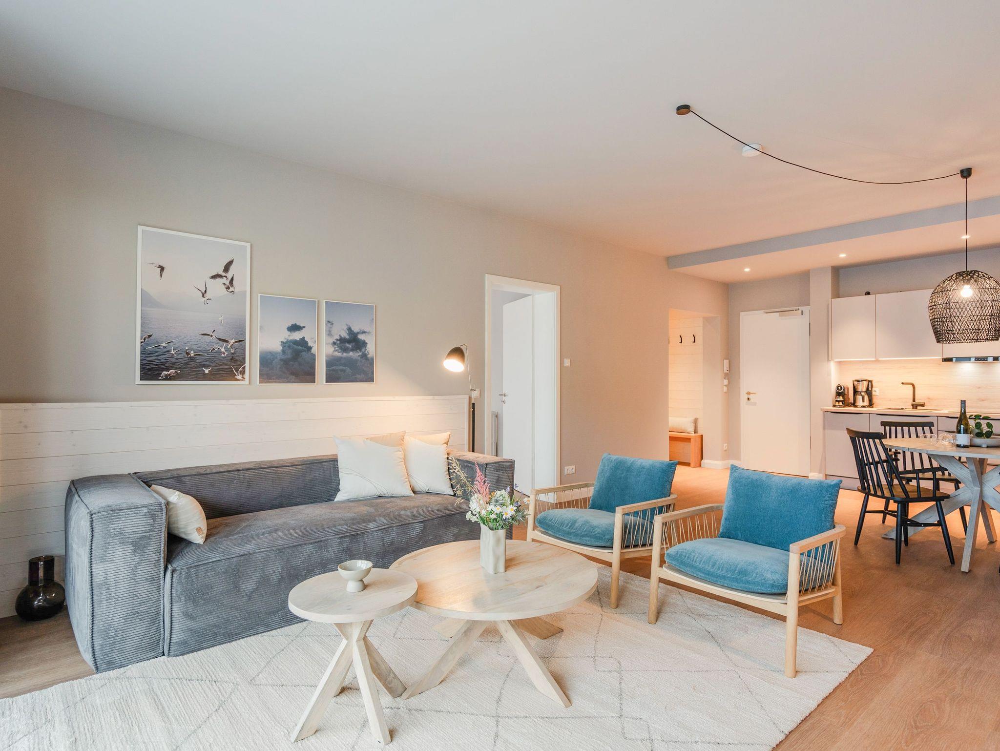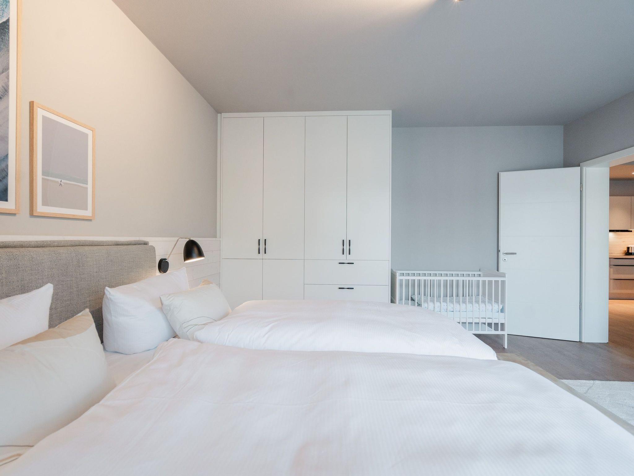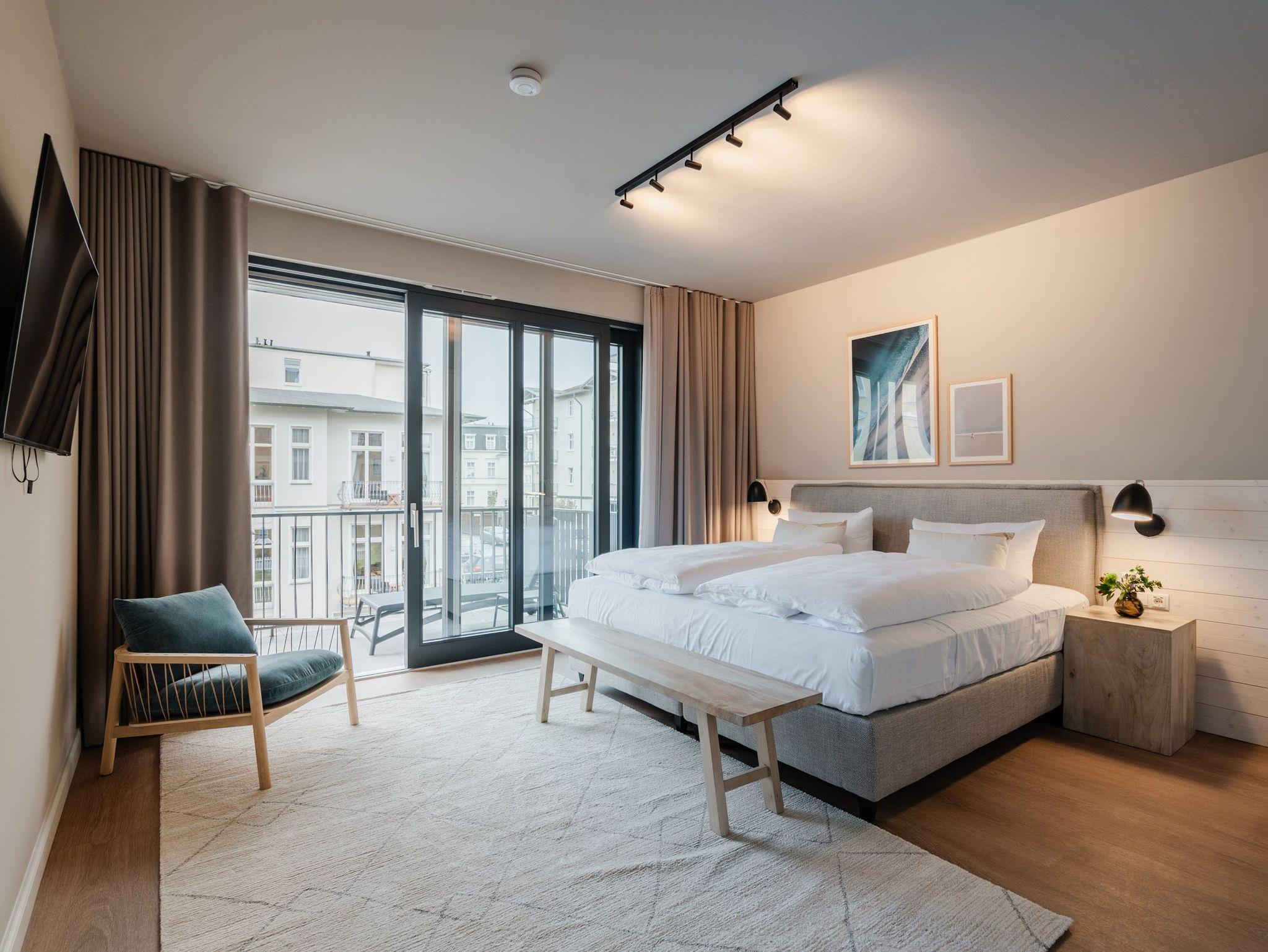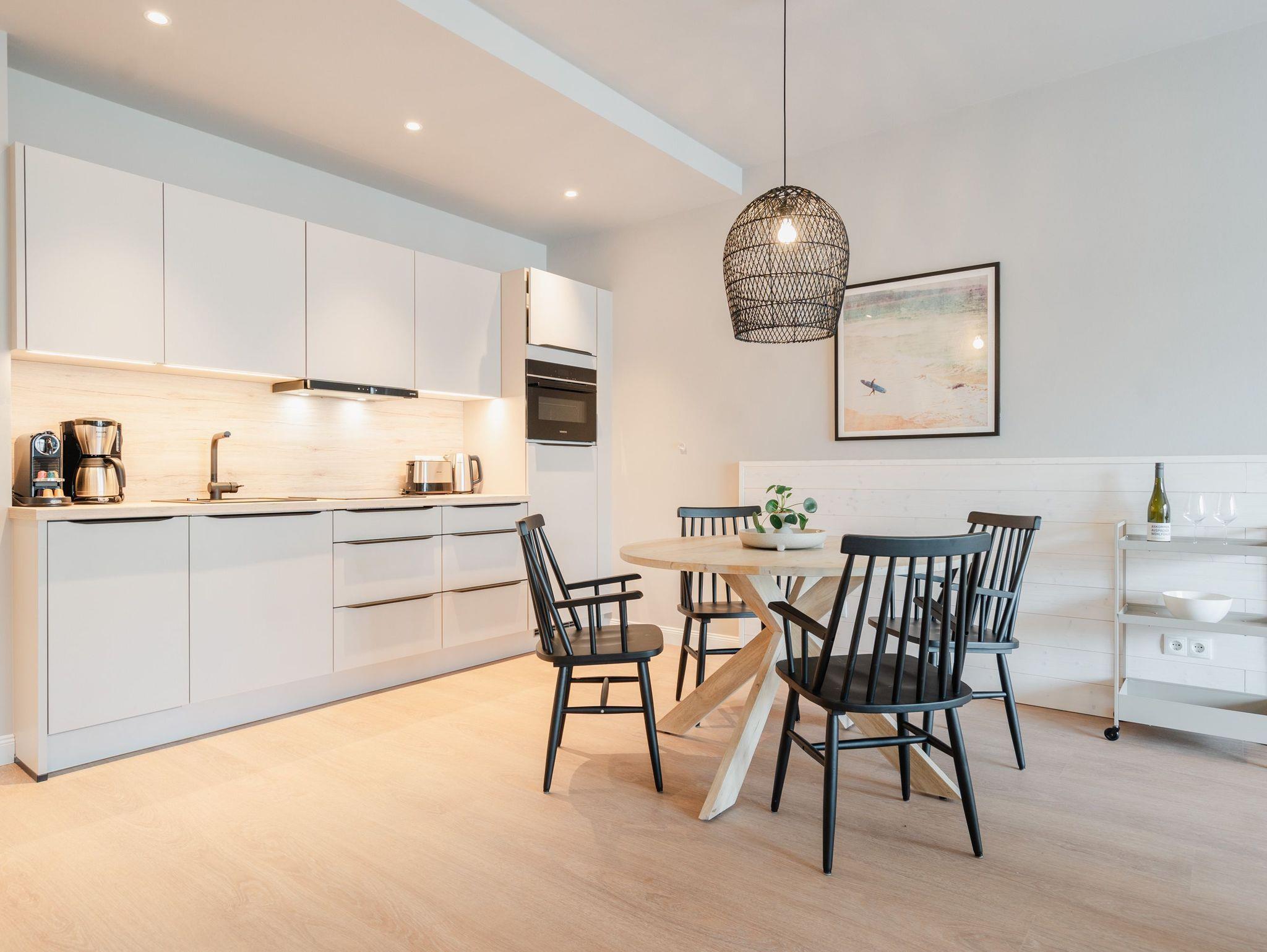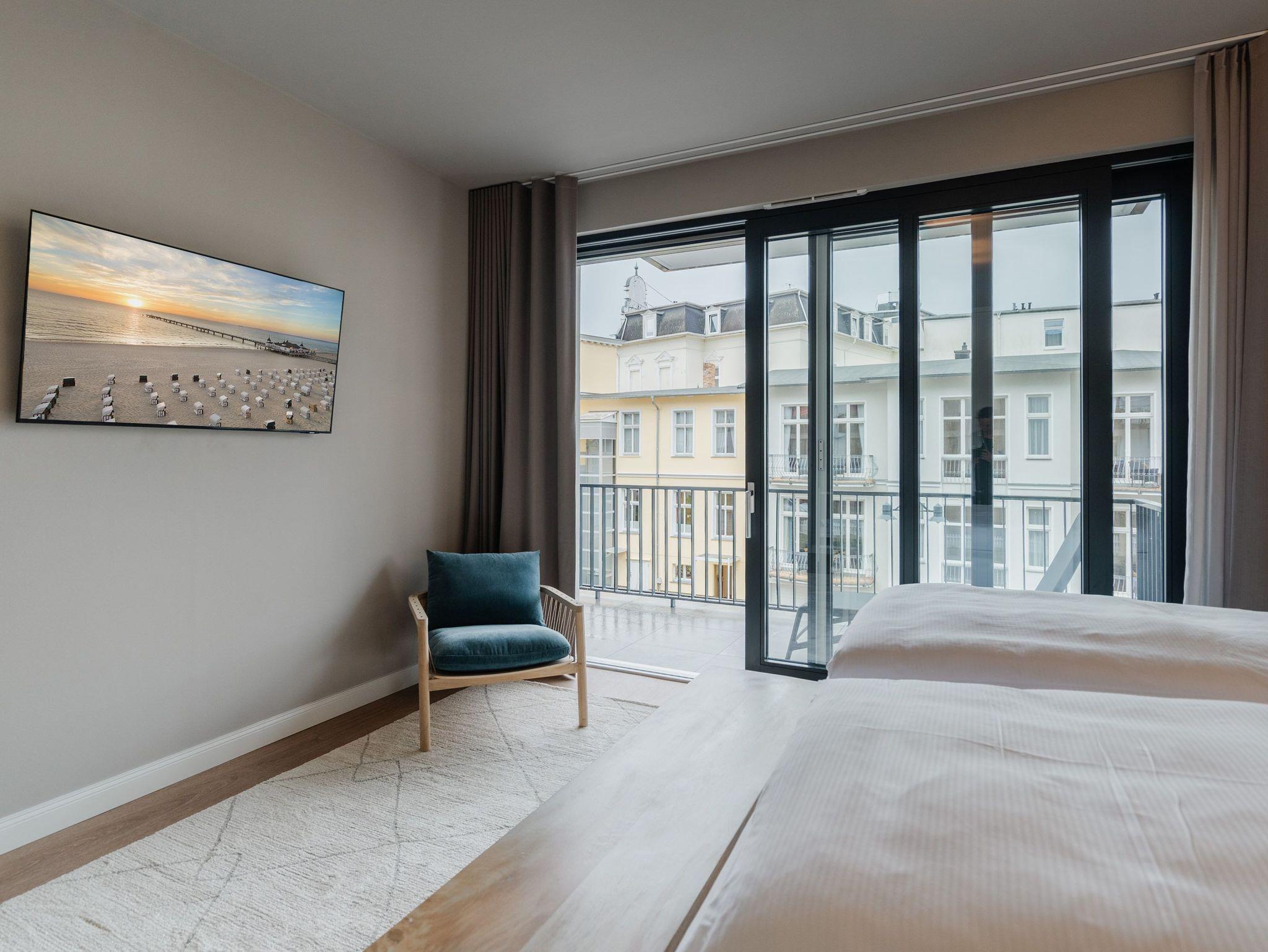 Ein Appartement, das wie gemacht ist für ein paar unvergesslich schöne Tage am Meer. Denn das 2-Raum-Appartement B 1.3 im Haus B der Strandterrasse ist gerade einmal 80 Meter vom Strand entfernt. Mit seinen 79 Quadratmetern bietet dieses stilvolle Urlaubsdomizil viel Platz für 2 Personen und maximal 1 Kleinkind im Babybett. Offen, hell und modern sind die Räume gestaltet und eingerichtet. Nordisches Design durchzieht von der sanften Farbgebung bis hin zu den stylischen Möbeln und den ausgesuchten Accessoires das gesamte Appartement. Hier kann man sich rundum wohlfühlen und die Hektik des Alltags in einer wundervoll harmonischen Umgebung schnell vergessen. Auf den beiden Balkonen, die in Richtung Osten hinausgehen und einen seitlichen Blick auf die Ostsee erlauben, können Sie die frische Meeresbrise tief einatmen und dem Rauschen der Wellen lauschen. In den geräumigen Wohnbereich integriert ist eine offene Küche, die mit allem Nötigen bestückt ist. Ein Backofen, ein 4-Platten-Induktionsherd und eine Nespresso-Kapselmaschine machen das Kochen und Zubereiten der Mahlzeiten zum Vergnügen. Genießen Sie die gemeinsame Zeit am schönen Esstisch oder gemütlich auf dem bequemen Sofa oder einem der beiden Sessel. Der exklusive Strukturstoff hat eine angenehme Haptik. Kuschelige Mußestunden sind hier garantiert. Der Elektrokamin (ohne Wärmeabgabe) sorgt für eine behagliche Atmosphäre und ein großer Flat-TV (50 Zoll) für Unterhaltung. So steht dem Kinoabend nichts mehr im Weg. Sie wollen schnell noch etwas loswerden? Eine kleine Arbeitsstation ist dafür der perfekte Ort. Vom Wohnzimmer aus können Sie auf einen der beiden Balkone hinaustreten. Der zweite ist über das Schlafzimmer zugänglich. Sitzmöbel und eine Sonnenliege laden zum Verweilen unter freiem Himmel ein. Das Schlafzimmer verfügt über ein großes Boxspringdoppelbett (2,00m x 2,00m), ein festes Babybett, einen geräumigen Kleiderschrank und ebenfalls einen Flat-TV (50 Zoll). Das Badezimmer ist mit Dusche, Waschtisch und WC bestens ausgestattet. Viel Vergnügen in der Infrarotsaunakabine. Lassen Sie sich von der wohligen Wärme verwöhnen und schalten Sie komplett ab. Damit Sie nicht erst noch lange nach einem Stellplatz suchen müssen, verfügt die Wohnung über einen eigenen PKW-Stellplatz in der Tiefgarage. So wird der Urlaub an der Ostsee von Anfang an zu einer entspannten Auszeit.