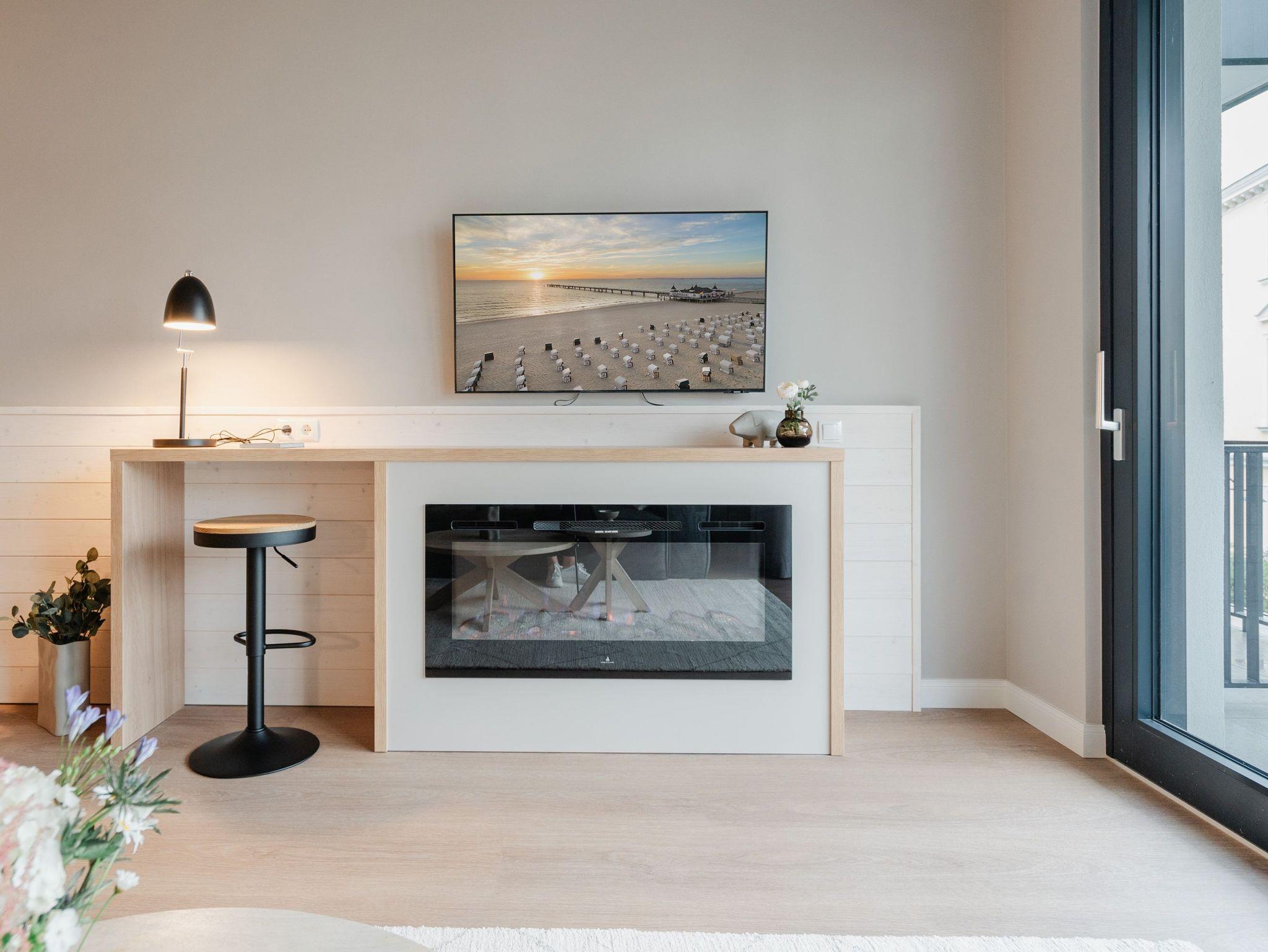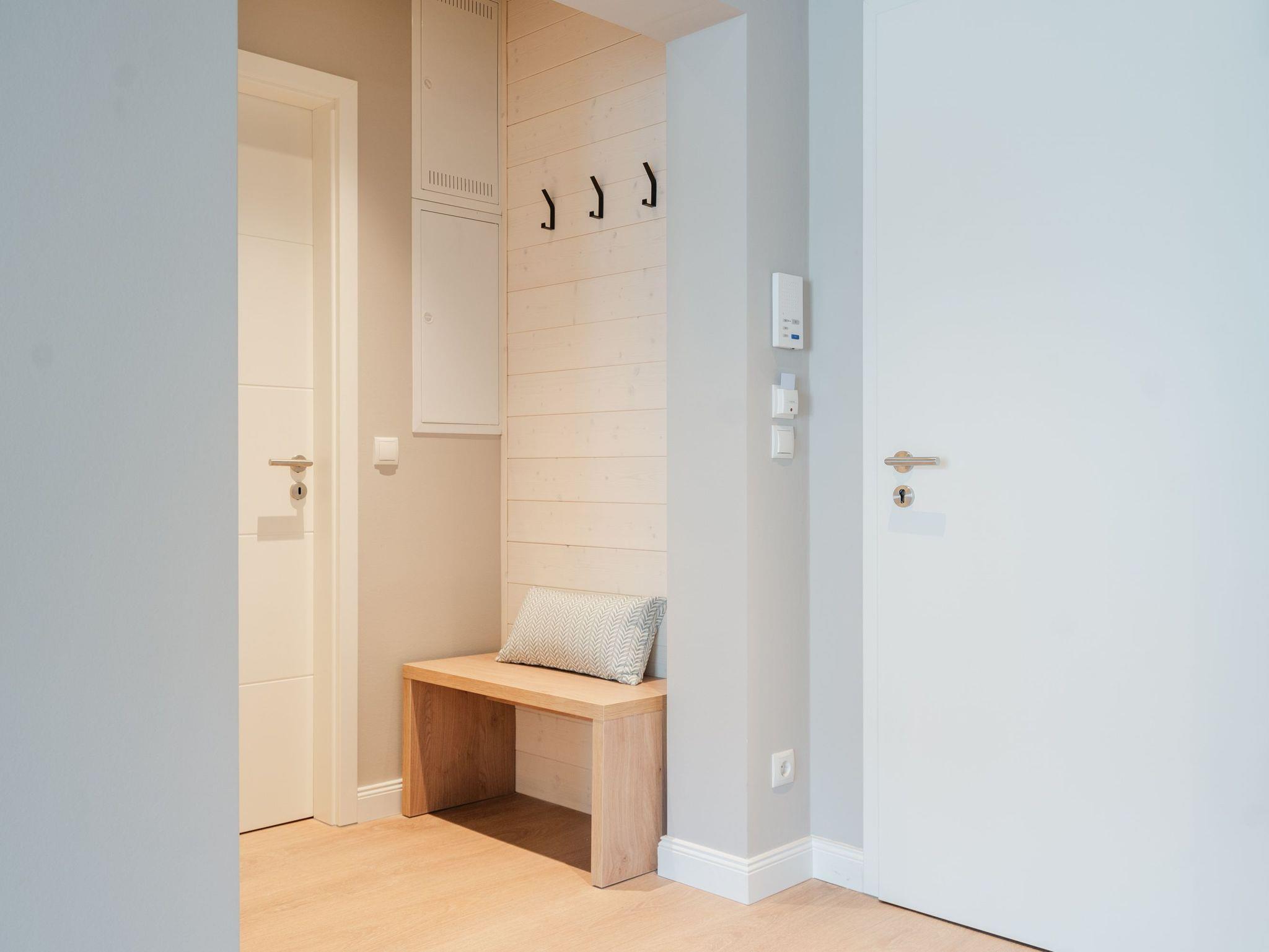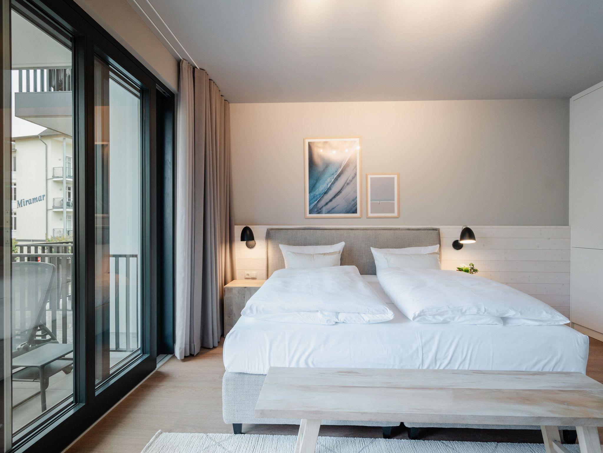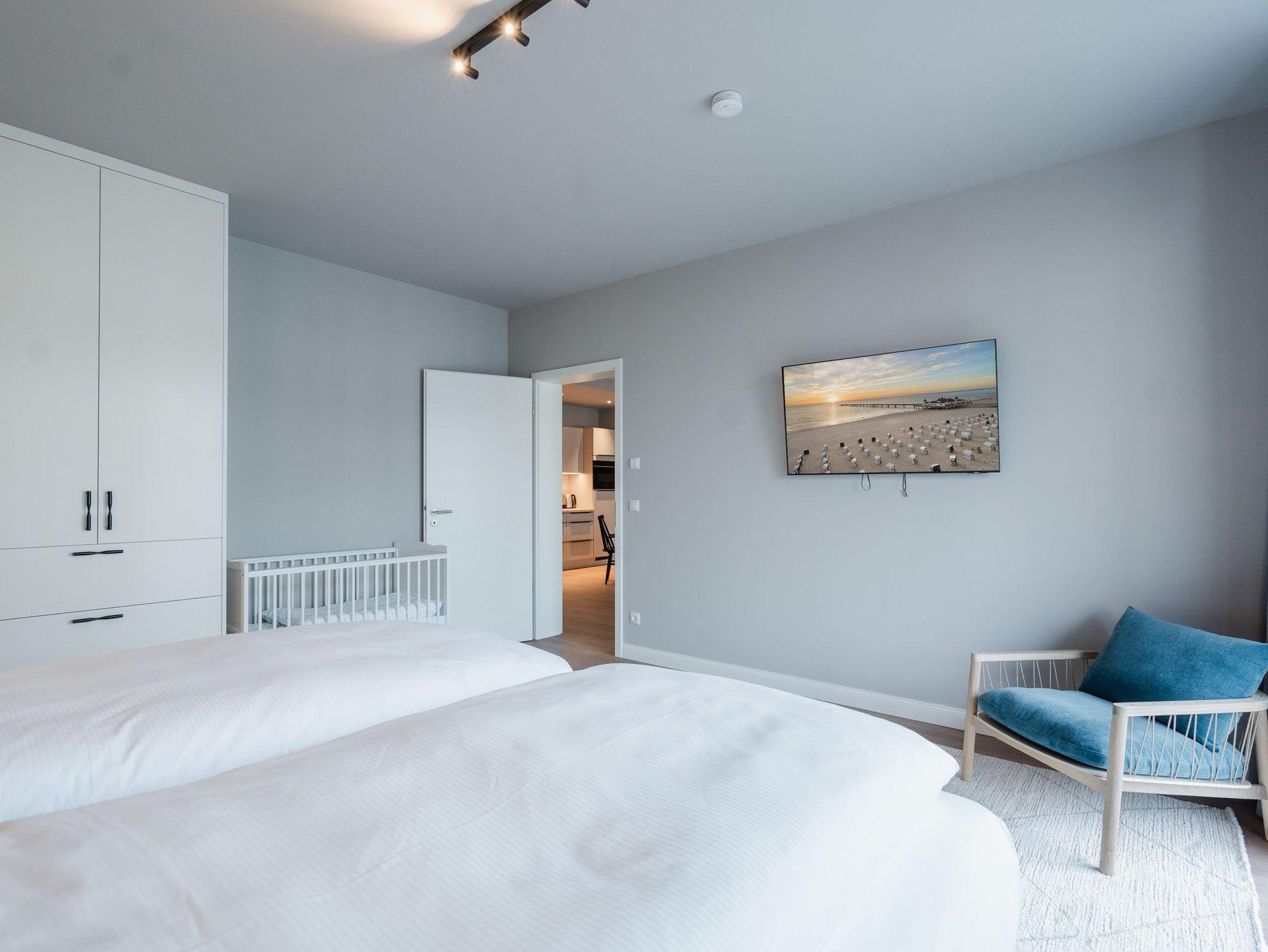 Ein Appartement, das wie gemacht ist für ein paar unvergesslich schöne Tage am Meer. Denn das 2-Raum-Appartement B 1.3 im Haus B der Strandterrasse ist gerade einmal 80 Meter vom Strand entfernt. Mit seinen 79 Quadratmetern bietet dieses stilvolle Urlaubsdomizil viel Platz für 2 Personen und maximal 1 Kleinkind im Babybett. Offen, hell und modern sind die Räume gestaltet und eingerichtet. Nordisches Design durchzieht von der sanften Farbgebung bis hin zu den stylischen Möbeln und den ausgesuchten Accessoires das gesamte Appartement. Hier kann man sich rundum wohlfühlen und die Hektik des Alltags in einer wundervoll harmonischen Umgebung schnell vergessen. Auf den beiden Balkonen, die in Richtung Osten hinausgehen und einen seitlichen Blick auf die Ostsee erlauben, können Sie die frische Meeresbrise tief einatmen und dem Rauschen der Wellen lauschen. In den geräumigen Wohnbereich integriert ist eine offene Küche, die mit allem Nötigen bestückt ist. Ein Backofen, ein 4-Platten-Induktionsherd und eine Nespresso-Kapselmaschine machen das Kochen und Zubereiten der Mahlzeiten zum Vergnügen. Genießen Sie die gemeinsame Zeit am schönen Esstisch oder gemütlich auf dem bequemen Sofa oder einem der beiden Sessel. Der exklusive Strukturstoff hat eine angenehme Haptik. Kuschelige Mußestunden sind hier garantiert. Der Elektrokamin (ohne Wärmeabgabe) sorgt für eine behagliche Atmosphäre und ein großer Flat-TV (50 Zoll) für Unterhaltung. So steht dem Kinoabend nichts mehr im Weg. Sie wollen schnell noch etwas loswerden? Eine kleine Arbeitsstation ist dafür der perfekte Ort. Vom Wohnzimmer aus können Sie auf einen der beiden Balkone hinaustreten. Der zweite ist über das Schlafzimmer zugänglich. Sitzmöbel und eine Sonnenliege laden zum Verweilen unter freiem Himmel ein. Das Schlafzimmer verfügt über ein großes Boxspringdoppelbett (2,00m x 2,00m), ein festes Babybett, einen geräumigen Kleiderschrank und ebenfalls einen Flat-TV (50 Zoll). Das Badezimmer ist mit Dusche, Waschtisch und WC bestens ausgestattet. Viel Vergnügen in der Infrarotsaunakabine. Lassen Sie sich von der wohligen Wärme verwöhnen und schalten Sie komplett ab. Damit Sie nicht erst noch lange nach einem Stellplatz suchen müssen, verfügt die Wohnung über einen eigenen PKW-Stellplatz in der Tiefgarage. So wird der Urlaub an der Ostsee von Anfang an zu einer entspannten Auszeit.