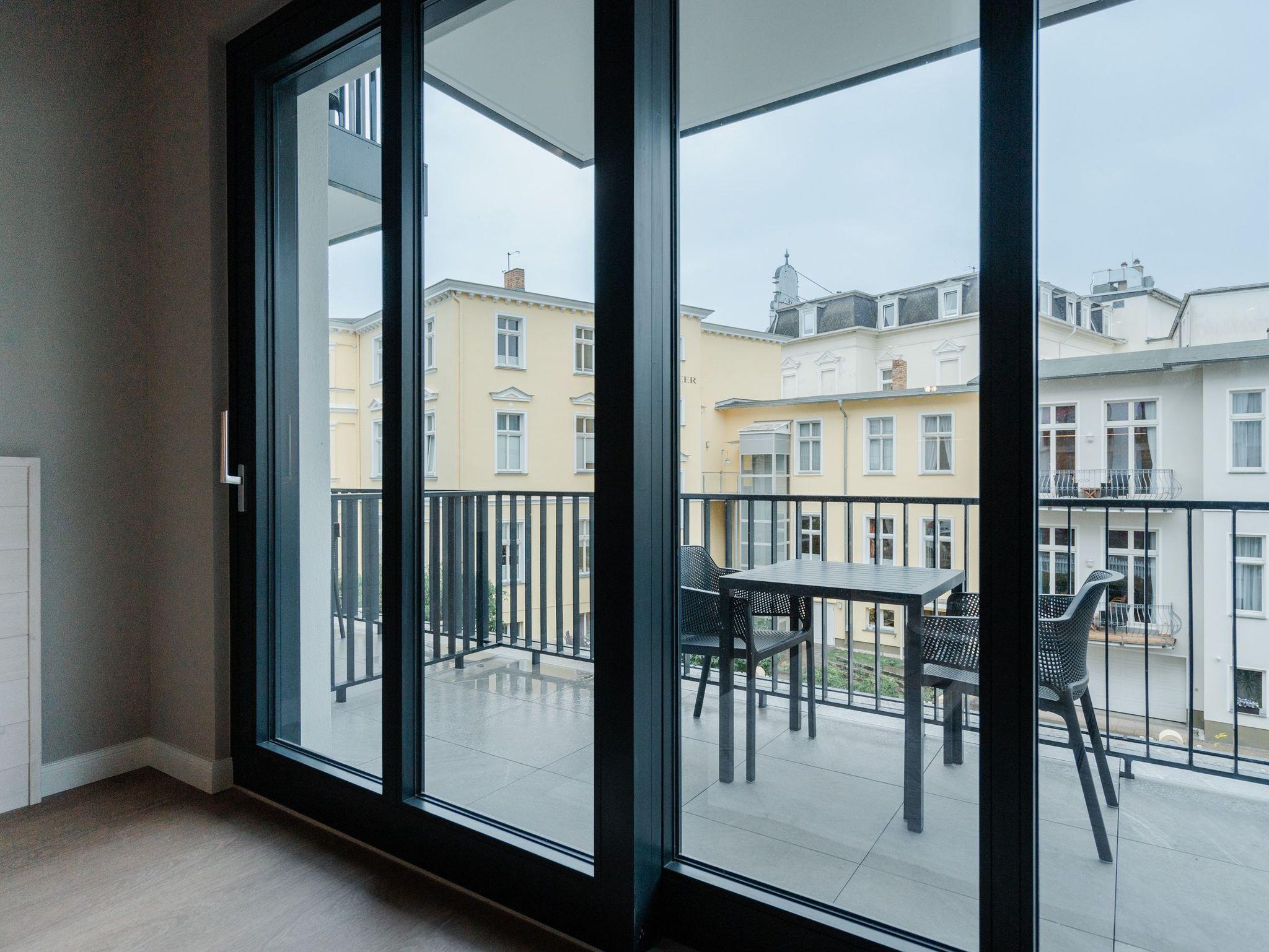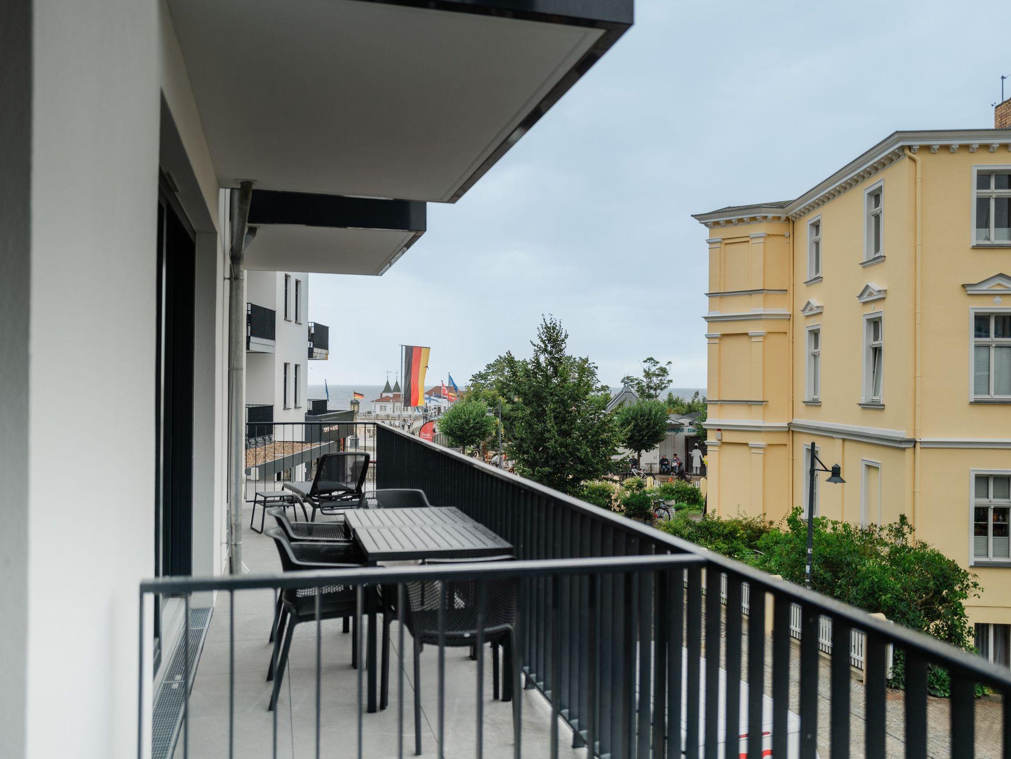 Die 2024 fertig gestellte Strandterrasse liegt direkt an der belebten Strandpromenade und bietet einen einzigartigen Ausblick auf die Grand Dame der historischen Seebrücken sowie die historische Konzertmuschel, einem beliebten Treffpunkt für Kunst und Kultur. Dahinter liegt die Ostsee ? ein Panorama, das zu den schönsten in den Kaiserbädern gehört. Es ist wie das Abtauchen in eine andere Zeit. In eine Zeit, in der man mit Stock, Sonnenschirm und Hut fürs ?Sehen und gesehen werden? über die Promenade schlenderte; aber auch in eine Zeit, in der ? damals wie heute ? Zeit einmal für eine kurze Weile keine Rolle spielt. Weil man angekommen ist im Loslassen, Entspannen und Genießen. Es ist dieser besondere Geruch nach Meeresluft und Freiheit, der in Erinnerung bleibt. Dazu die Bilder, die man mitnimmt. Von langen Strandspaziergängen, vom Lachen in fröhlich schäumenden Ostseewellen, von der Zeit in einem wunderschönen Urlaubsdomizil. Denn genau das ist die Strandterrasse mit ihren 56 modernen und exklusiven Ferienappartements direkt gegenüber der Ahlbecker Seebrücke. Die Ein-, Zwei- oder Dreizimmerwohnungen ? zwischen 40 und 70 Quadratmeter groß ? sind von einer Innenarchitektin gemeinsam mit unserem Erfahrungsschatz an Gästewünschen mit viel Liebe zum Detail und ganz individuell konzipiert worden. Entspannung und Wohlfühlen stehen an erster Stelle. Alles ist aufeinander abgestimmt und sorgt für eine gemütliche Atmosphäre. Wählen Sie zwischen einem Domizil in einem hellen, sandfarbenen Designkonzept oder einem Appartement mit anthrazitfarbenen Farbakzenten. Alle Appartements verfügen gleichermaßen über eine stilvolle und komfortable Einrichtung, die passgenau angefertigt worden ist, sowie über moderne Küchen und Bäder. Jedem Schlafzimmer ist ein eigenes Bad mit Dusche zugeordnet (außer App. B4.5). Die Appartements besitzen fast alle einen Balkon ? viele schauen sogar zur Ostsee hinaus. Die meisten Feriendomizile haben einen Elektrokamin und Infrarotsaunen. Im Erdgeschoss befindet sich ein separater Gemeinschaftsraum für Fahrräder. Außerdem besteht die Möglichkeit, im Gemeinschaftswaschraum 2 Waschmaschinen [&] Trockner zu nutzen. Ergänzt wird das Angebot durch eine Gemeinschaftssauna, die täglich von 11:00 bis 22:00 Uhr nutzbar ist. In der Tiefgarage (Einfahrtshöhe 2,03 Meter) steht für jede Wohnung 1 Pkw-Stellplatz zur Verfügung. Ist alles zur Zufriedenheit untergebracht? Dann kann der Urlaub ja beginnen. Und beim Blick vom Balkon über die Ostsee treffen sich zum Sonnenaufgang das Heute und das Damals. Gelassenheit legt sich beim Gang hinunter an den Strand auf die Seele. Jetzt darf die Zeit stehenbleiben.