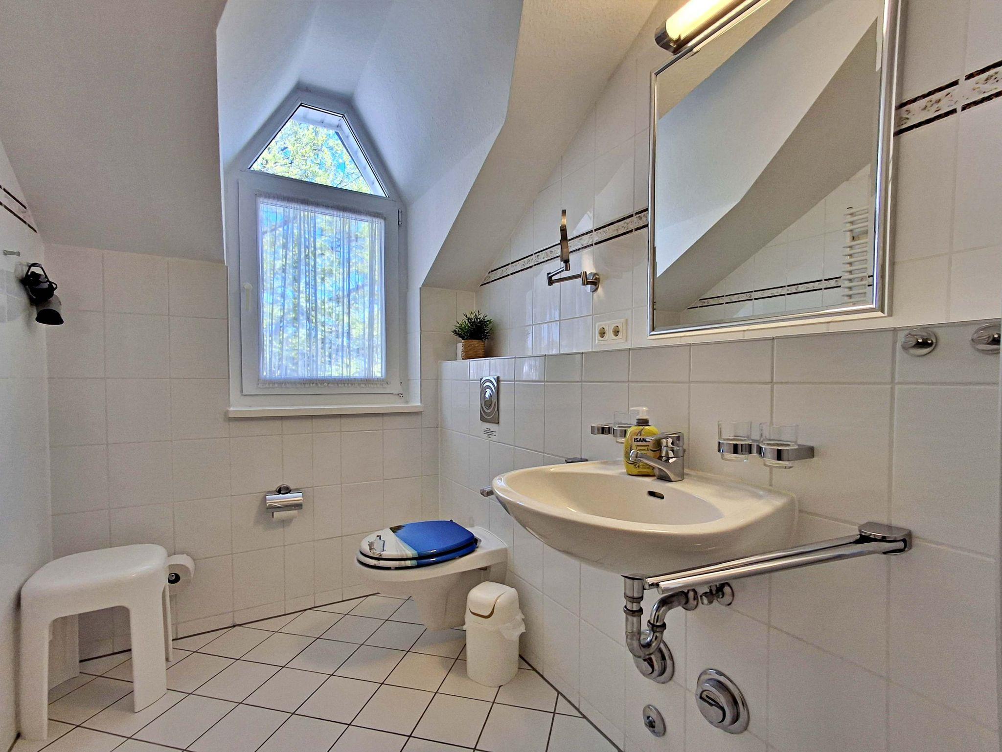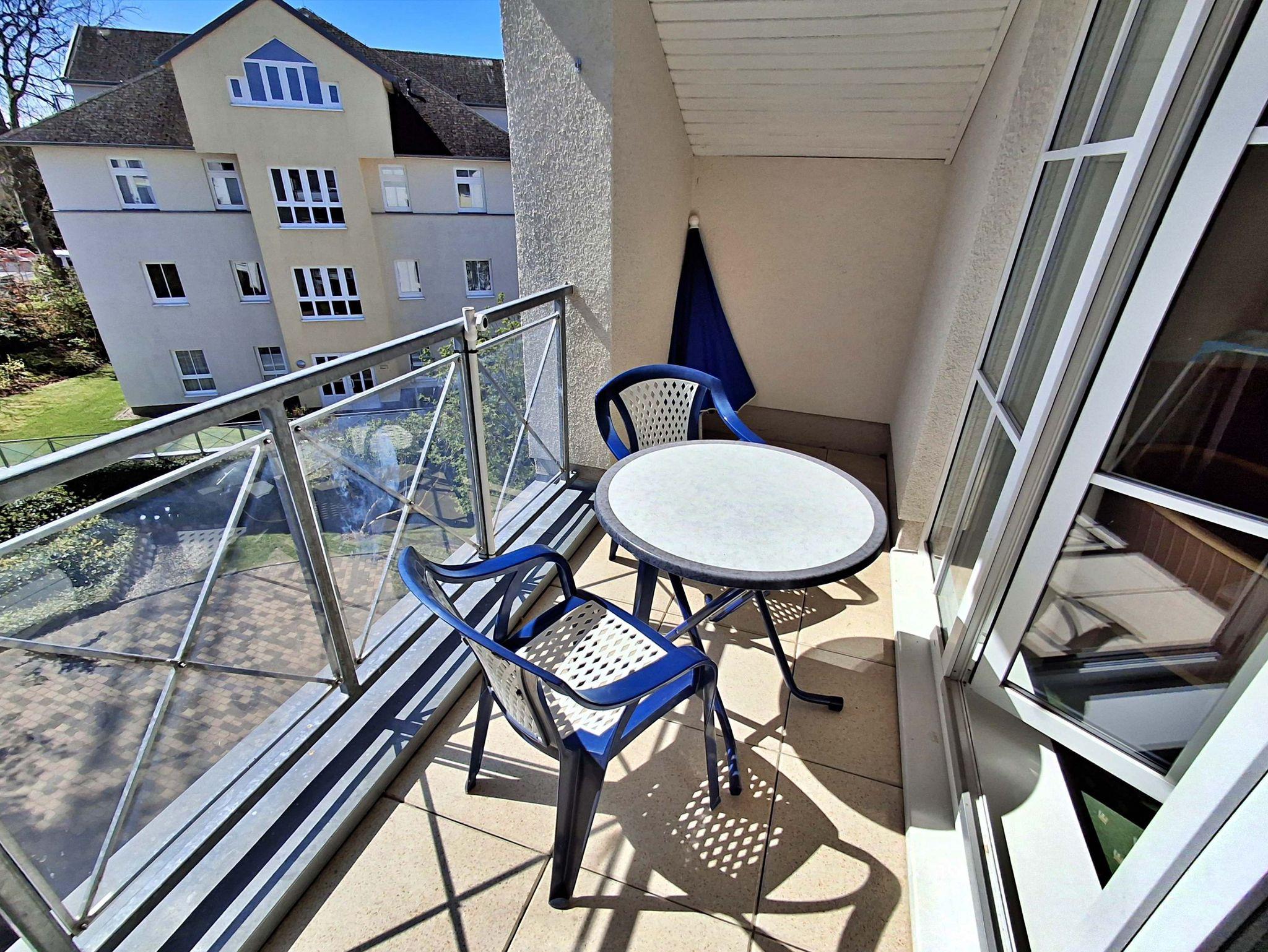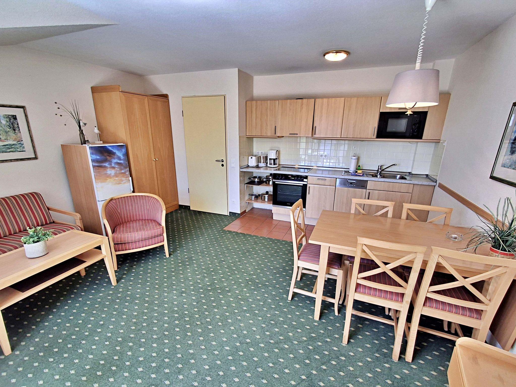 Die 68 qm große 3-Raum-Ferienwohnung (Süd-Ost-Seite) befindet sich im 3. OG der Appartementanlage und ist für 5 Personen (4 Erwachsene und ein Kind bis 10 Jahre) ausgestattet. Der Aufzug fährt bis zum 2. OG. Die Wohnung befindet sich in der 3. Etage. Der Aufzug fährt bis zum 2.OG. Die Wohnung verfügt über ein Wohnzimmer mit Sofa, Sessel sowie Esstisch mit 4 Stühlen. Für die Unterhaltung sorgen ein Flachbild-TV, eine Stereo-Anlage und DVD-Player. Die vollständig ausgestattete Küchenzeile mit Ceranherd, Backofen, Mikrowelle, Spülmaschine und Kühlschrank mit Gefrierfach lässt keine Wünsche offen. Im ersten Schlafzimmer befindet sich ein Doppelbett und im zweiten Schlafzimmer zwei Einzelbetten. Das Tageslicht-Bad ist mit Dusche/WC und Haarfön ausgestattet. Eine Loggia lädt zum Sitzen und Verweilen ein und komplettiert die Ausstattung der Wohnung. WLAN steht in der gesamten Wohnung kostenfrei zur Verfügung.