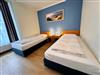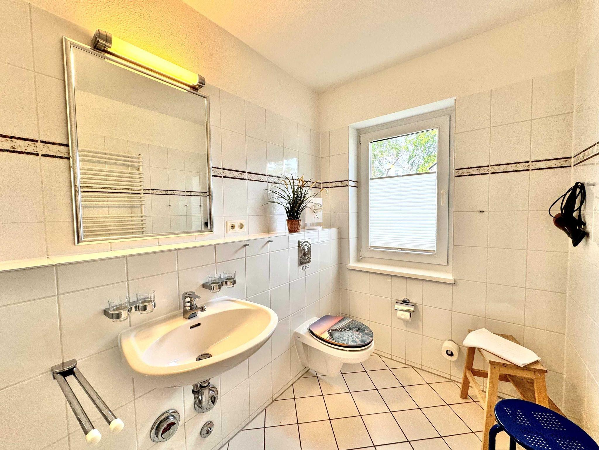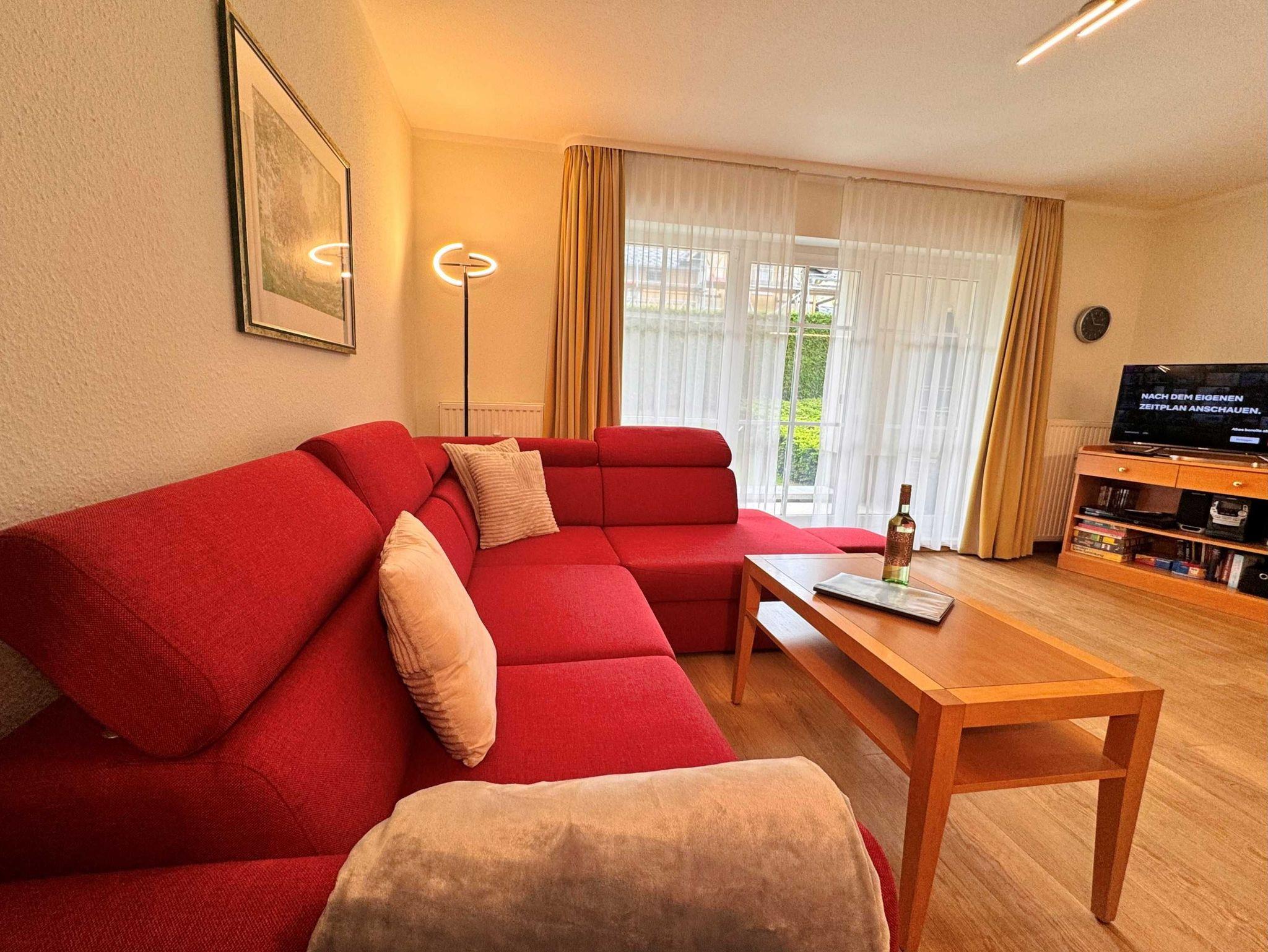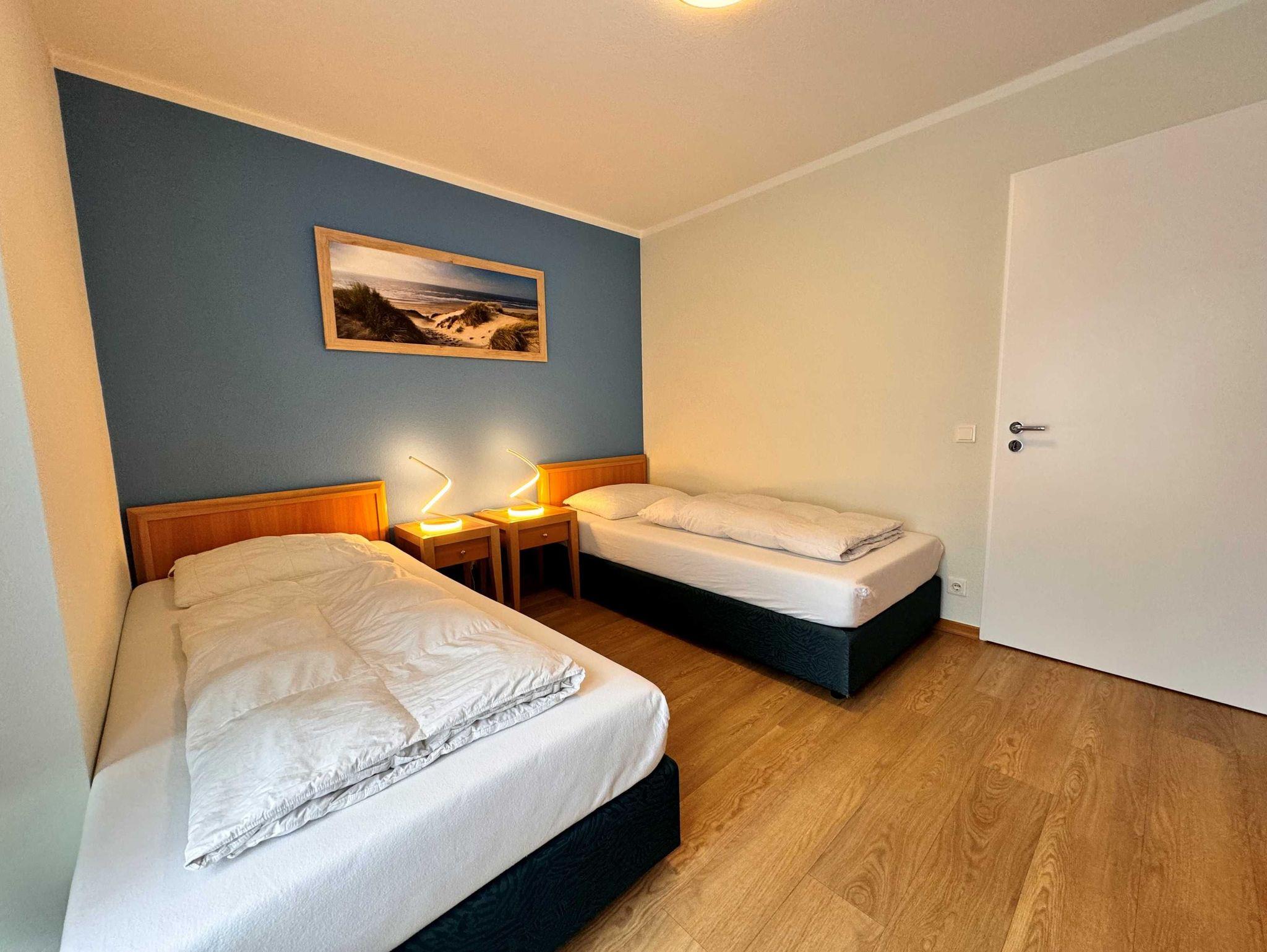 Diese 68 qm große 3-Raum-Ferienwohnung befindet sich im Erdgeschoss der Appartementanlage und ist für 4 Personen ausgestattet. Die Wohnung verfügt über ein Wohnzimmer mit bequemer Couch und einer Essecke mit Stühlen. Für die Unterhaltung sorgen ein Flachbild-TV, Stereo-Anlage und DVD-Player. Die vollständig ausgestattete Küchenzeile mit Ceranherd, Backofen, Mikrowelle, Spülmaschine und Kühlschrank mit Gefrierfach lassen keine Wünsche offen. Im ersten Schlafzimmer befindet sich ein Doppelbett und Flachbild-TV und im zweiten Schlafzimmer befinden sich zwei Einzelbetten sowie ein weiterer Flachbild-TV. Das Tageslicht-Bad ist mit Dusche/WC und Haarfön ausgestattet. Eine Loggia lädt zum Sitzen und Verweilen ein. WLAN steht in der gesamten Wohnung kostenfrei zur Verfügung. Ein Kinderbett mit Wäsche sowie ein Hochstuhl können auf Anfrage gegen eine Gebühr von einmalig 50 € vom Verwalter zur Verfügung gestellt werden.