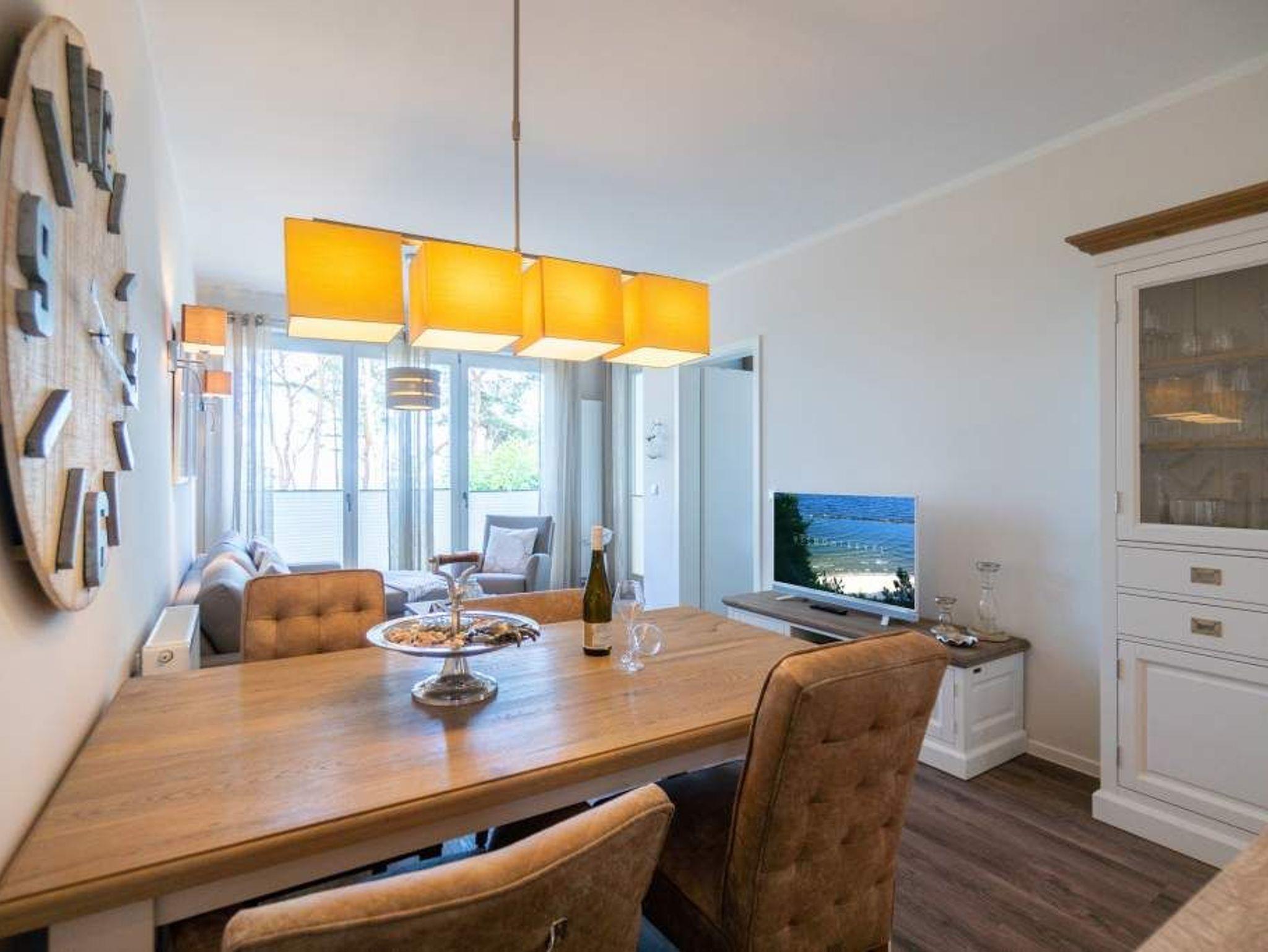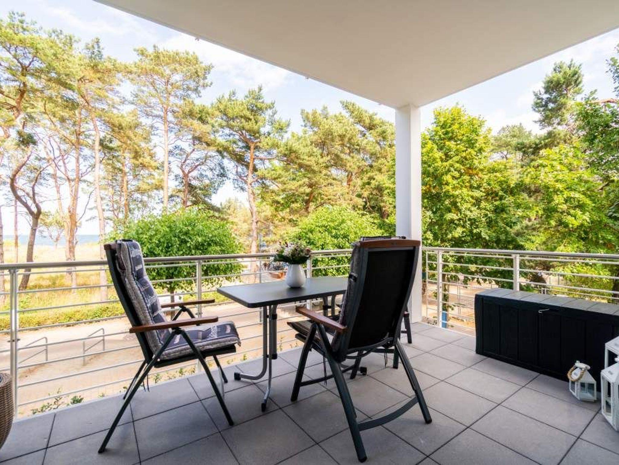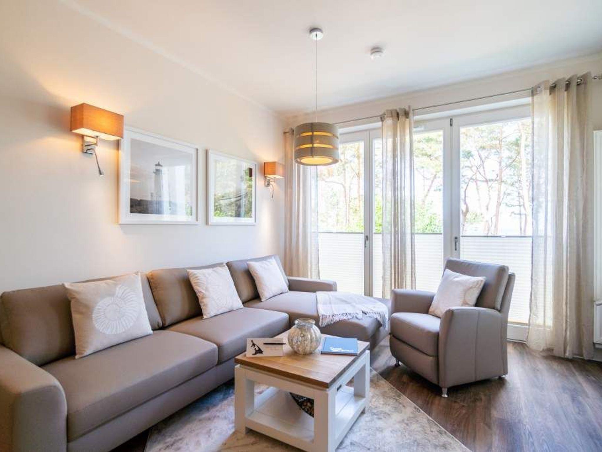 Strandresidenz ? der Name des Hauses ist Programm. Der feine, weiße Ostseestrand ist so dicht, dass Sie das Meer in Ihrem Urlaubsdomizil riechen, hören und sehen können. Und das fast aus der gesamten Wohnung. Es gibt nichts Entspannenderes als vom sanften Rauschen der Wellen in den Schlaf getragen zu werden und des Morgens davon wieder geweckt zu werden. Vor allem, wenn man direkt nach dem Aufstehen auf den Balkon hinaustritt und die Nähe der Ostsee unmittelbar spüren kann. Das 65 Quadratmeter große Appartement in der ersten Etage, das bis zu drei Erwachsenen (keine Kleinkinder) Platz bietet, ist hell und modern eingerichtet. Stilvolle Möbel sorgen für eine Wohlfühlatmosphäre. Das offene Wohn-Esszimmer mit Echtleder-Sofa lädt zum Relaxen vor dem Flat-TV ein. Die Küchenzeile ist mit hochwertigen Geräten wie Herd, Backofen, Kühlschrank mit Gefriermöglichkeit, Spülmaschine und Mikrowelle ausgestattet. Geschirr finden Sie in den Schränken. Am schönen Essplatz mit Tisch und Stühlen lässt es sich nicht nur wunderbar dinieren. Plaudern, spielen, diskutieren ? er ist ein Garant für gemütliche Stunden. Die Wohnung verfügt über zwei Schlafzimmer. Eines besitzt ein komfortables Boxspringdoppelbett (1,80 m x 2,00 m), einen Flat-TV und einen großen Kleiderschrank. Im zweiten Zimmer stehen ein Einzelbett (1,00 m x 2,00 m) und ebenfalls ein Flat-TV. Außerdem bietet auch hier ein Schrank genügend Ablagefläche. Für kleine Schreibtätigkeiten steht in diesem Schlafzimmer auch ein Schreibtisch zur Verfügung. Das Badezimmer ist modern gestaltet und mit Regen-Dusche, Waschtisch und WC ausgestattet. Für den rundum sorglosen Urlaubskomfort sind die Betten bezogen und Handtücher liegen für Sie bereit. Zum Appartement gehört ein Tiefgaragenstellplatz. Tiefgarage mit Doppelparker, Fahrzeughöhe max. 1,90 m