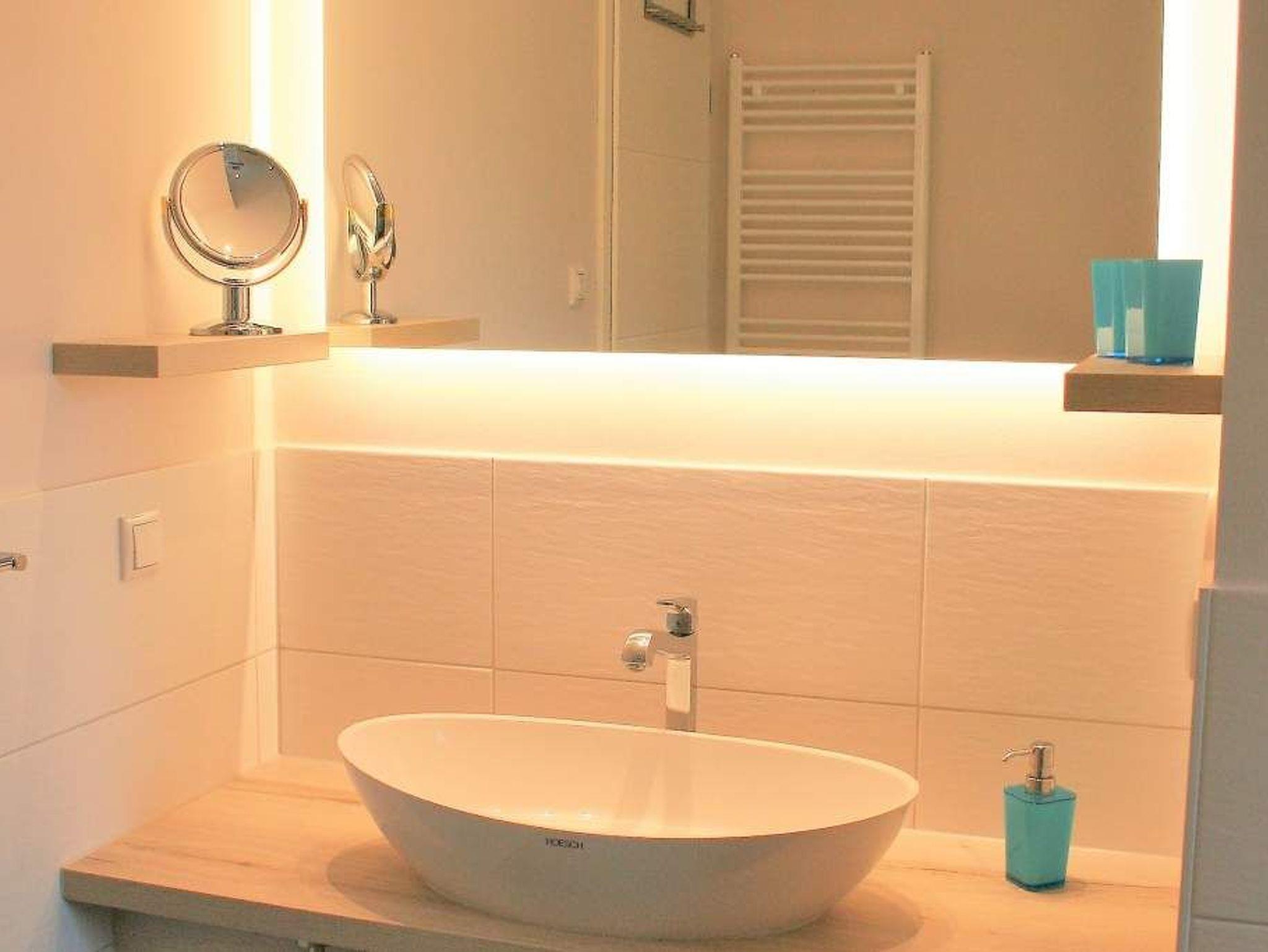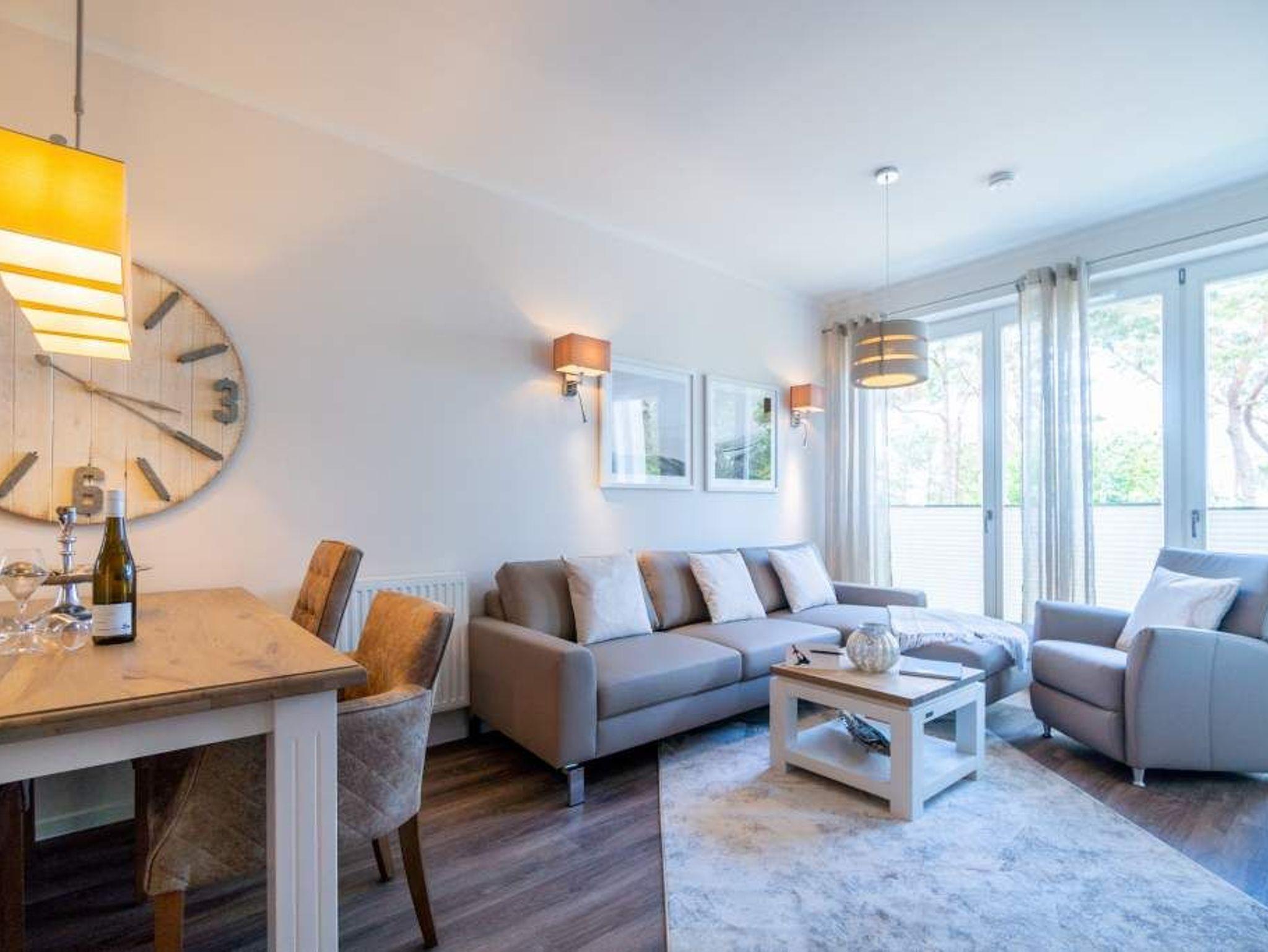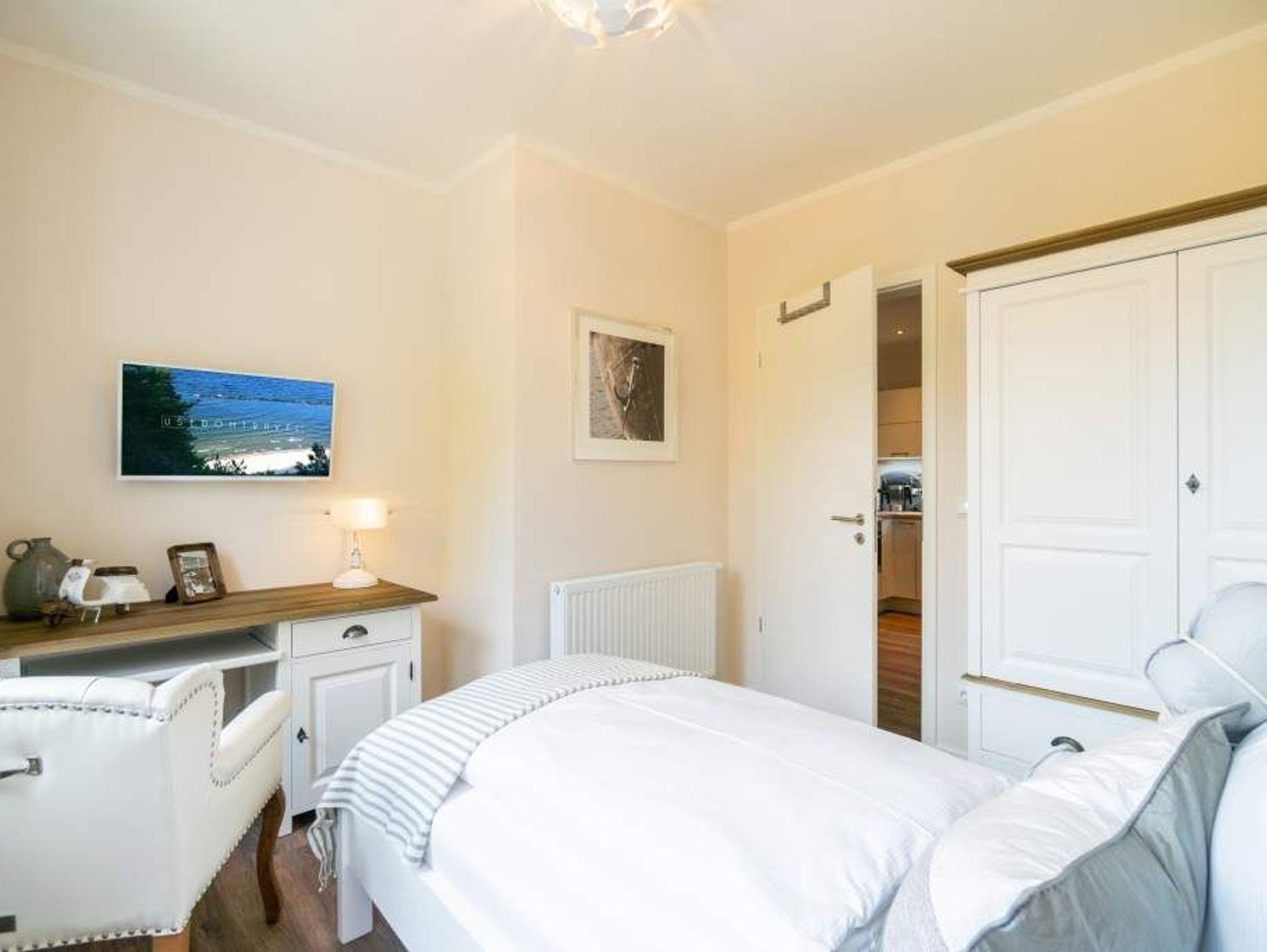Strandresidenz ? der Name des Hauses ist Programm. Der feine, weiße Ostseestrand ist so dicht, dass Sie das Meer in Ihrem Urlaubsdomizil riechen, hören und sehen können. Und das fast aus der gesamten Wohnung. Es gibt nichts Entspannenderes als vom sanften Rauschen der Wellen in den Schlaf getragen zu werden und des Morgens davon wieder geweckt zu werden. Vor allem, wenn man direkt nach dem Aufstehen auf den Balkon hinaustritt und die Nähe der Ostsee unmittelbar spüren kann. Das 65 Quadratmeter große Appartement in der ersten Etage, das bis zu drei Erwachsenen (keine Kleinkinder) Platz bietet, ist hell und modern eingerichtet. Stilvolle Möbel sorgen für eine Wohlfühlatmosphäre. Das offene Wohn-Esszimmer mit Echtleder-Sofa lädt zum Relaxen vor dem Flat-TV ein. Die Küchenzeile ist mit hochwertigen Geräten wie Herd, Backofen, Kühlschrank mit Gefriermöglichkeit, Spülmaschine und Mikrowelle ausgestattet. Geschirr finden Sie in den Schränken. Am schönen Essplatz mit Tisch und Stühlen lässt es sich nicht nur wunderbar dinieren. Plaudern, spielen, diskutieren ? er ist ein Garant für gemütliche Stunden. Die Wohnung verfügt über zwei Schlafzimmer. Eines besitzt ein komfortables Boxspringdoppelbett (1,80 m x 2,00 m), einen Flat-TV und einen großen Kleiderschrank. Im zweiten Zimmer stehen ein Einzelbett (1,00 m x 2,00 m) und ebenfalls ein Flat-TV. Außerdem bietet auch hier ein Schrank genügend Ablagefläche. Für kleine Schreibtätigkeiten steht in diesem Schlafzimmer auch ein Schreibtisch zur Verfügung. Das Badezimmer ist modern gestaltet und mit Regen-Dusche, Waschtisch und WC ausgestattet. Für den rundum sorglosen Urlaubskomfort sind die Betten bezogen und Handtücher liegen für Sie bereit. Zum Appartement gehört ein Tiefgaragenstellplatz. Tiefgarage mit Doppelparker, Fahrzeughöhe max. 1,90 m