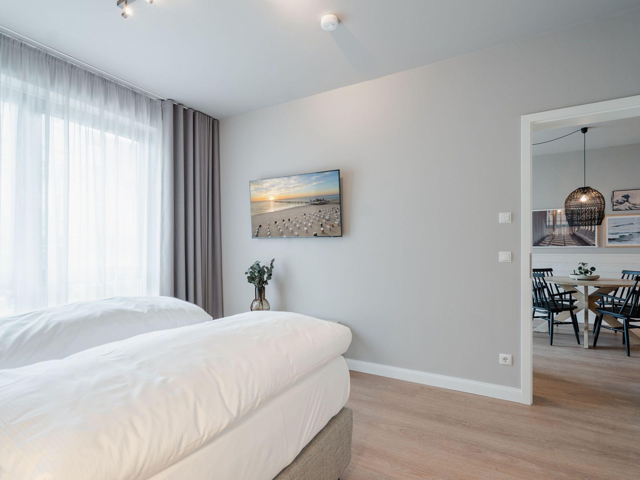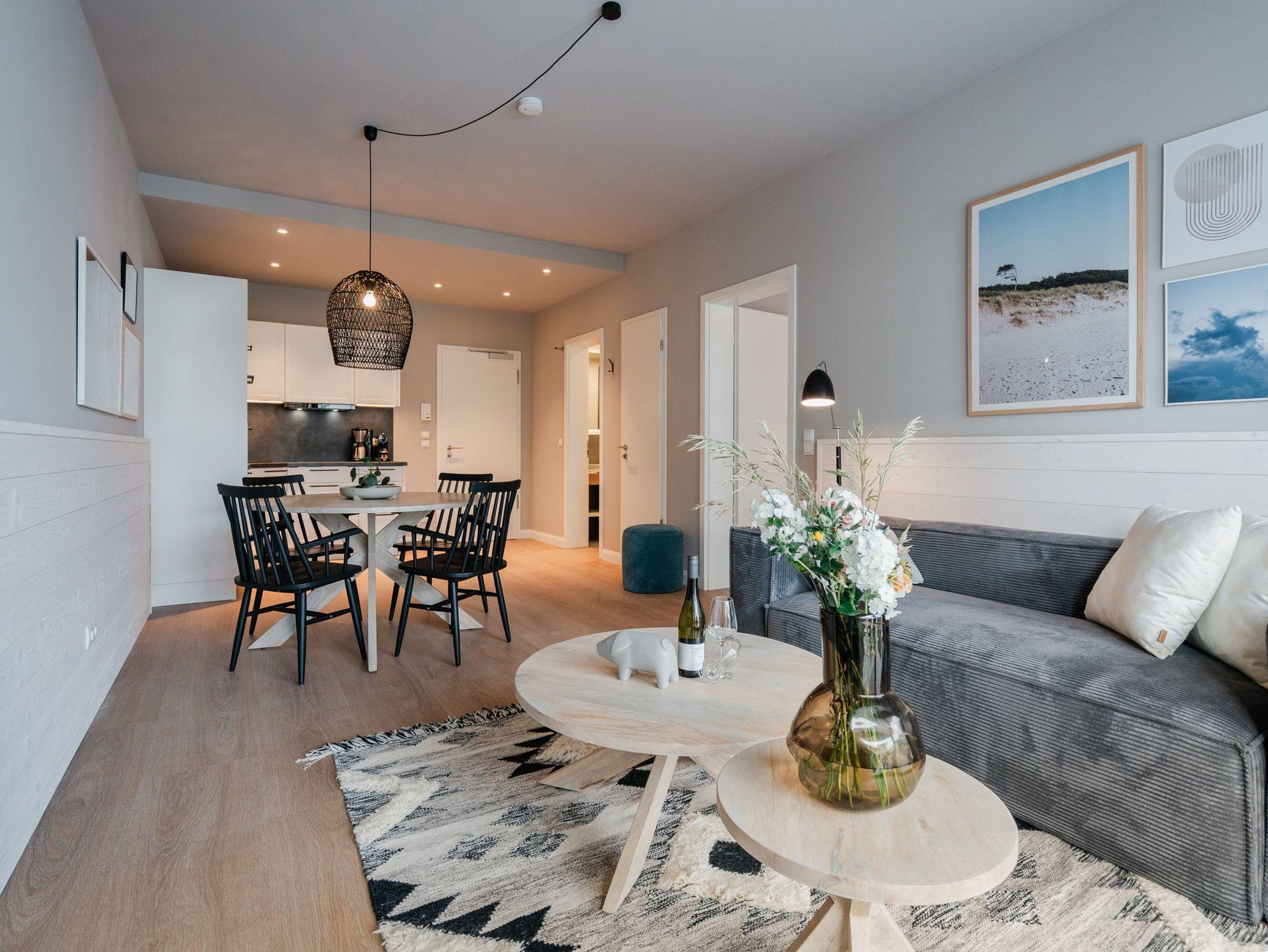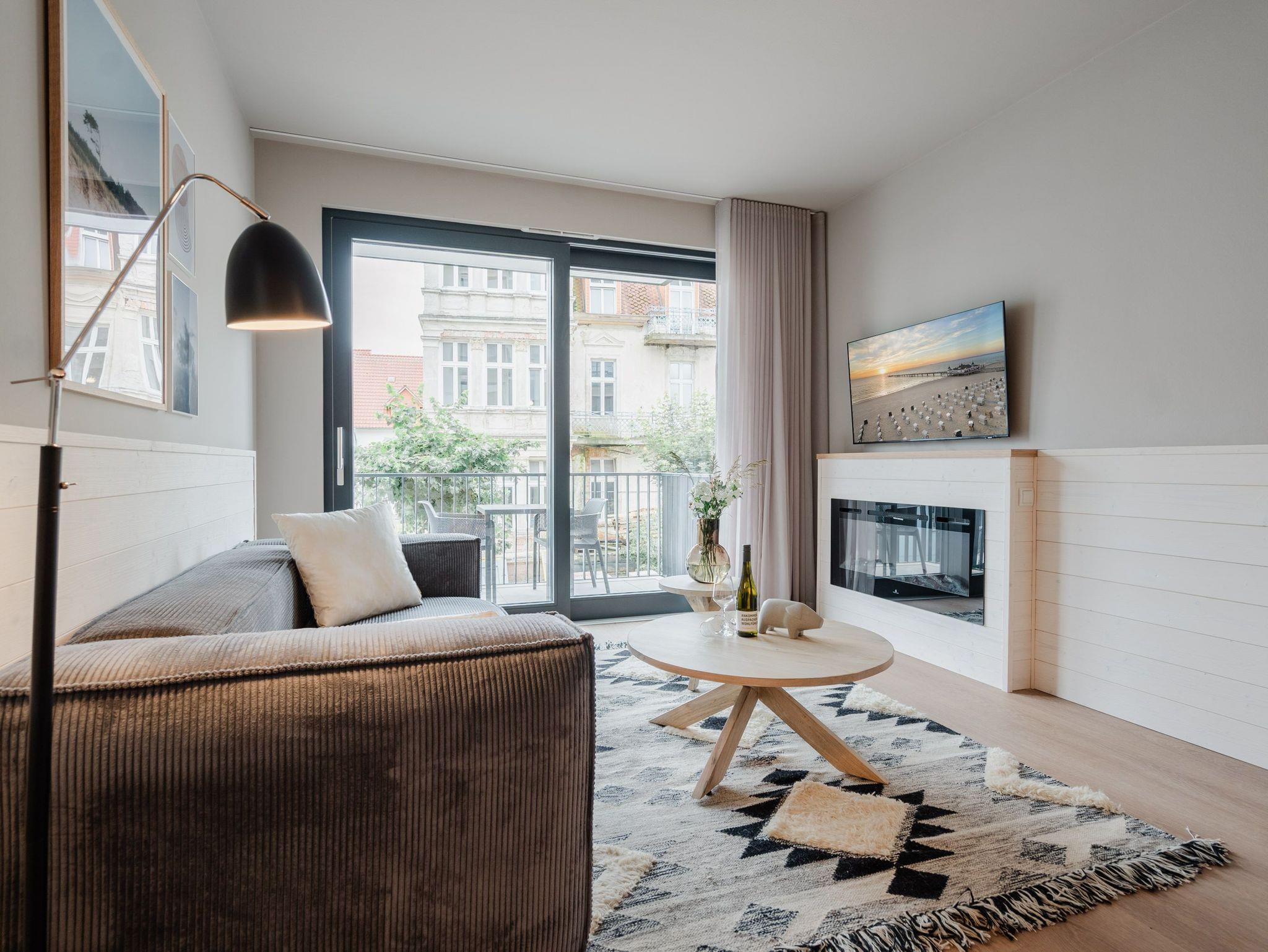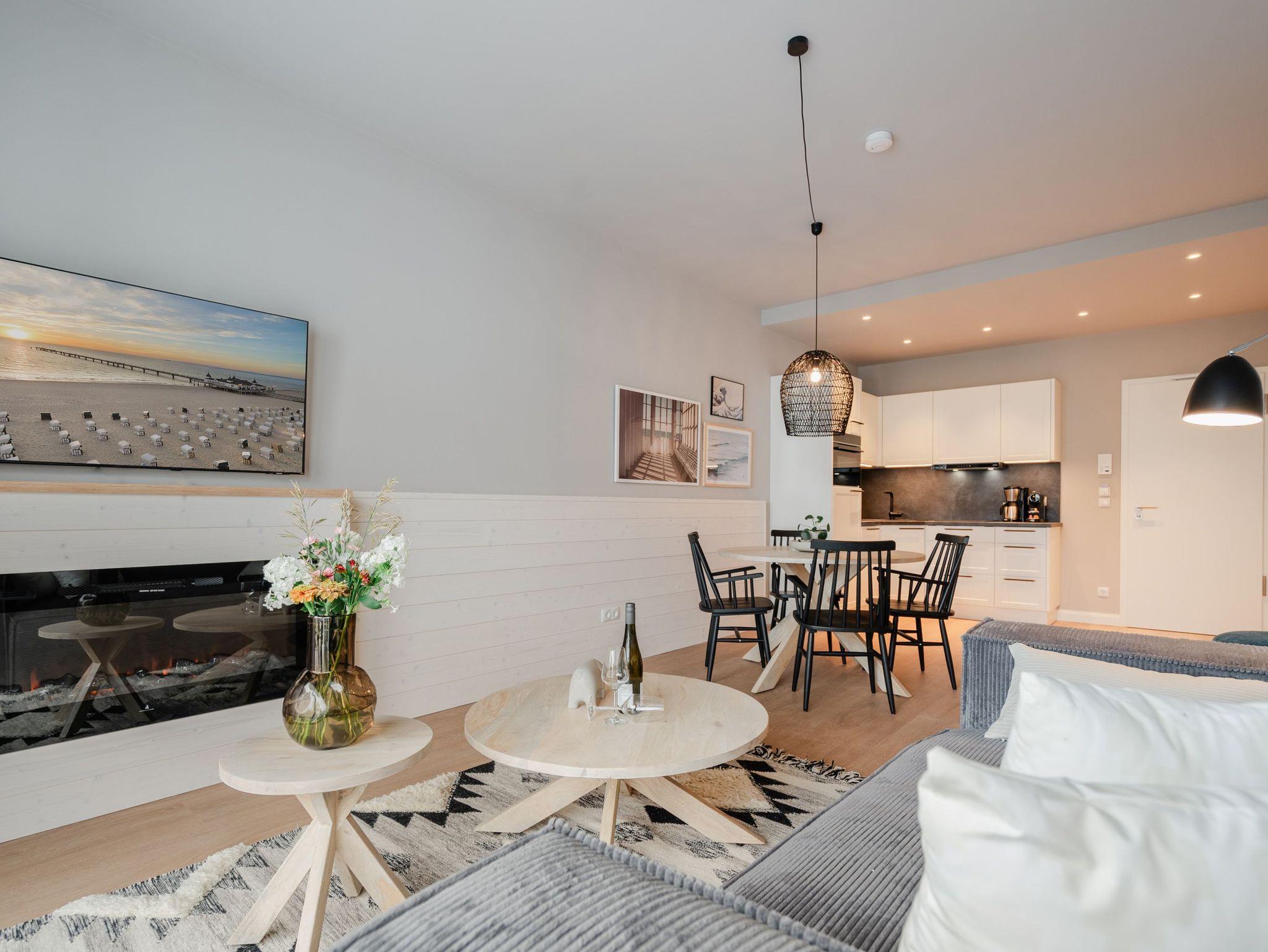 Willkommen im 2-Raum-Appartement B 1.6 im Haus B der Strandterrasse ? in Ihrem gemütlichen und komfortablen Urlaubsreich auf Zeit. Die Ferienwohnung in der 1. Etage ist mit ihren 53 Quadratmetern ideal für 2 Personen. Ein stilvolles Wohn-Esszimmer bietet Ihnen alle Annehmlichkeiten für eine traumhafte Auszeit am Meer, das nur knapp 80 Meter von Ihrer Unterkunft entfernt ist. Von dem kleinen Süd-West-Balkon mit Gartentisch und zwei Stühlen können Sie die Wellen rauschen hören und dabei den Anblick der schönen Bädervillen des Ortes genießen. Das Innere Ihres Domizils wartet mit viel Gemütlichkeit und einem wundervollen Designkonzept auf. Ein kuscheliges Sofa lädt zum Faulenzen vor dem Elektrokamin (ohne Wärmeabgabe) ein. Ein großer Flat-TV (50 Zoll) sorgt für Unterhaltung. In der offenen Küche können Sie alles für leckere Abendessen oder Frühstücke zubereiten. Die Elektrogeräte wie der Backofen, der 3-Platten-Induktionsherd, die Geschirrspülmaschine und die Nespresso-Kapselmaschine sind hochwertige Helferlein. Der große Esstisch bietet Platz für ausgiebige Gerichte oder ausufernde Brettspiele. Verbringen Sie erholsame Stunden im komfortablen Boxspringdoppelbett (1,80m x 2,00m) im Schlafzimmer. Hier finden Sie zudem einen geräumigen Kleiderschrank und einen zweiten 50 Zoll Flat-TV. Das moderne Duschbad ist mit einem Waschtisch, einer Infrarotsaunakabine und einem WC ausgestattet. Wir wünschen Ihnen viel Freude in dieser kleinen Wellnessoase. Ein PKW-Stellplatz in der Tiefgarage sorgt für bequemes Parken. Es ist also alles bereit für Ihre entspannende Auszeit an der Ostsee.