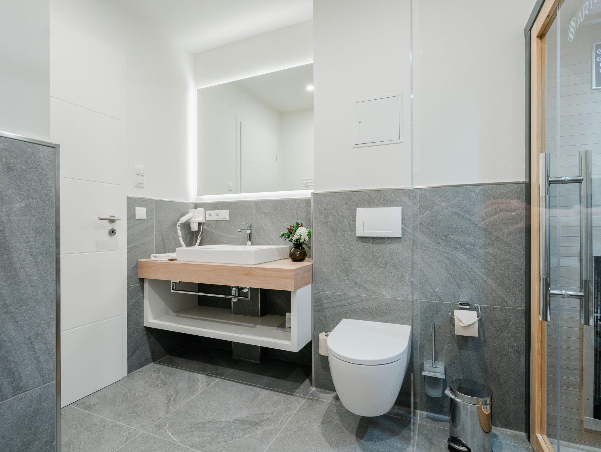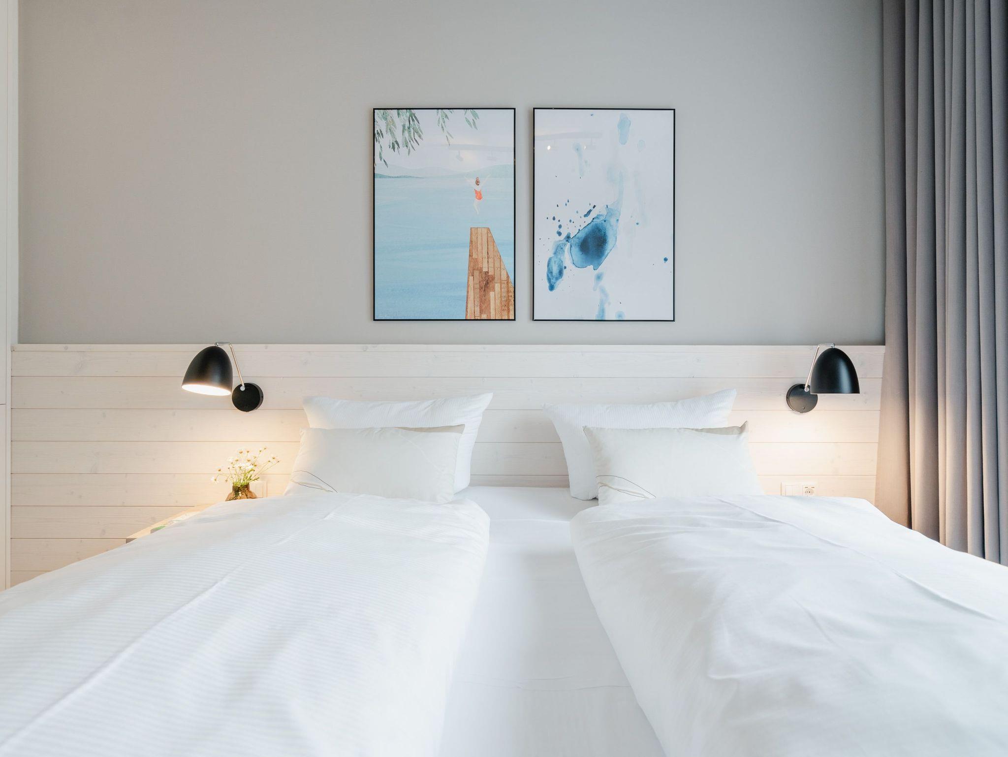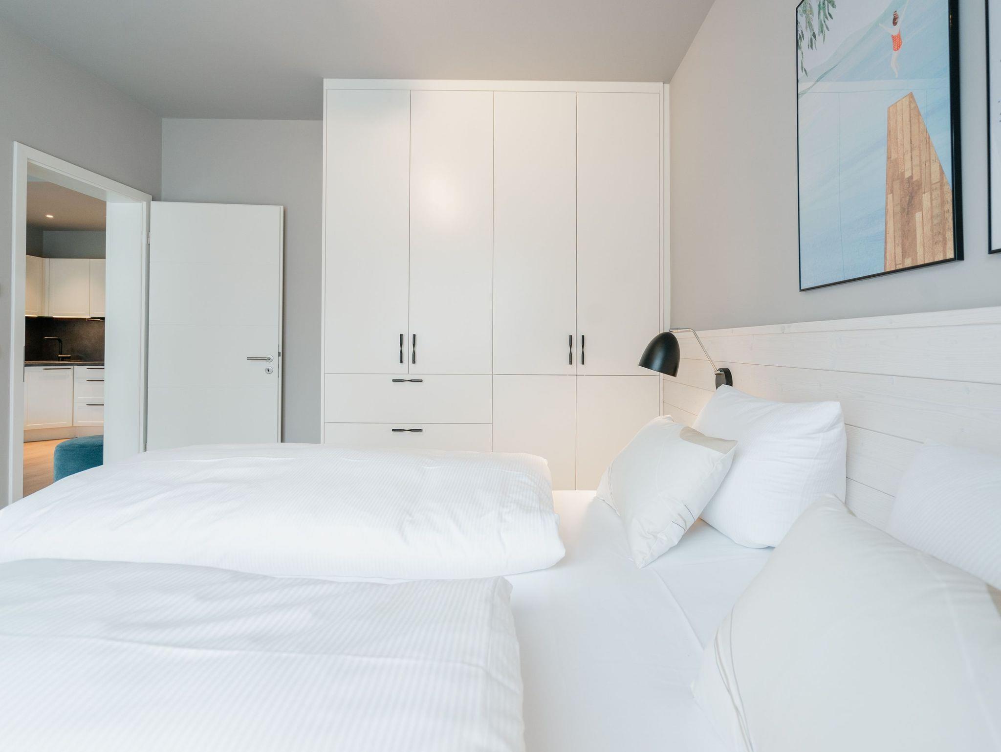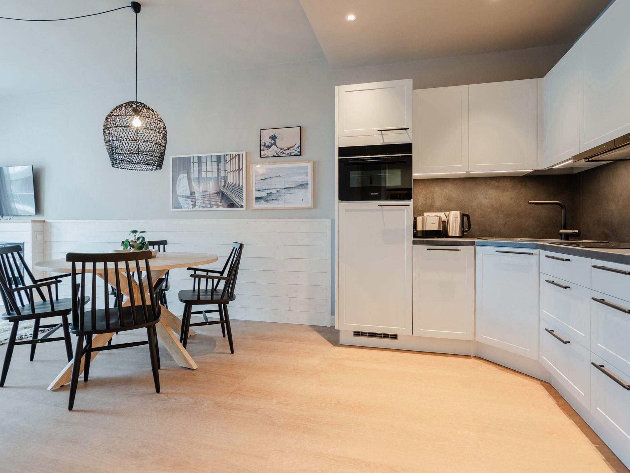 Willkommen im 2-Raum-Appartement B 1.6 im Haus B der Strandterrasse ? in Ihrem gemütlichen und komfortablen Urlaubsreich auf Zeit. Die Ferienwohnung in der 1. Etage ist mit ihren 53 Quadratmetern ideal für 2 Personen. Ein stilvolles Wohn-Esszimmer bietet Ihnen alle Annehmlichkeiten für eine traumhafte Auszeit am Meer, das nur knapp 80 Meter von Ihrer Unterkunft entfernt ist. Von dem kleinen Süd-West-Balkon mit Gartentisch und zwei Stühlen können Sie die Wellen rauschen hören und dabei den Anblick der schönen Bädervillen des Ortes genießen. Das Innere Ihres Domizils wartet mit viel Gemütlichkeit und einem wundervollen Designkonzept auf. Ein kuscheliges Sofa lädt zum Faulenzen vor dem Elektrokamin (ohne Wärmeabgabe) ein. Ein großer Flat-TV (50 Zoll) sorgt für Unterhaltung. In der offenen Küche können Sie alles für leckere Abendessen oder Frühstücke zubereiten. Die Elektrogeräte wie der Backofen, der 3-Platten-Induktionsherd, die Geschirrspülmaschine und die Nespresso-Kapselmaschine sind hochwertige Helferlein. Der große Esstisch bietet Platz für ausgiebige Gerichte oder ausufernde Brettspiele. Verbringen Sie erholsame Stunden im komfortablen Boxspringdoppelbett (1,80m x 2,00m) im Schlafzimmer. Hier finden Sie zudem einen geräumigen Kleiderschrank und einen zweiten 50 Zoll Flat-TV. Das moderne Duschbad ist mit einem Waschtisch, einer Infrarotsaunakabine und einem WC ausgestattet. Wir wünschen Ihnen viel Freude in dieser kleinen Wellnessoase. Ein PKW-Stellplatz in der Tiefgarage sorgt für bequemes Parken. Es ist also alles bereit für Ihre entspannende Auszeit an der Ostsee.