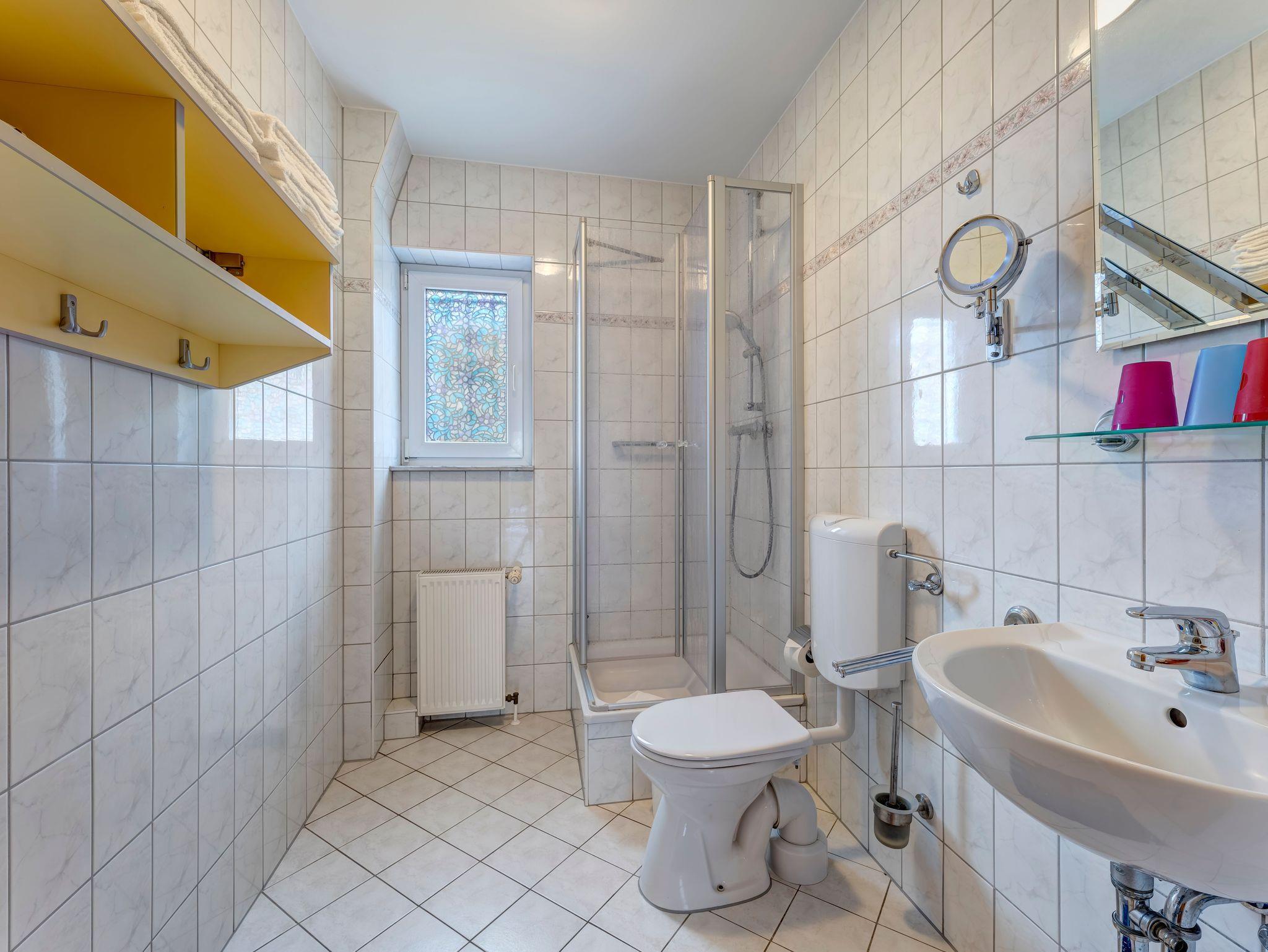Die gemütliche und komfortable Nichtraucher-Ferienwohnung ist ca. 72m² groß und befindet sich aufgrund der Hangbauweise im Parterre und Tiefparterre. Das großzügige Wohnzimmer verfügt über eine gemütliche Couch, einen Fernseher, Radio und einer offenen und vollausgestatten Küchenzeile mit Spülmaschine, 4-Platten-Ceranherd/Backofen, Kühlschrank/Gefrierfach, Mikrowelle, Kaffeemaschine, Toaster, Wasser- und Eierkocher. Die beiden Schlafzimmer sind mit je einem Doppelbett ausgestattet, eines davon mit einer zusätzlichen Einzelschlafliege. Das Badezimmer verfügt über eine Dusche und über einen beleuchteten Kosmetikspiegel. Kinderbett und ein Hochstuhl können bereitgestellt werden. Nutzen Sie auch den schönen Außenbereich im Grünen mit Gartenmöbeln und Grill. Die Erstausstattung Bettwäsche und Handtücher sind bereits im Preis enthalten. Die Ferienwohnung verfügt über Internetzugang via W-LAN ist kostenfrei nutzbar. Zu der Wohnung gehören 2 Terrassen, sowie zwei Parkplätze direkt an einer der beiden Terrassen. Zusätzlich ist ein Safe für Ihre Wertsachen in der Wohnung vorhanden. Die Wohnung erreichen Sie barrierefrei vom Parkplatz aus über eine Rampe von der Terrasse.