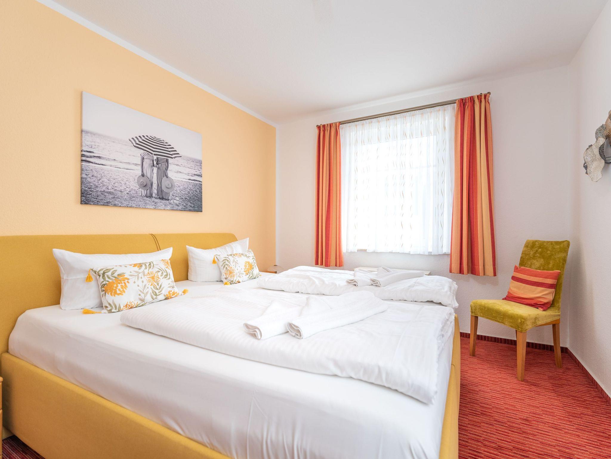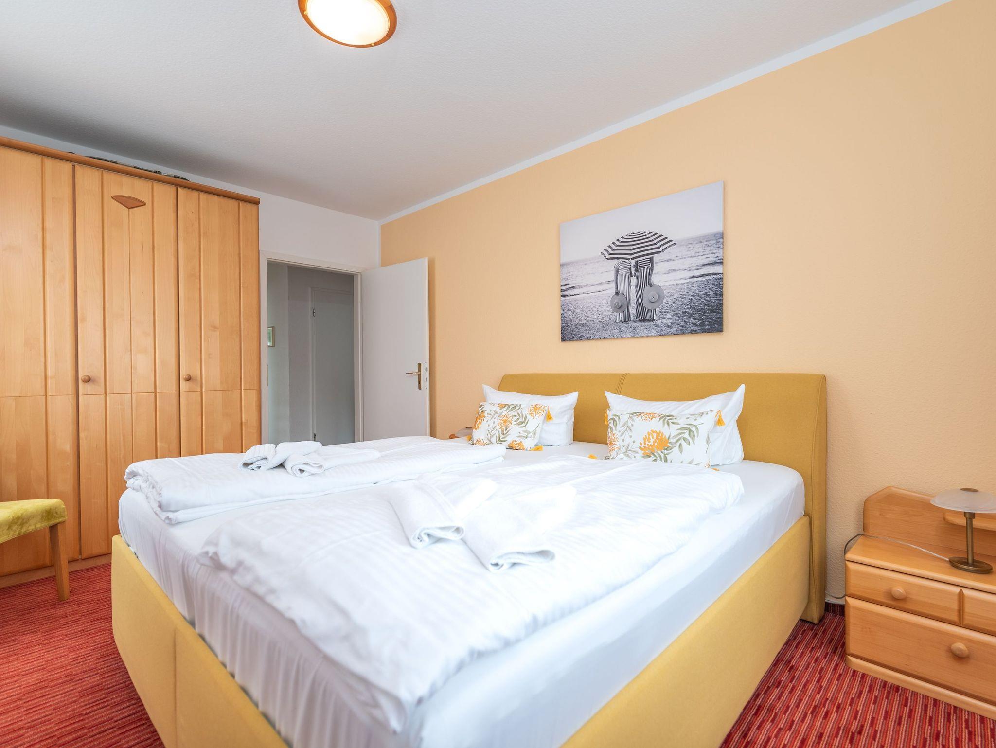 • Schlafzimmer: Ein Ruhepol mit komfortablem Doppelbett und großem Kleiderschrank, der ausreichend Stauraum für Urlaubsgarderobe bereithält.